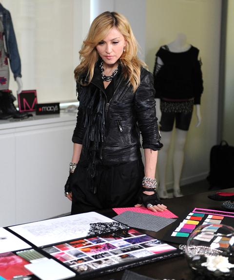 This is Madonna at Macy’s in New York promoting Material Girl, her new fashion line for teens inspired by daughter Lola. As you can see, Madge covered up in a leather jacket and gloves, part for style, certainly, but it also seems that as she ages, she’s becoming more and more reluctant to expose her skin. And she has to be photographed a particular way too. There’s some very flattering light hitting her face in these shots. She looks great. And young-er. And I want that coat.