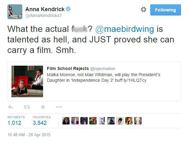 Here’s why this is bullsh*t. Even if this were a legitimate reason not to cast Whitman, which it definitively is not, because she’s an amazing dynamic actress who people love, she’s an actress who people love. With their dollars. The DUFF did big business for a tiny little teen movie, and people were not going to see that movie because of the box office draw that is Bella Thorne. There’s zero indication that the box office of Independence Day 2 would suffer because Mae Whitman isn’t tall or blonde.