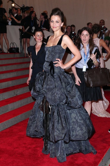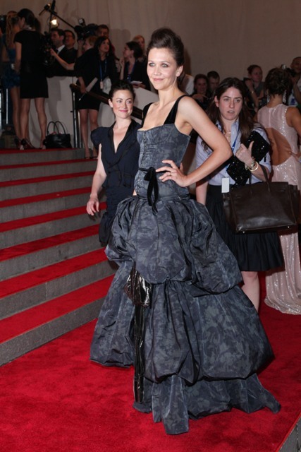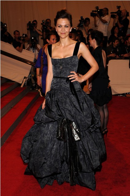 Points for trying something different. And only Maggie G could have pulled it off. But no points for scaring me. Maybe if it was a different colour. But the way it is now, with her face so severe, and the fabric like storm clouds gathered around her legs, like there are spells swirling in those skirts, and that black leather sash an eventual noose for an eventual victim, I imagine that if you were to walk past it would whisper at you, some horrible voice sliding up your neck telling you exactly when and where you’re going to die. This dress is a dark spirit.