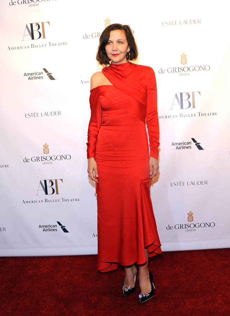 Maggie Gyllenhaal, however, has and can make a red dress work. This one though. Not the shine. It’s the fabric. So that’s two strikes on top of each other: red and satin. To me the satin rarely photographs well, rarely shoots luxuriously.