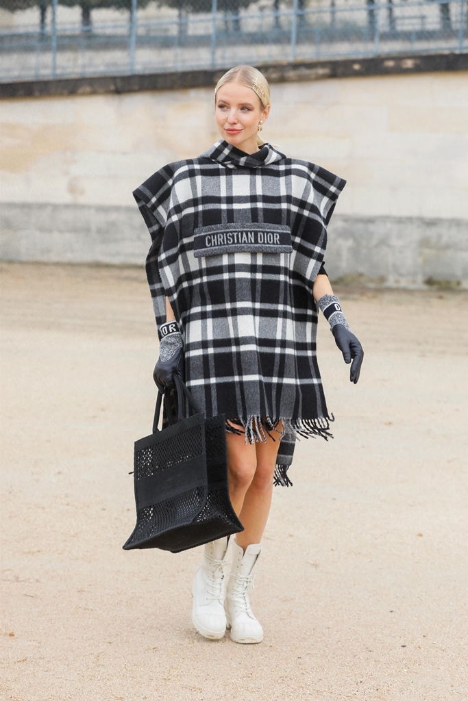 If we’re talking about ponchos with no pants though, Maisie wasn’t the only arrival to the show today throwing down that look. Look at this beautiful black and white piece. I’m obsessed.