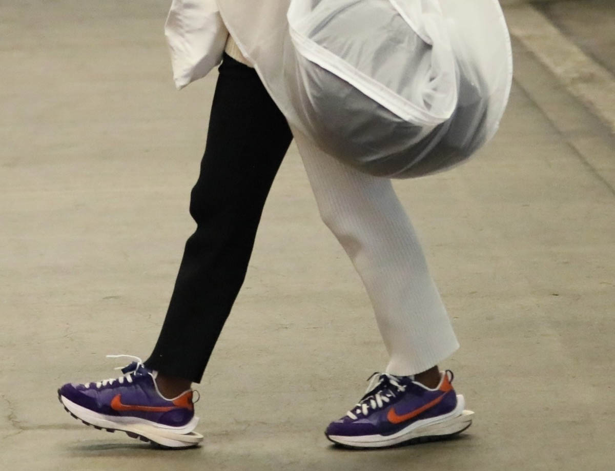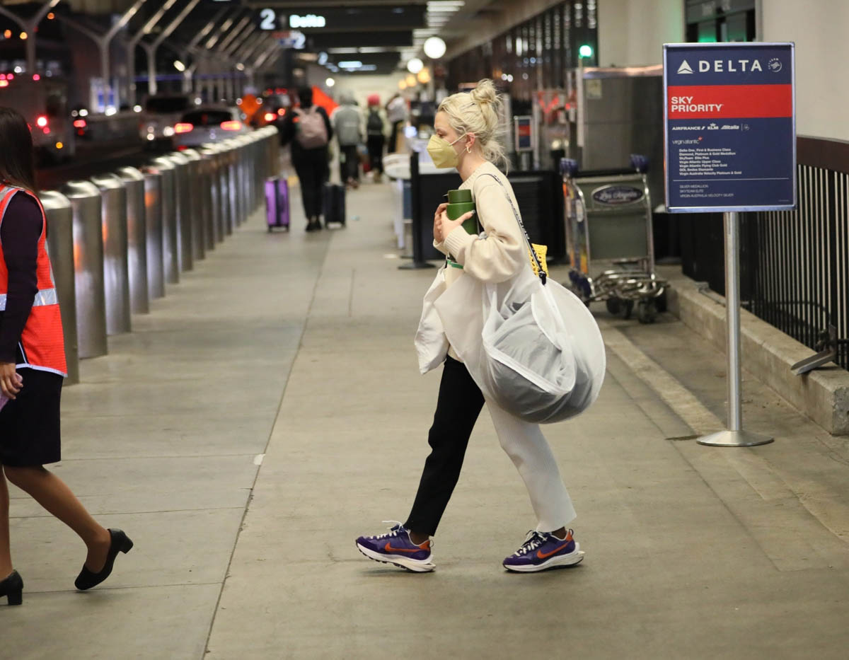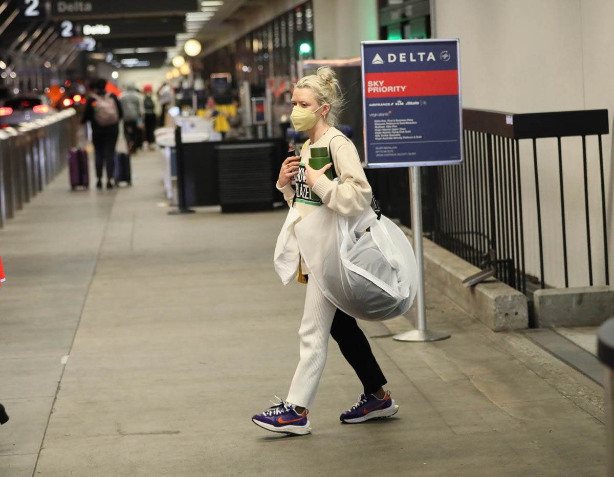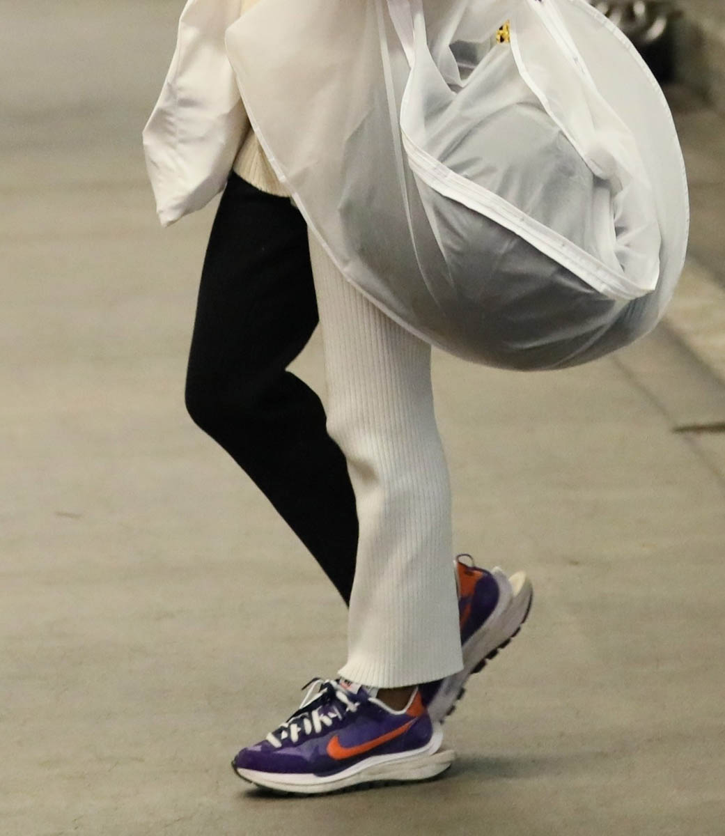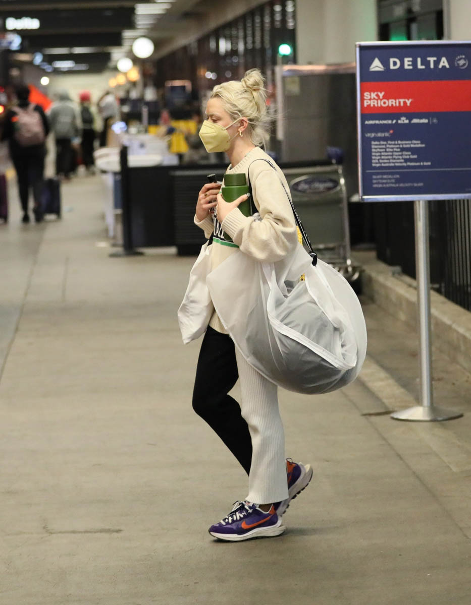 Here’s Maisie at LAX and as you can see, she's in pants, one leg black, one leg white. I wish we had a front-on shot of her to see how it looks with the split, but I am very into this and have actually been looking for a pair and can’t quite find the right fit. For me I don’t want them to be skinny – because if they’re skinny, they end up looking like leggings. Black and white leggings is a whole other look, like a dance troupe look, or pantomime. And the whole appeal of this is that they should be street not stage. The fit on Maisie here is perfect. I just wish we could get a better idea of it from all sides.