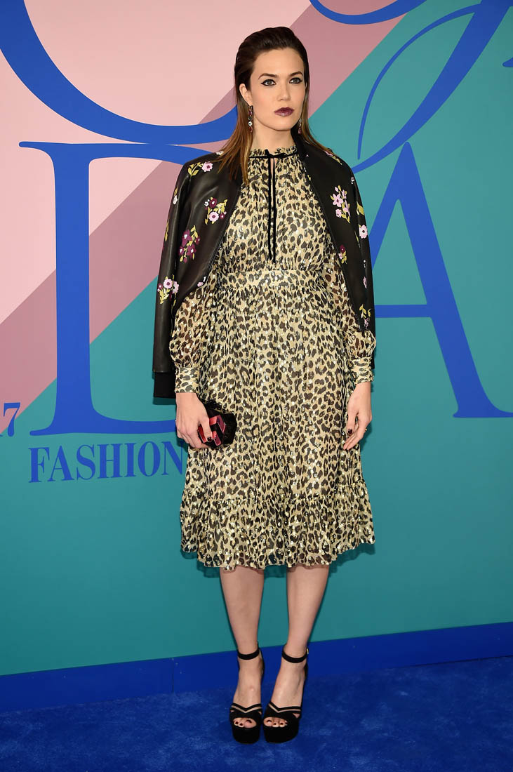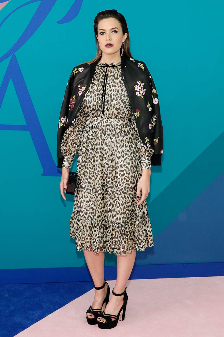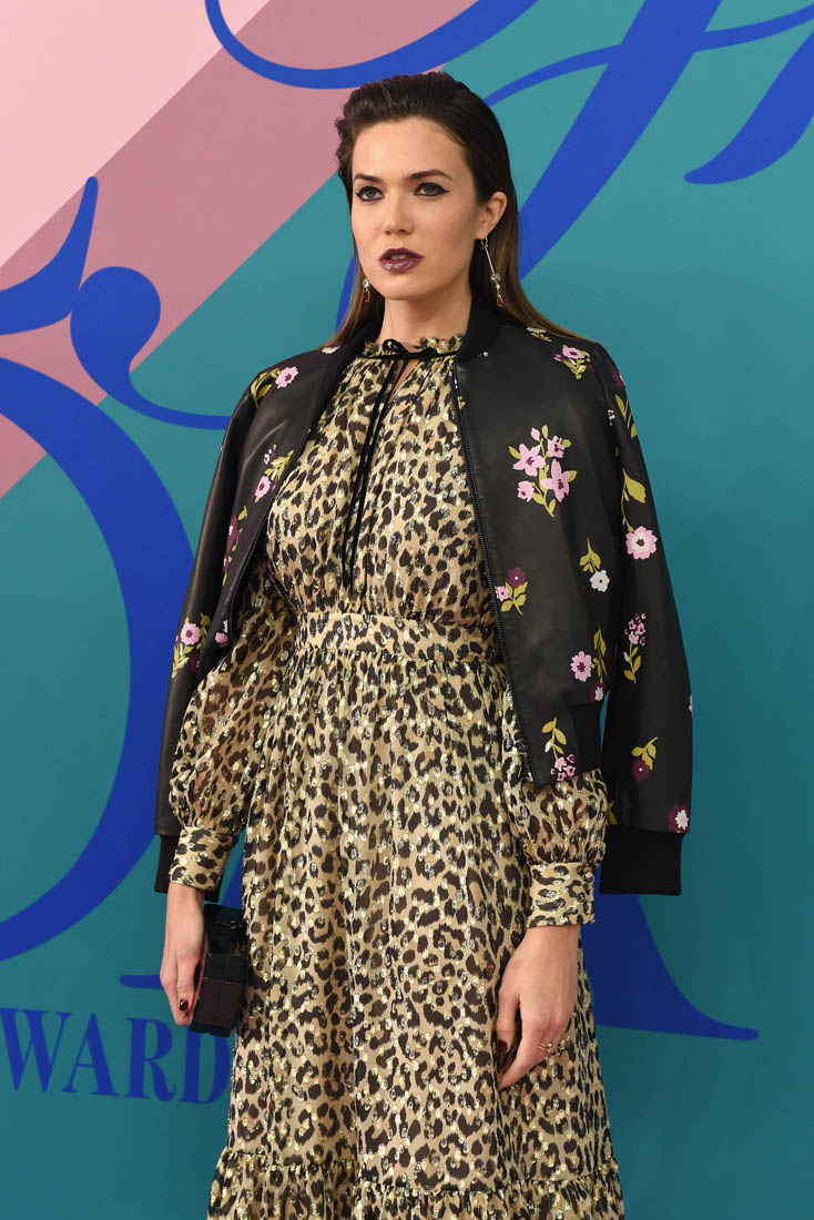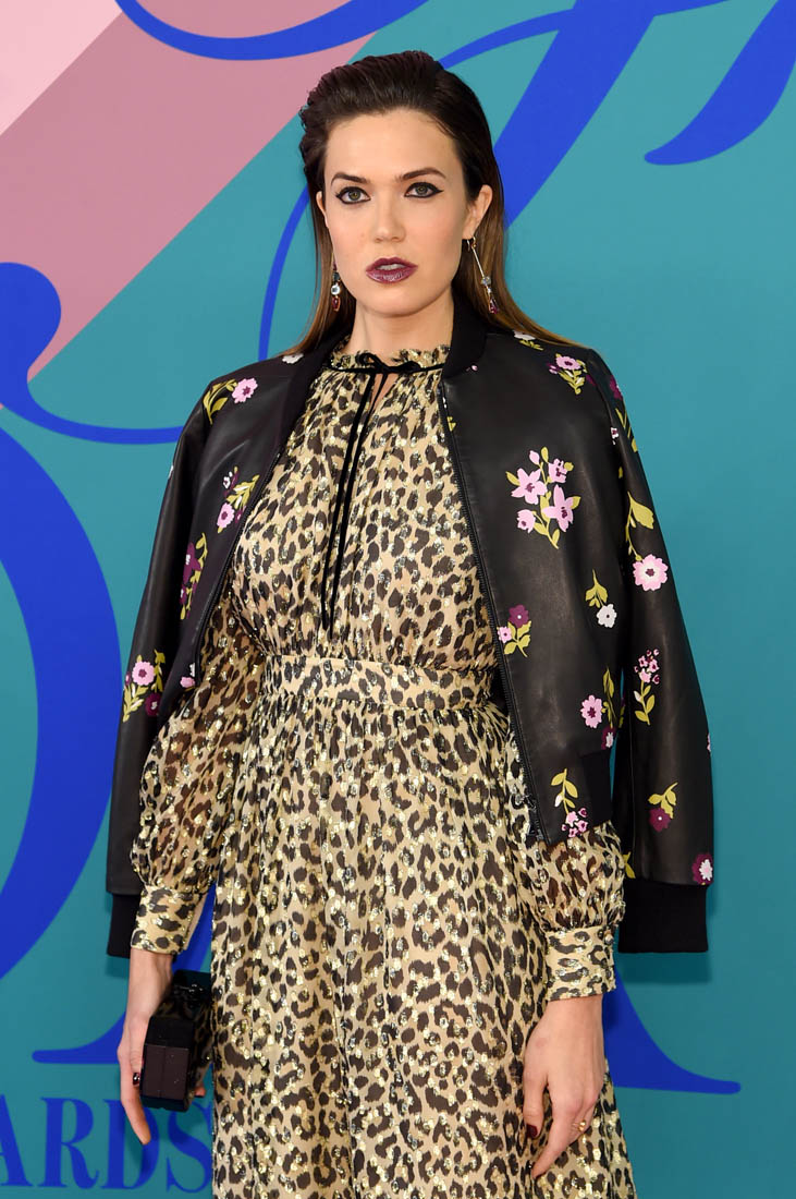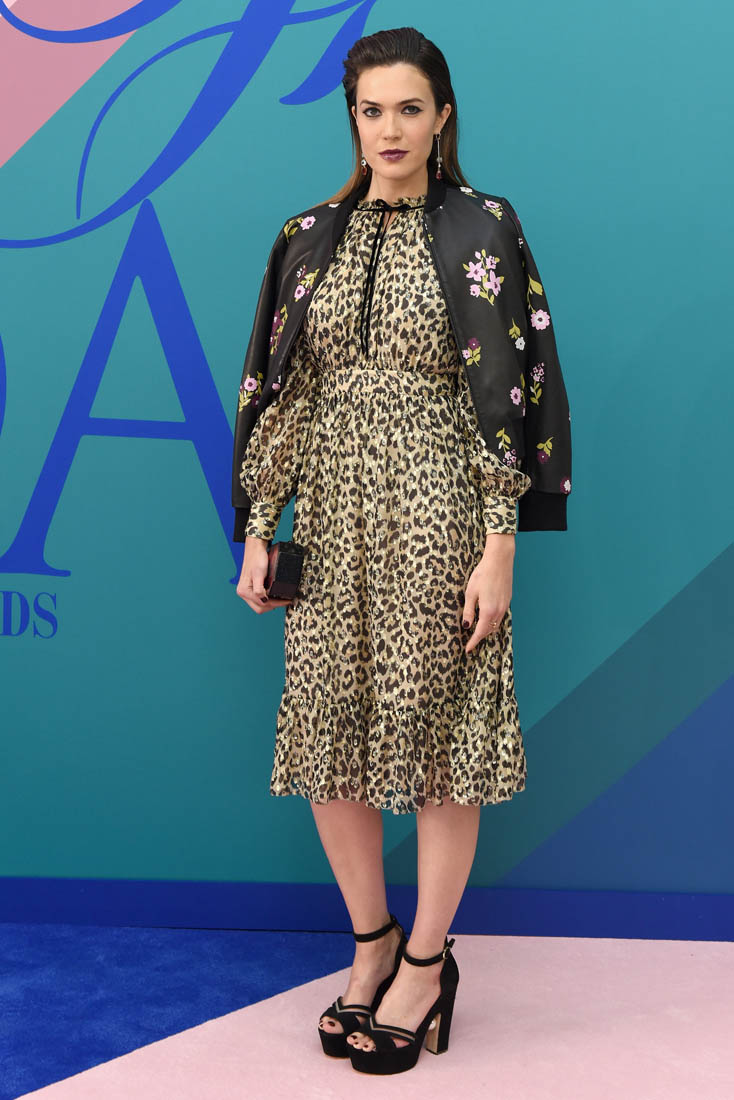Mandy wore Kate Spade last night, an all leopard print dress that, for me, is less interesting on its own and much more interesting when paired with the floral bomber. I also don’t love the hair choice, that rock’n’roll double side slick, I think it’s too on the nose. Topknot would have been better, I think?