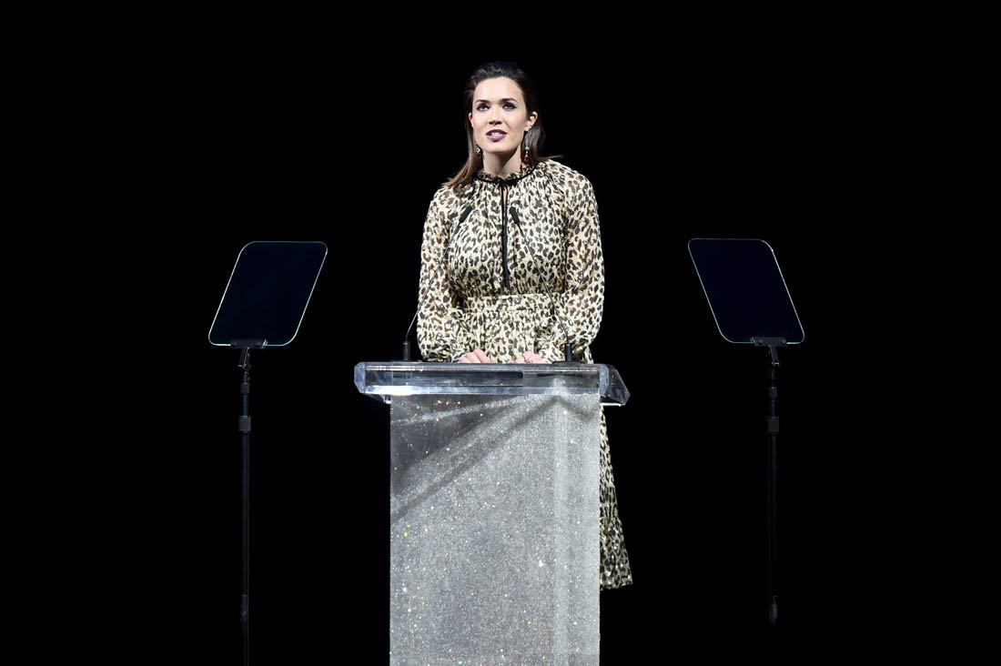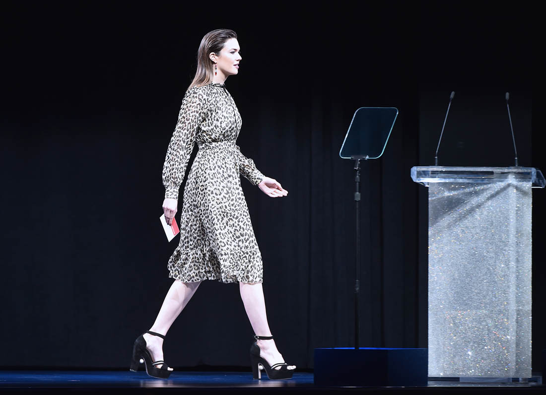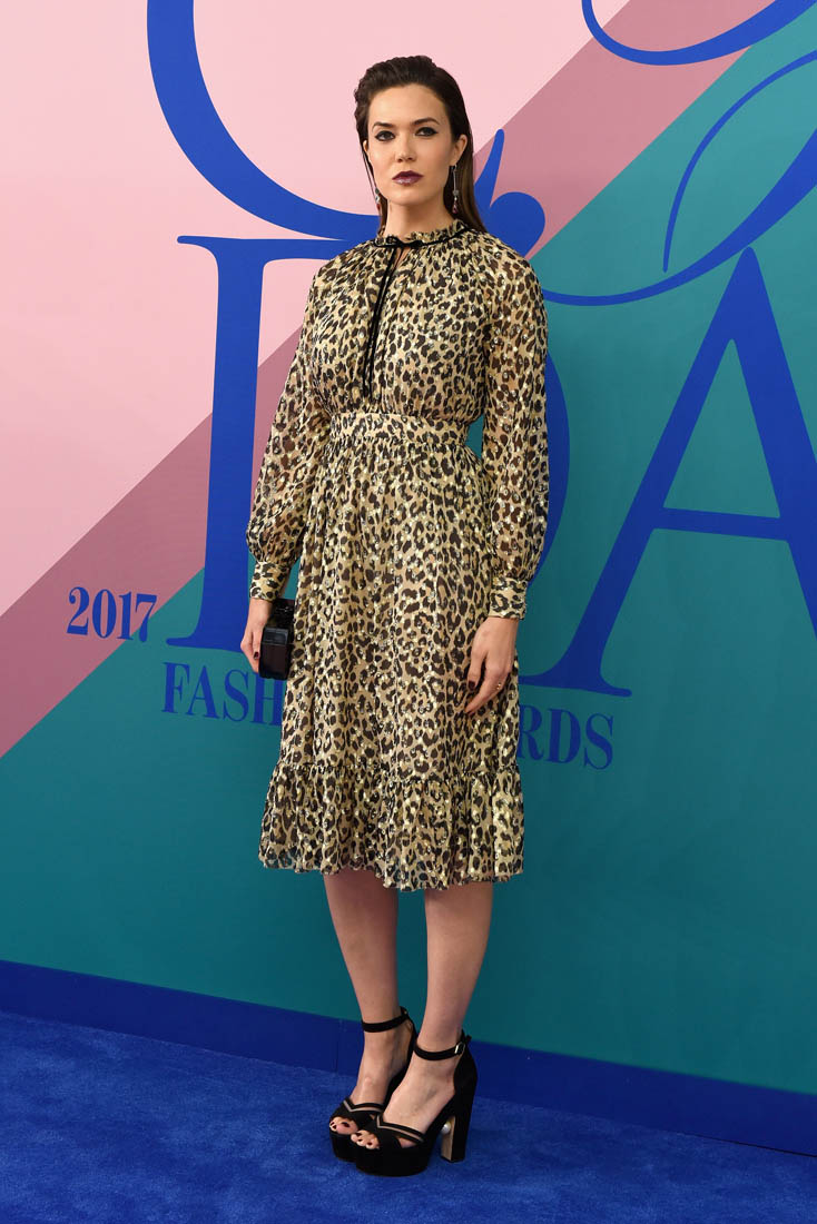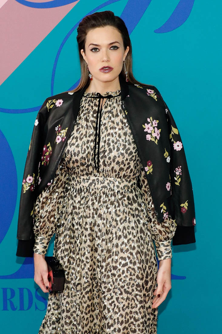 Mandy wore Kate Spade last night, an all leopard print dress that, for me, is less interesting on its own and much more interesting when paired with the floral bomber. I also don’t love the hair choice, that rock’n’roll double side slick, I think it’s too on the nose. Topknot would have been better, I think?