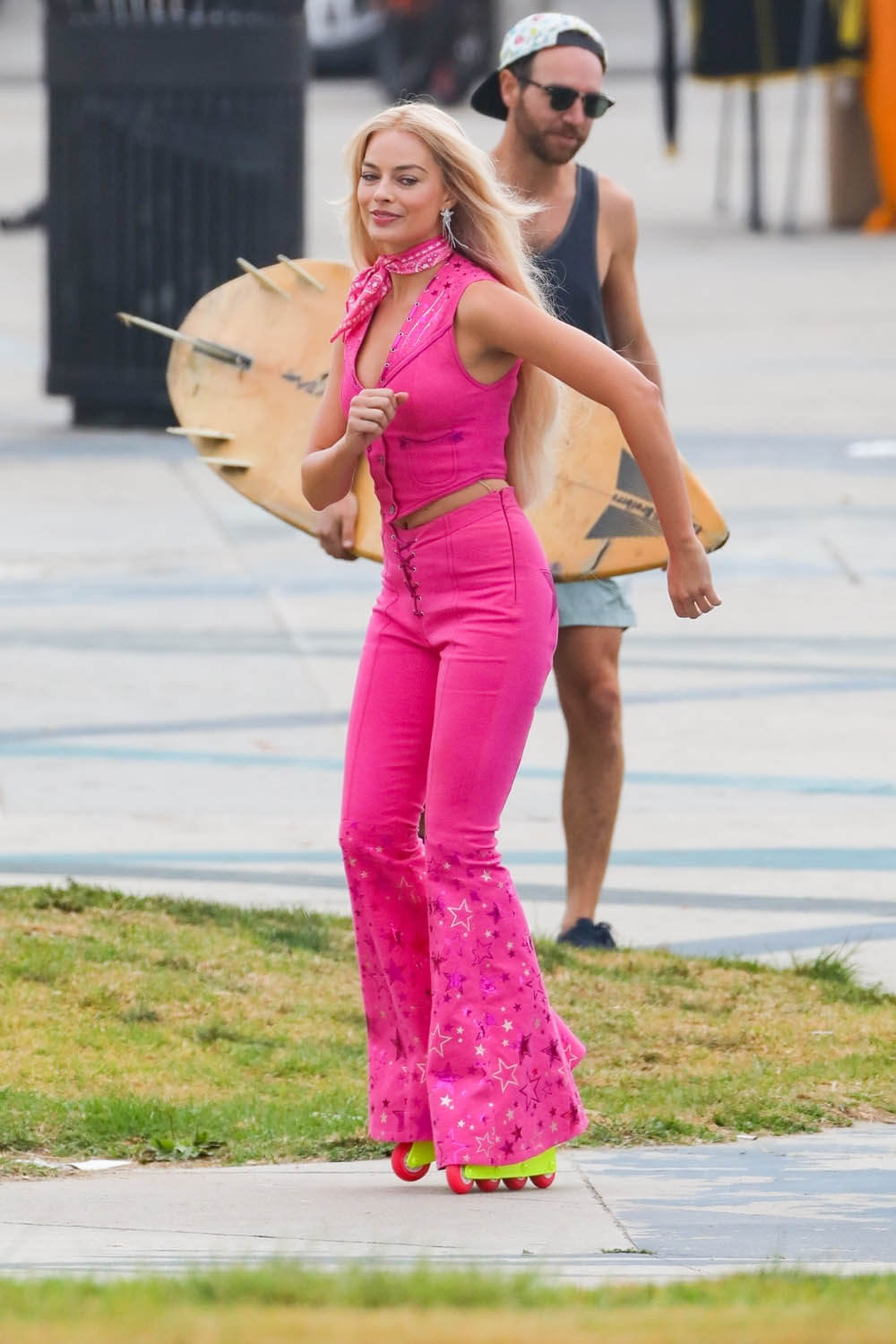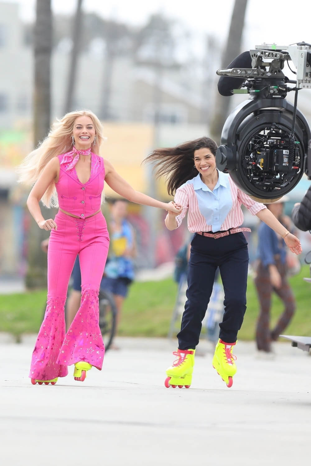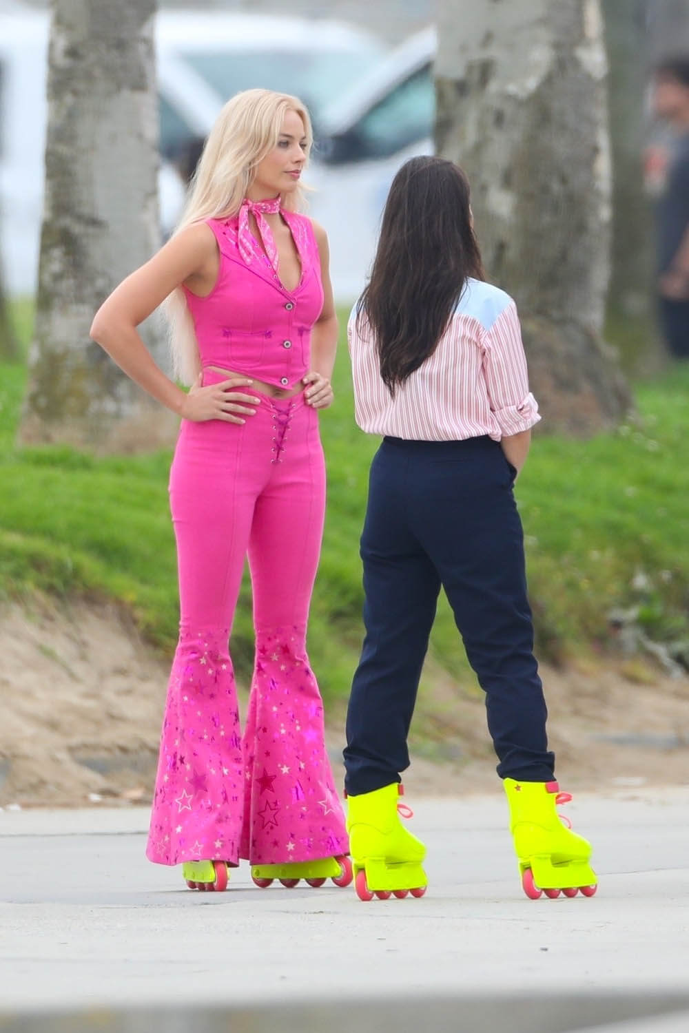 So far in all the set photos that the paps have taken of Margot Robbie as Barbie over the last few days, it’s been the same pink outfit. Sarah posted shot of Margot and Ryan Gosling as Ken on what looked like the school run the other day in western clothing. It’s possible that these new shots of Margot rollerblading with America Ferrera are from the same day in the story. Because we’re not getting a Barbie story without multiple fits, right? Even in the press photo that was released as a “first look” she’s wearing a different outfit: