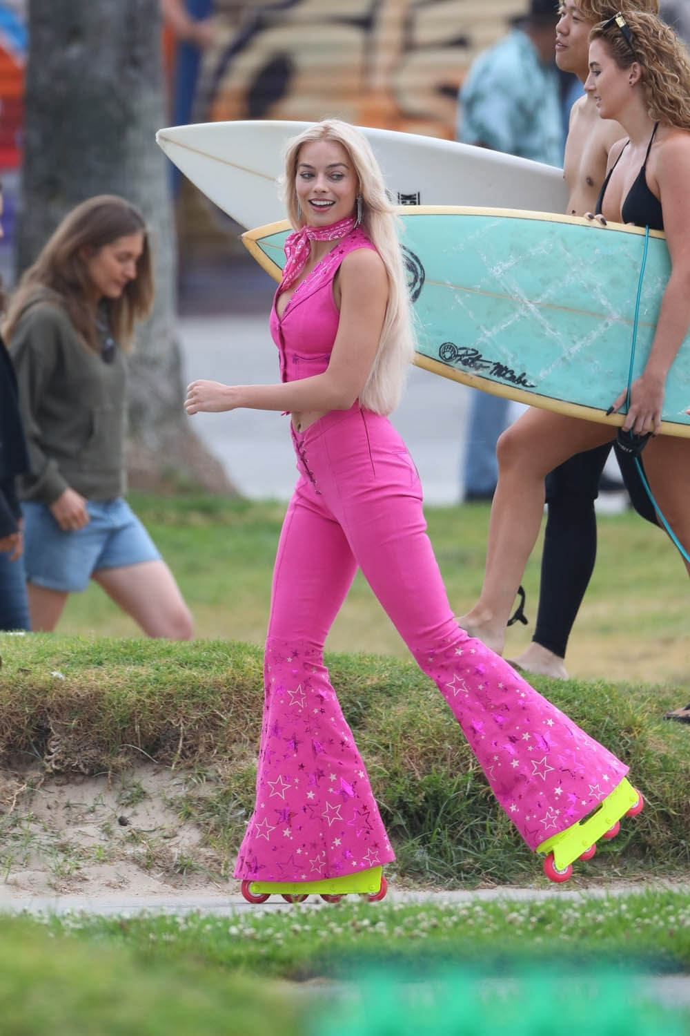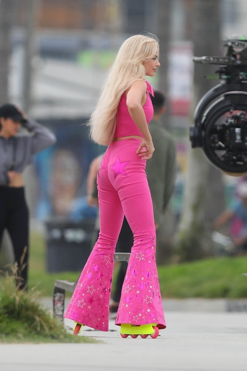 Well of course Barbie rollerblades. Actually, I thought these were roller skates before I zoomed in and, if I’m honest, I feel like roller skates would be more Barbie vibes than blades but then again, I’m no Barbie expert, and I’m certainly not here to pretend that I have better ideas than Greta Gerwig so let me just shut f-ck up about the rollerblades and talk about the fashion.