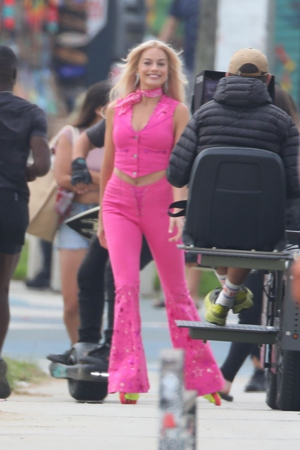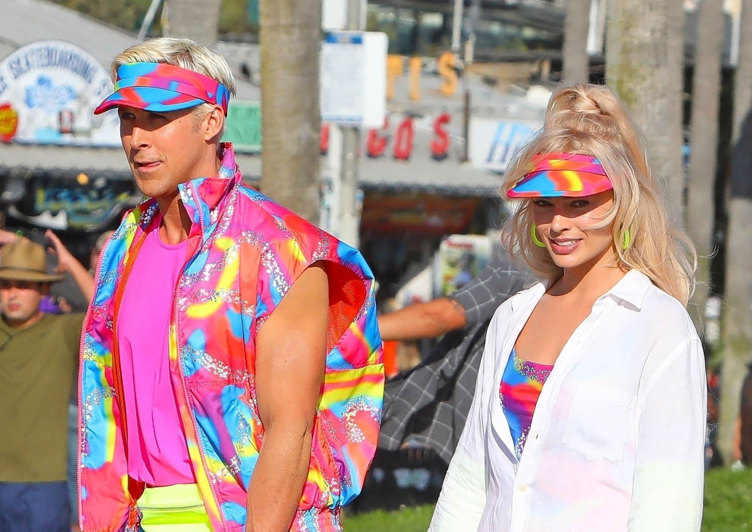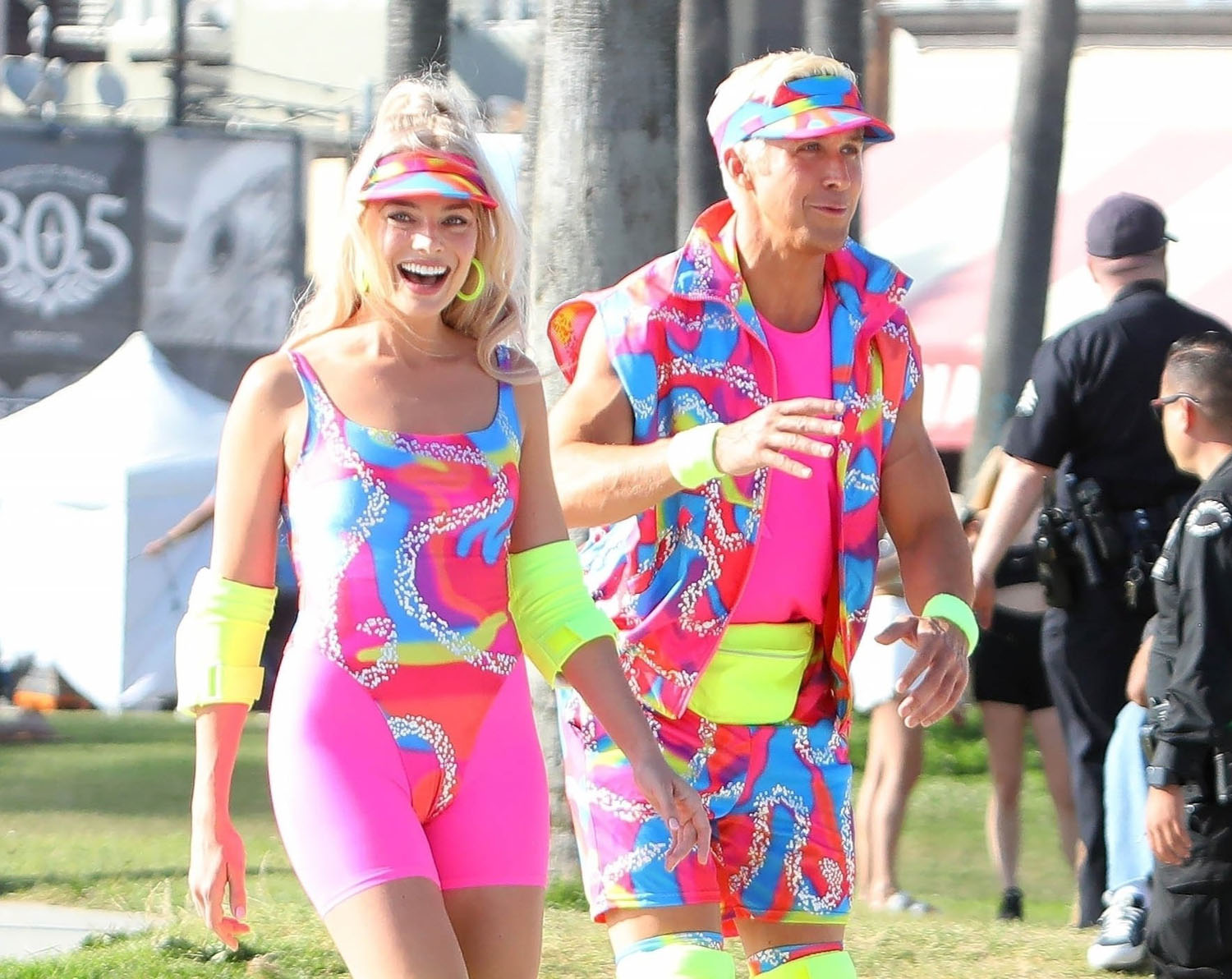 Not getting an answer to that question any time soon but I did ask yesterday about outfit changes and we got one. Margot’s changed out of her pink western-style suit and is now matched with Ryan-Ken in spandex and neon yellow. So my new question is WHEN we’re setting this movie? Like are we in the 80s/early 90s here? This is a distinctly 80s/early 90s look, especially with that print. I know that 80s and 90s fashion is coming back now but the 80s/90s-inspired clothes that we’re seeing now in retail are still grounded in today’s preferred colour-ways and fabrics.