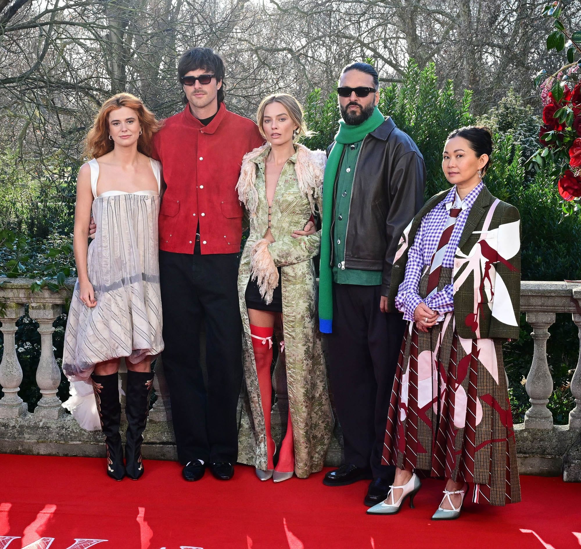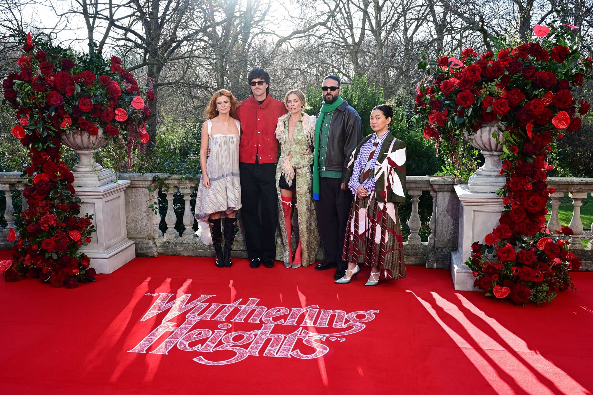 Alison Oliver, Jacob Elordi, Margot Robbie, Shazad Latif, Emerald Fennell, and Hong Chau attend the London photocall of "Wuthering Heights" at Spencer House on February 04, 2026 in London, England