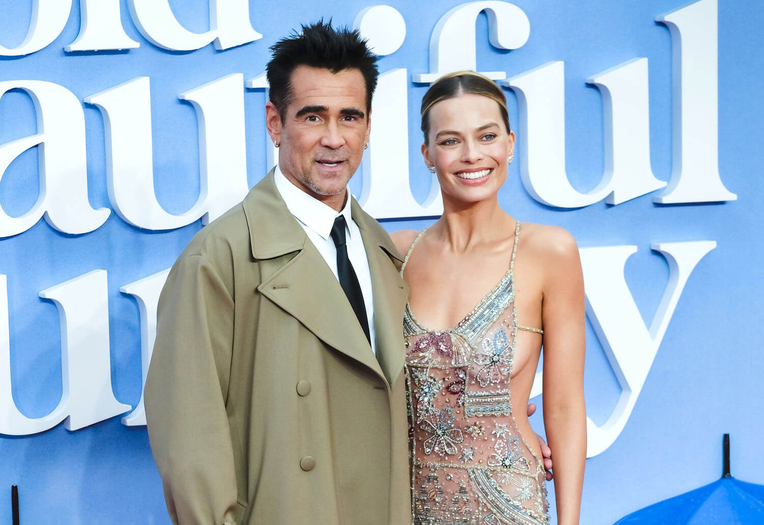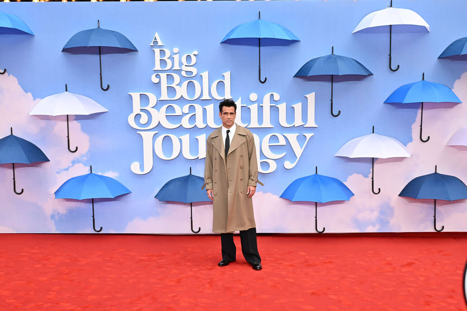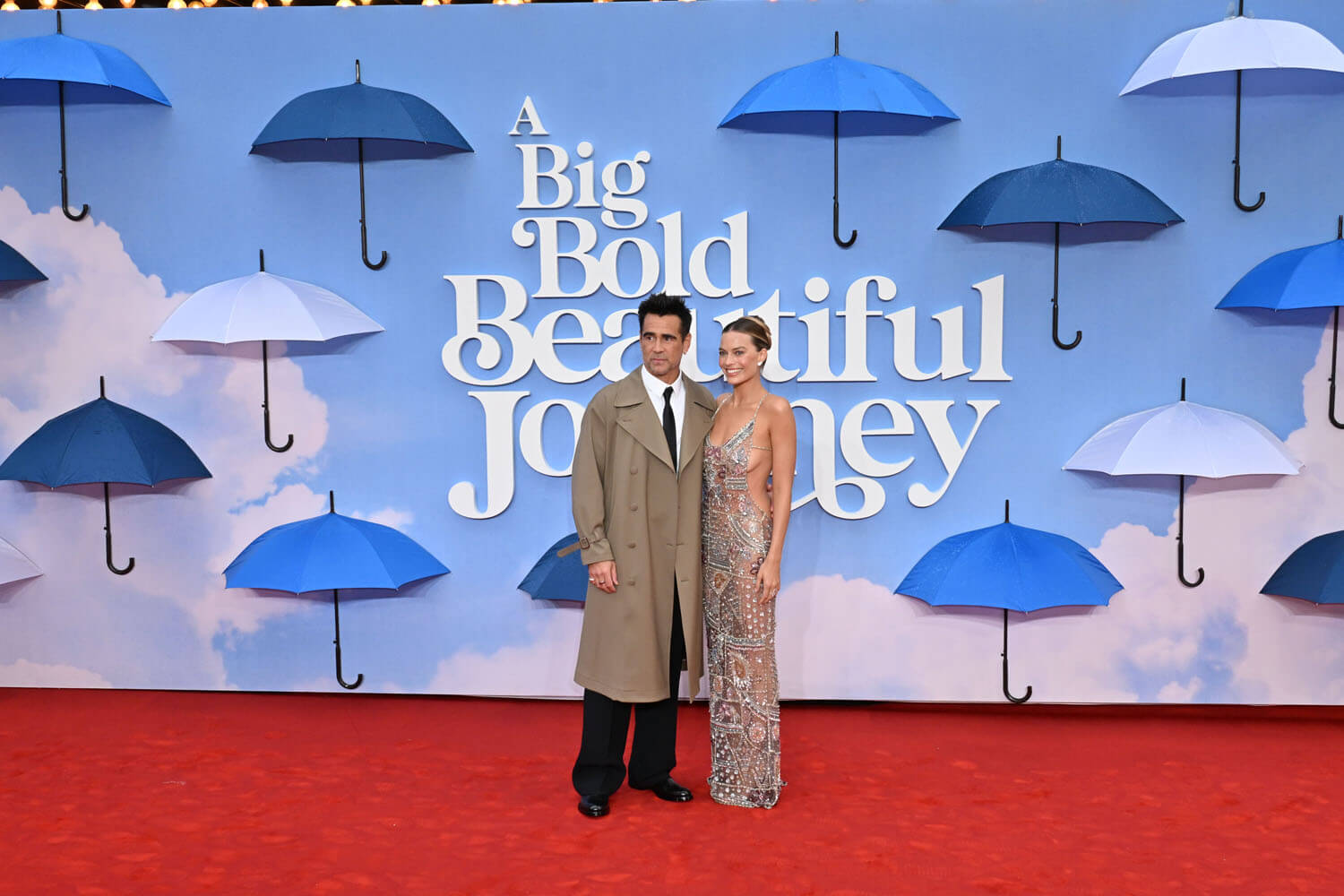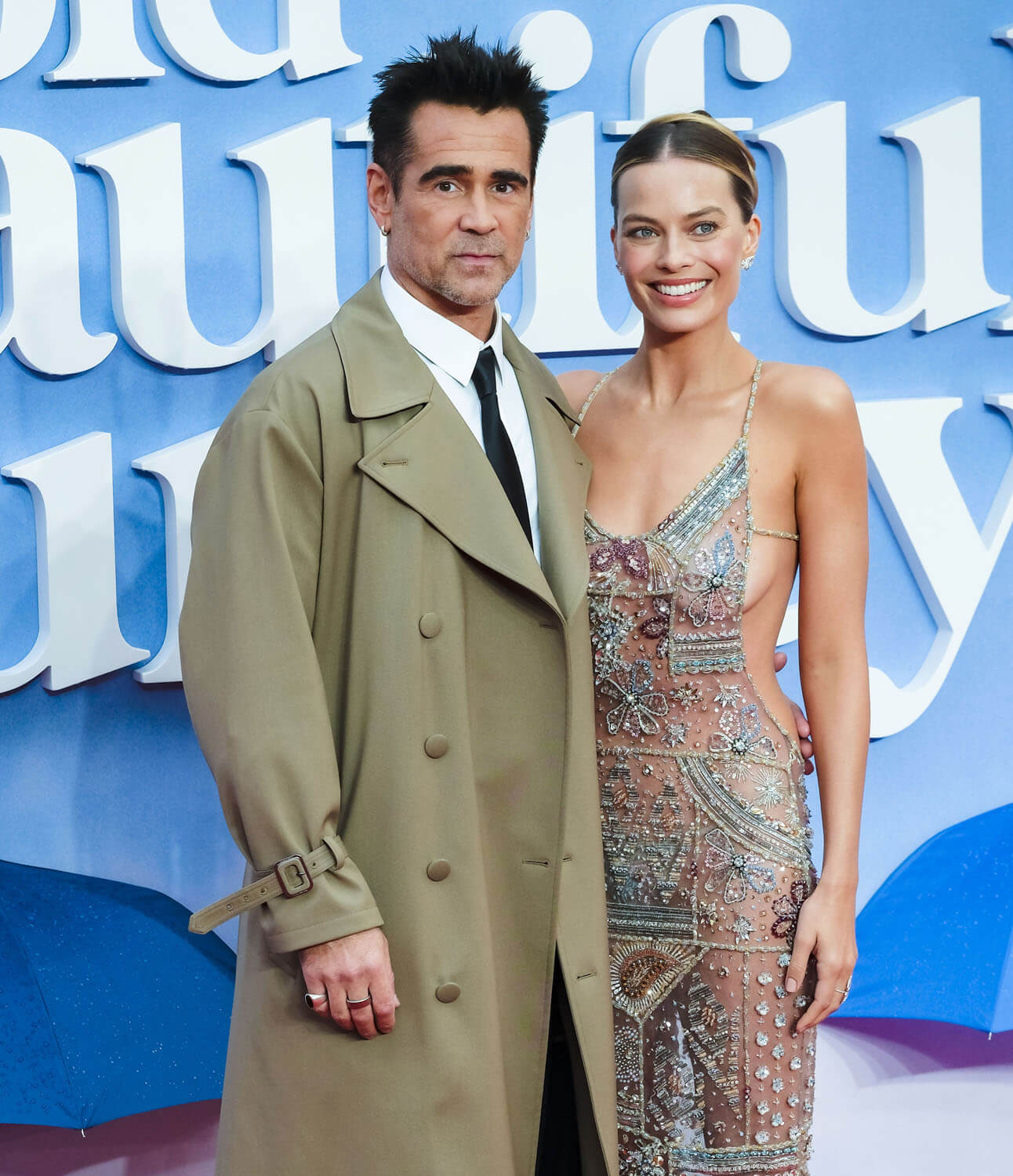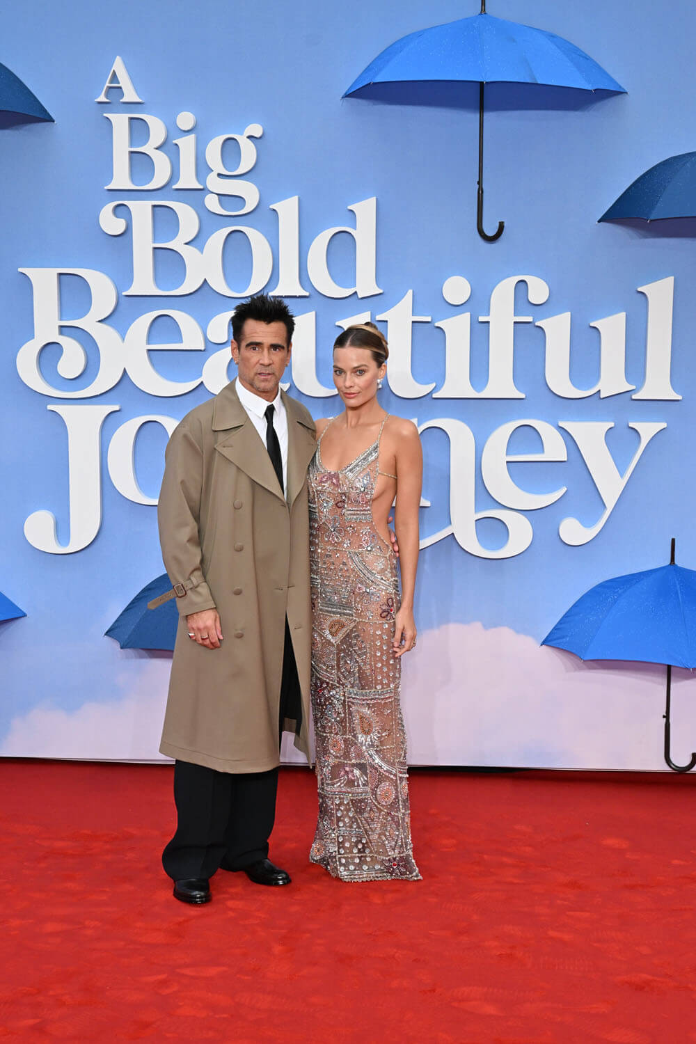 The press tour for Kogonada’s A Big Bold Beautiful Journey continues, this time stopping in London. Colin Farrell showed up looking like a private eye in a trench coat, fitting right in with the premiere’s umbrella theme. Margot Robbie showed up in a backless, sheer, sparkly dress by Armani Prive.