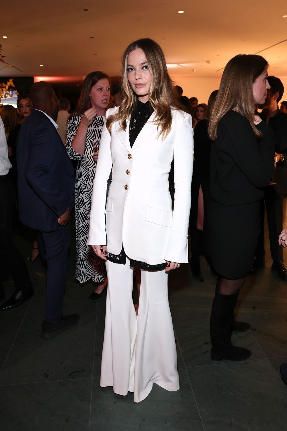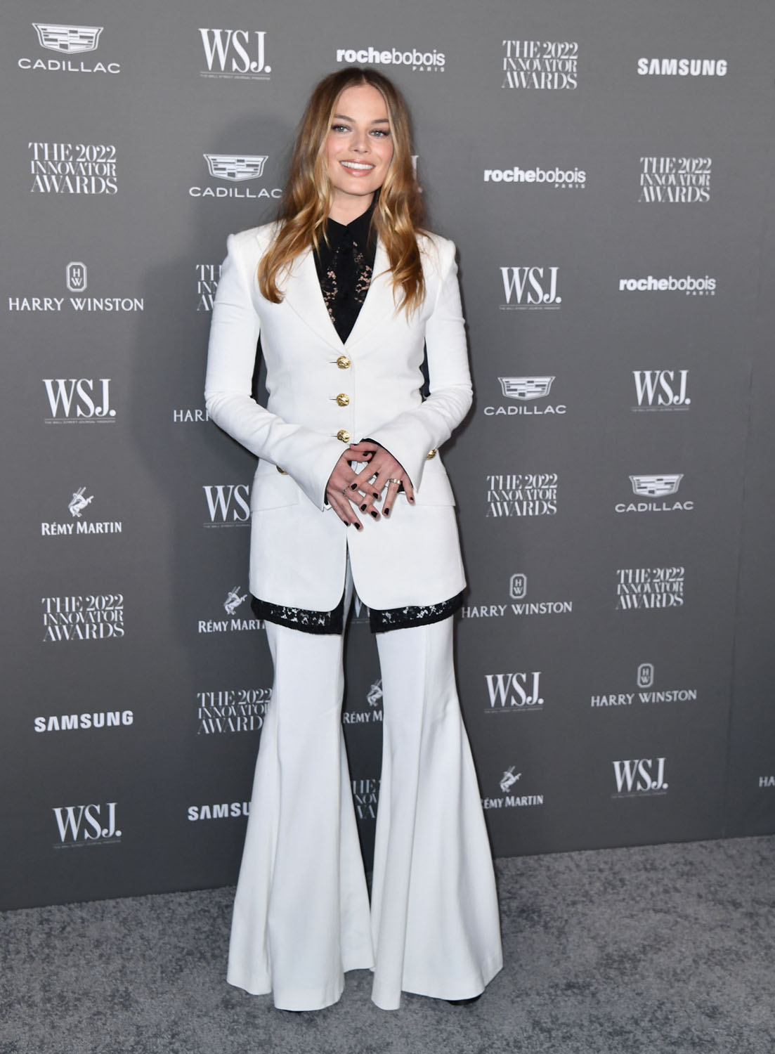 The tailoring is great - white jacket, the collar and the hem peeking above and below, and the wide-leg pants. Which I don’t normally f-ck with. But she pulls them off. She is wearing the sh-t out of this fit. This is the best Margot Robbie outfit we’ve seen in a long time.