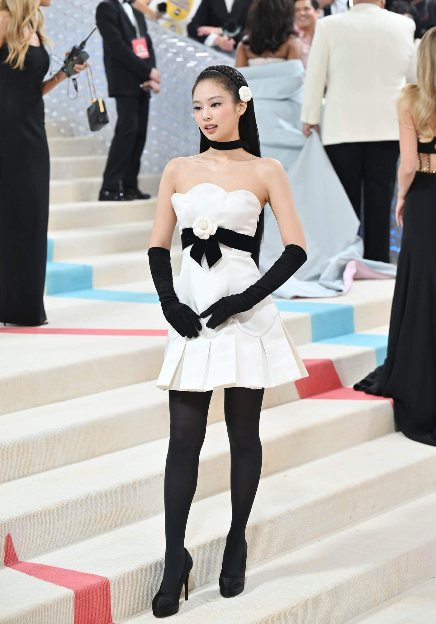 Jennie, on the hand, in a vintage look from the 90s, is Chanel-perfect. The brand-ambassador energy here is exactly right. The dress is a wonderful match for her, they made the perfect choice for her, and the accessories, the hair, and the makeup are all flawless. I particularly love the double braid headband (done with hair extensions), which I will be ripping off in the near future.