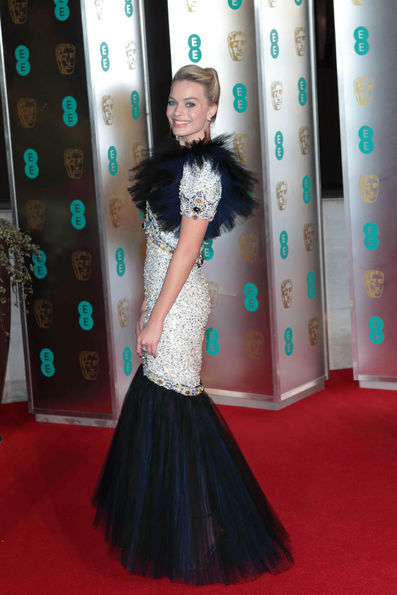 You know what the problem is? If you compare this look on Margot to how it was sent down the runway, it’s all in the styling. Look at the way the hair was styled on the runway – to the extreme, leaning into its edge. Margot’s basically wearing a chignon. It’s almost like she’s trying to mute the very character of the dress. And the dress is fighting back.
