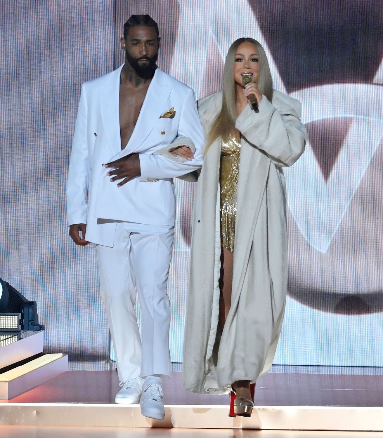 Mimi gave her first ever performance of her new single “Type Dangerous” which is the lead from her upcoming 16th studio album. It was everything you would expect from Mariah on stage. The hair was giving and she looks so f*king good it’s like a 2005 time warp. Any time Mariah pulls out the pin-straight hair and gold mini-dress we know she’s up to no good (in the best way). Anderson. Paak, the song’s co-producer and Mimi’s rumoured lover, was on the drums radiating pure joy and charisma as he smiled at his lady on the stage. In classic MC fashion, her high heels were so high that she could barely walk but do we even need her to? She’s given us so many years of the most insane vocal performances that at this point, the fact that she still shows up and looks great while doing so is more than enough. That gold mini ensemble? I just about screamed when the dancers revealed it underneath the fabulous coat. Sickening!