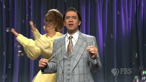 More importantly though, did Mimi stay seated during JLO’s standing ovation? She did. At least at the beginning when cameras were shooting the judging panel straight on. Mimi seemed preoccupied with all the streamers that came down from the sky. Reminded of me of that Lawrence Welk sketch on Saturday Night Live with Kristen Wiig as the sister with the freakishly small hands clapping at the bubbles.