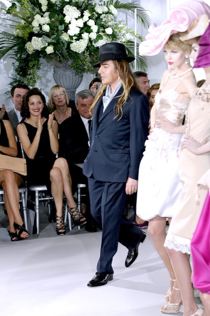 Dressed beautifully but conservatively so as not to usurp the runway, looking perfect, and smiling broadly for John Galliano, Marion is enjoying the success of Public Enemies, which opened in a strong 3rd behind Transformers and Ice Age at the box office, as it was expected to, considering its R-rating, and the fact that it had to contend with family over the holiday weekend, and of course the new reality that good taste is dead.
