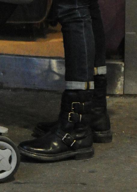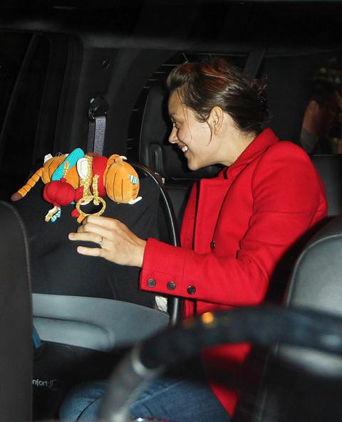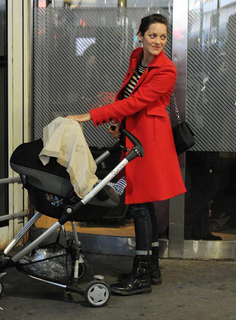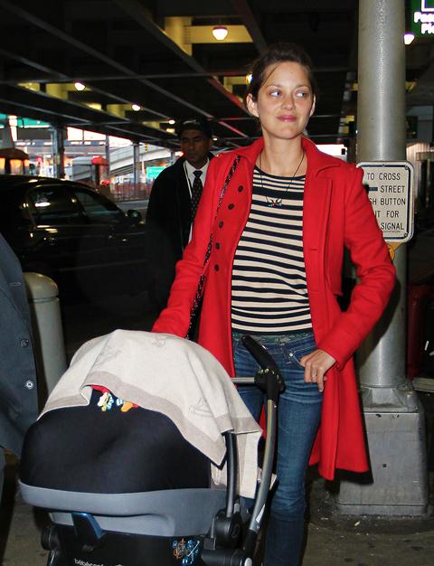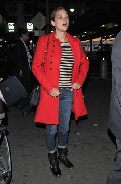 Marion Cotillard arrived in New York yesterday with her son Marcel presumably to work on The Dark Knight Rises. How beautiful she is without makeup, non? And I am totally ripping off this travel outfit. The stripes mute the red coat, and I need to find myself a pair of jeans that fit like this over my boots.
