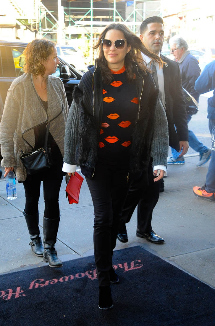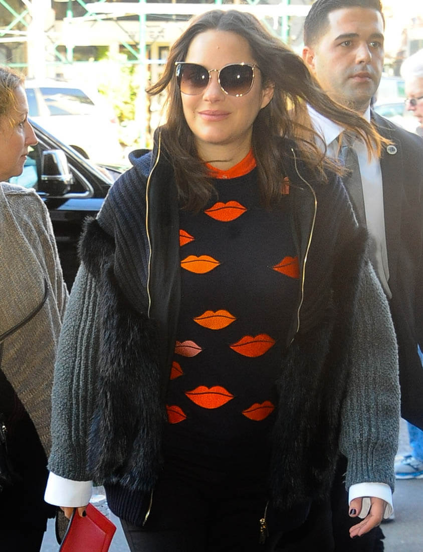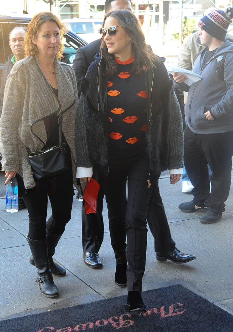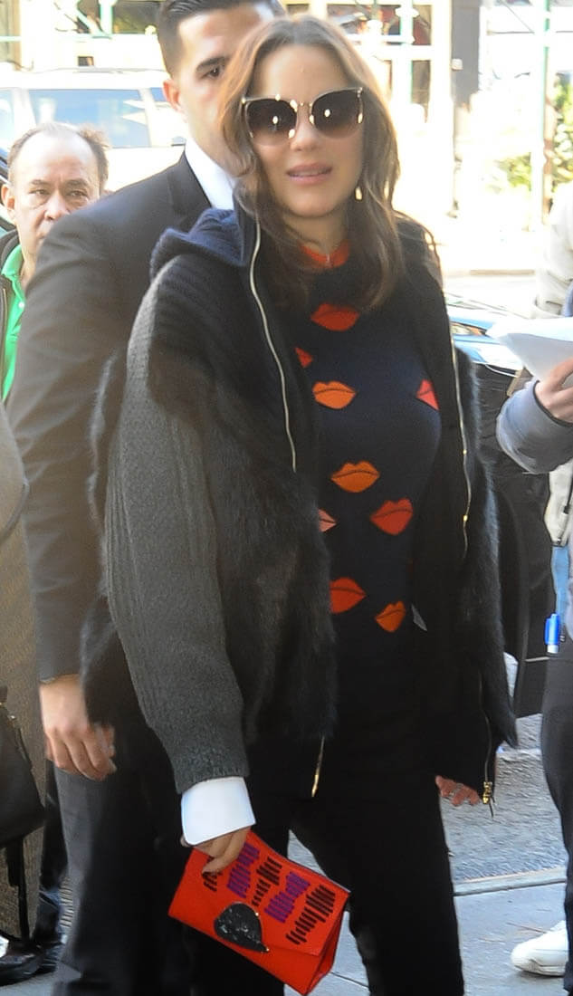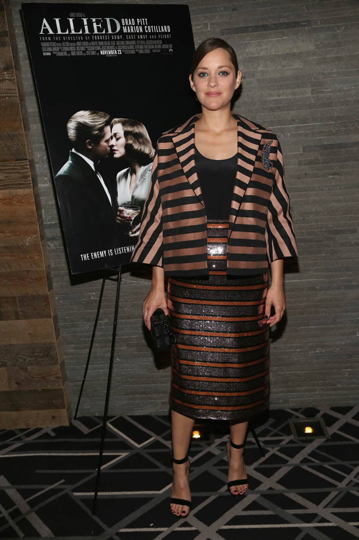 Marion Cotillard was at the New York premiere of Allied last night. I love this outfit, the colour, the stripes, the shape of that jacket. I also love the red-lipped sweater she wore today. Marion has been doing a lot of the talking during this Allied press tour. Most of the talking? At a press conference the other day she talked about doing love scenes with Brad Pitt: