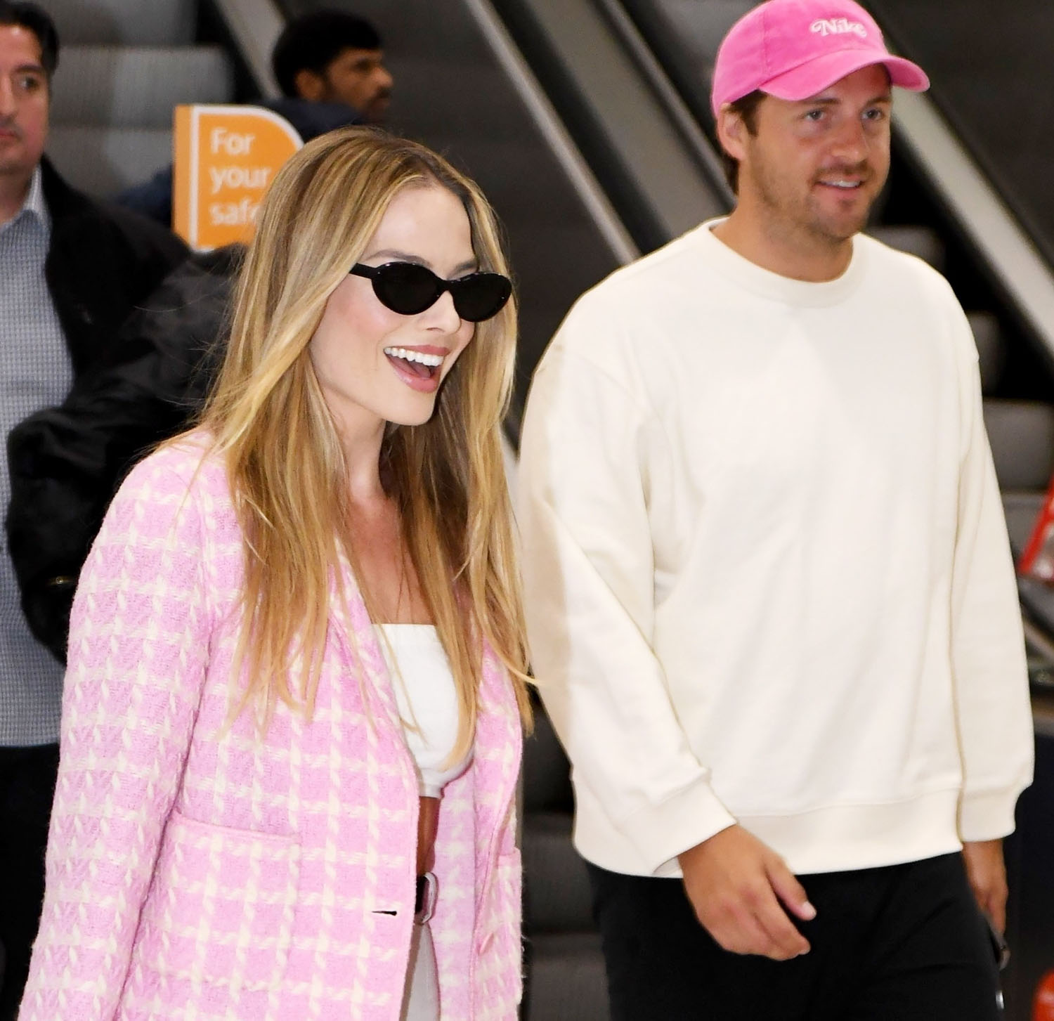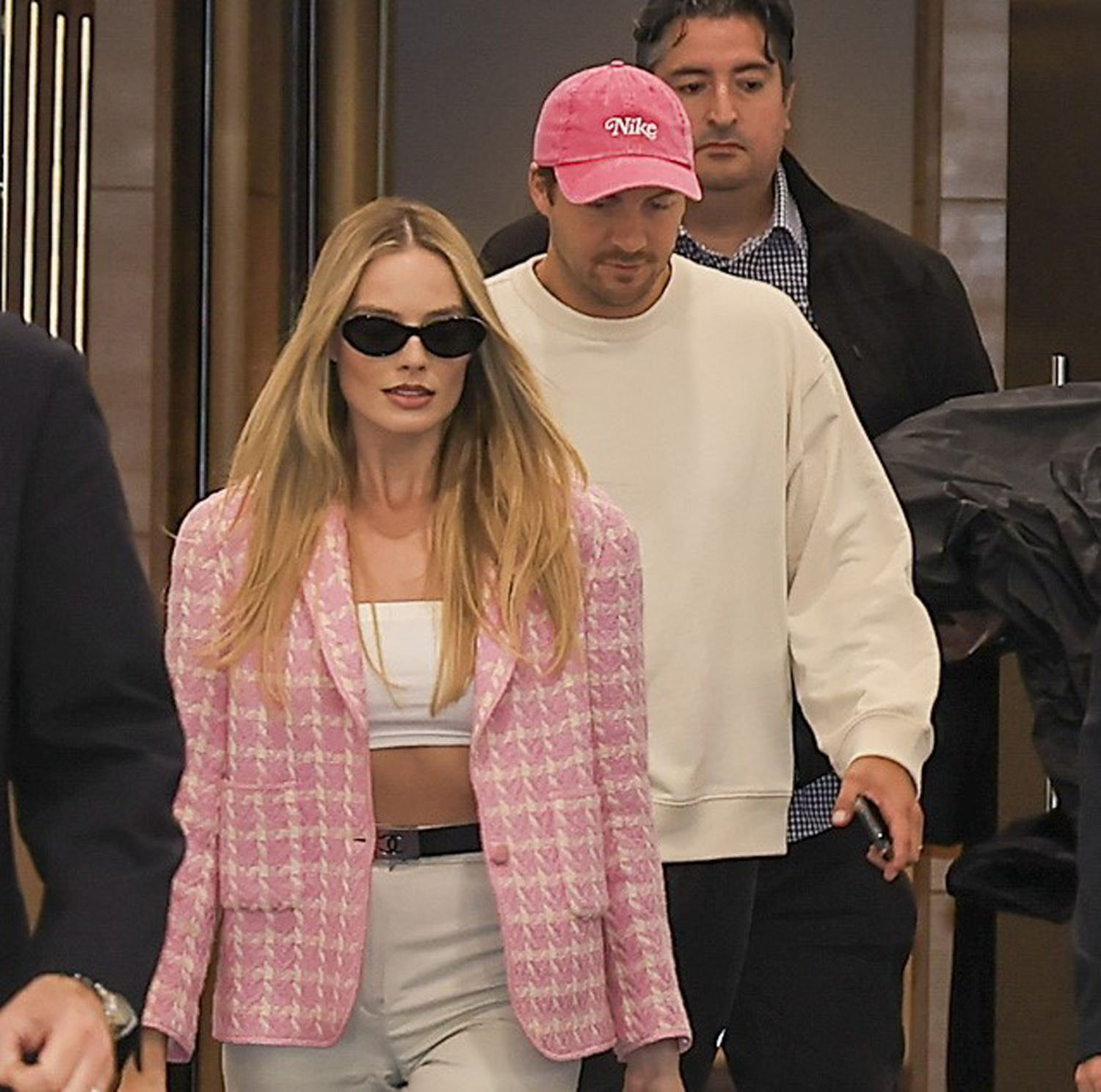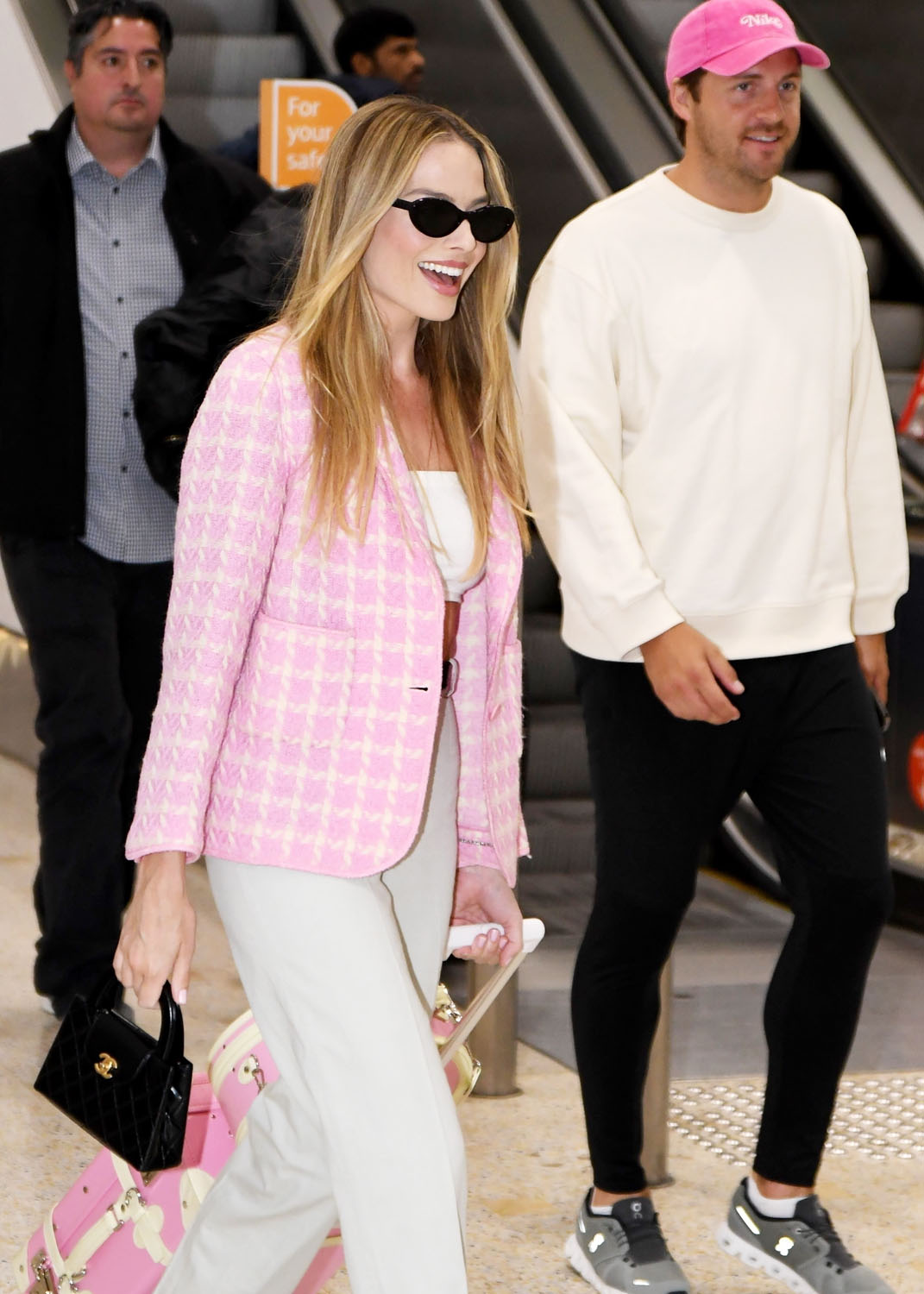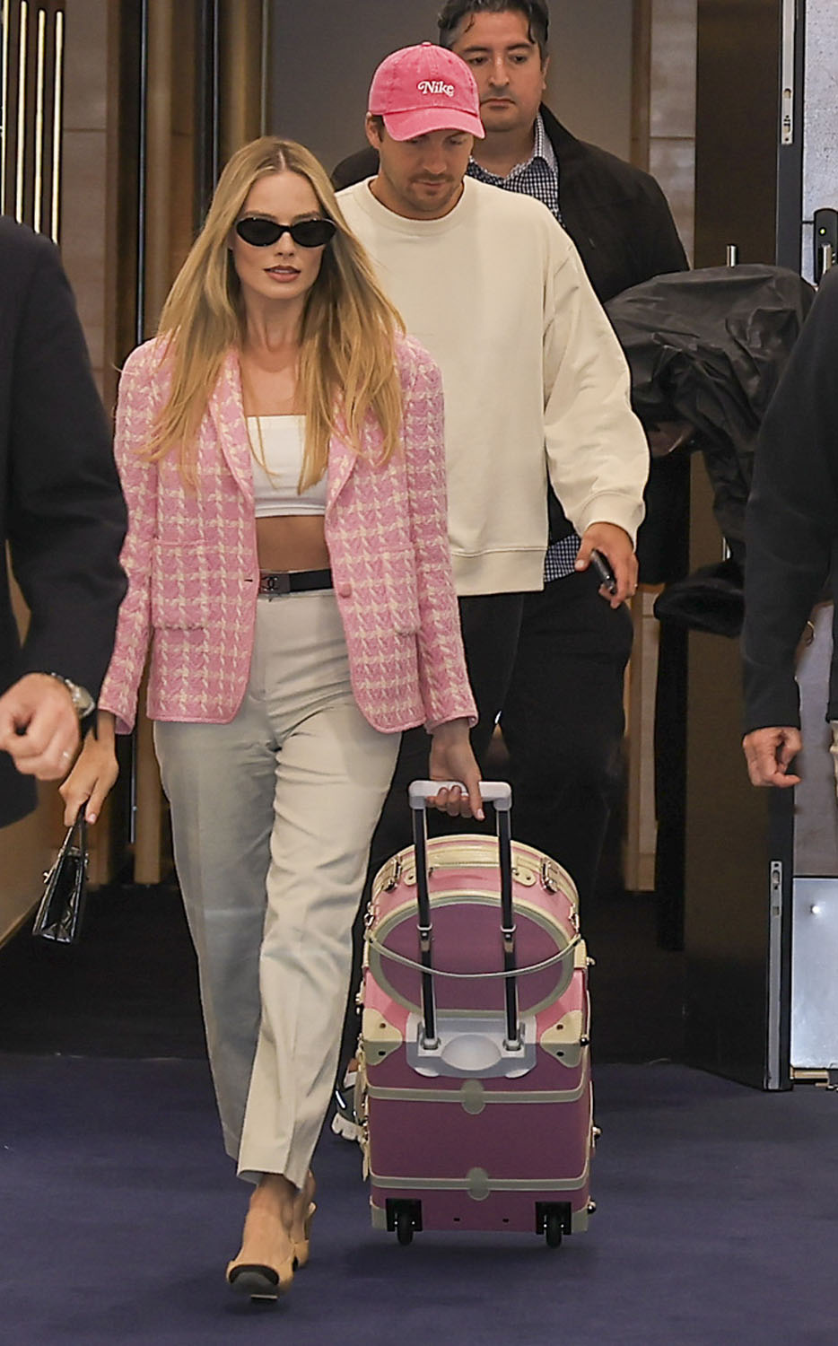 While the two Kenadians are handling the maple leaf stop on the tour, Barbie herself arrived at home in Australia this morning ahead of the Barbie event on Friday. Here’s Margot Robbie in a pink checked blazer over a cropped tank and jeans at the airport in Sydney and I love how even her travel outfits have been strategically Barbie-fied.