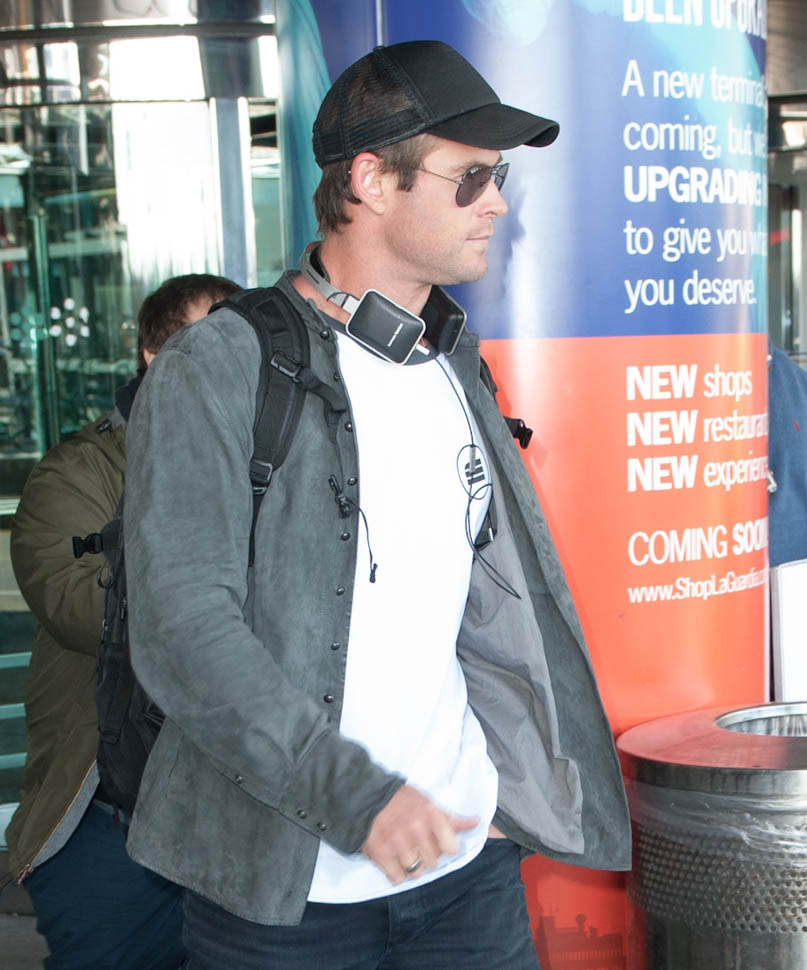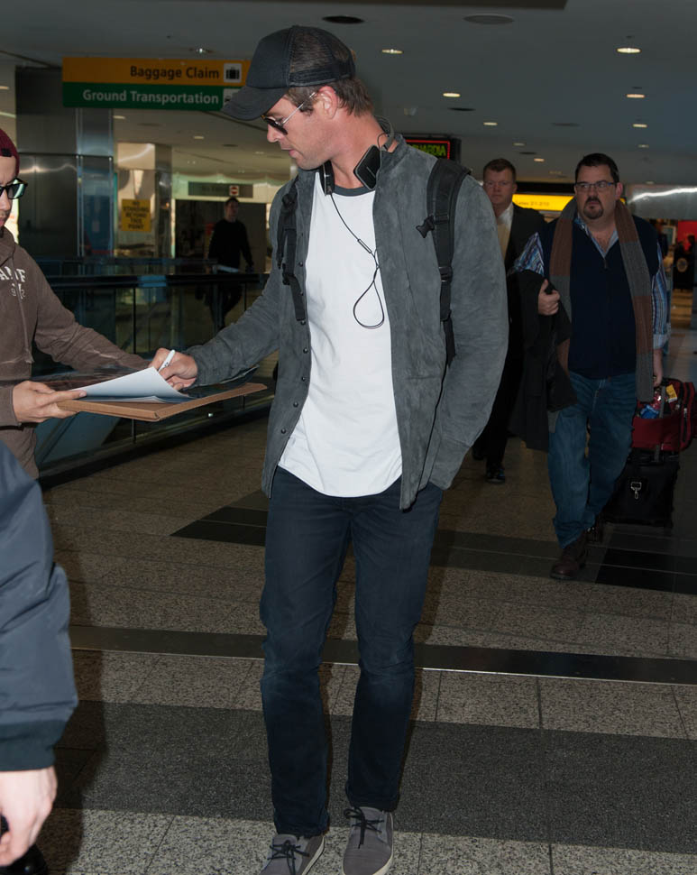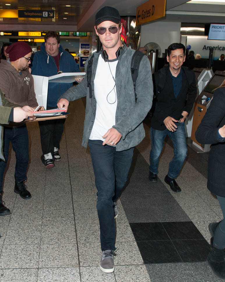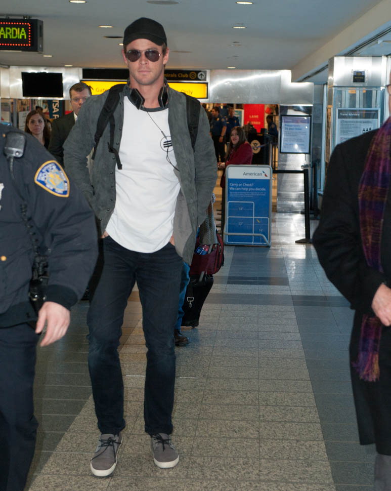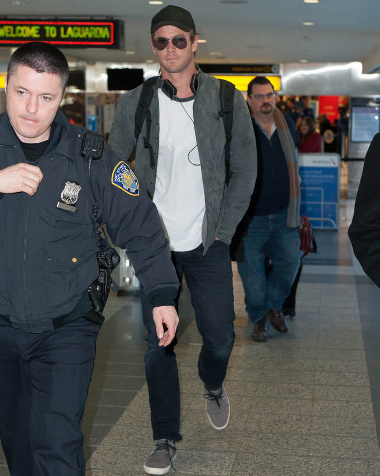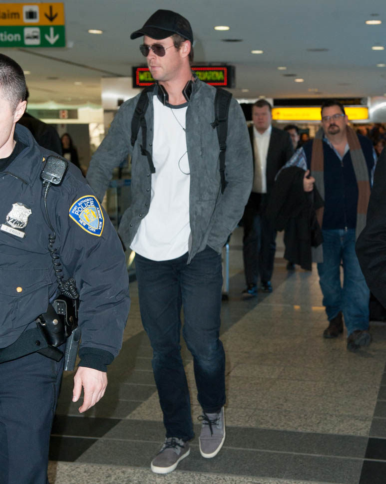 Attached – Chris Hemsworth arriving in NYC the other day in advance of hosting SNL this weekend.