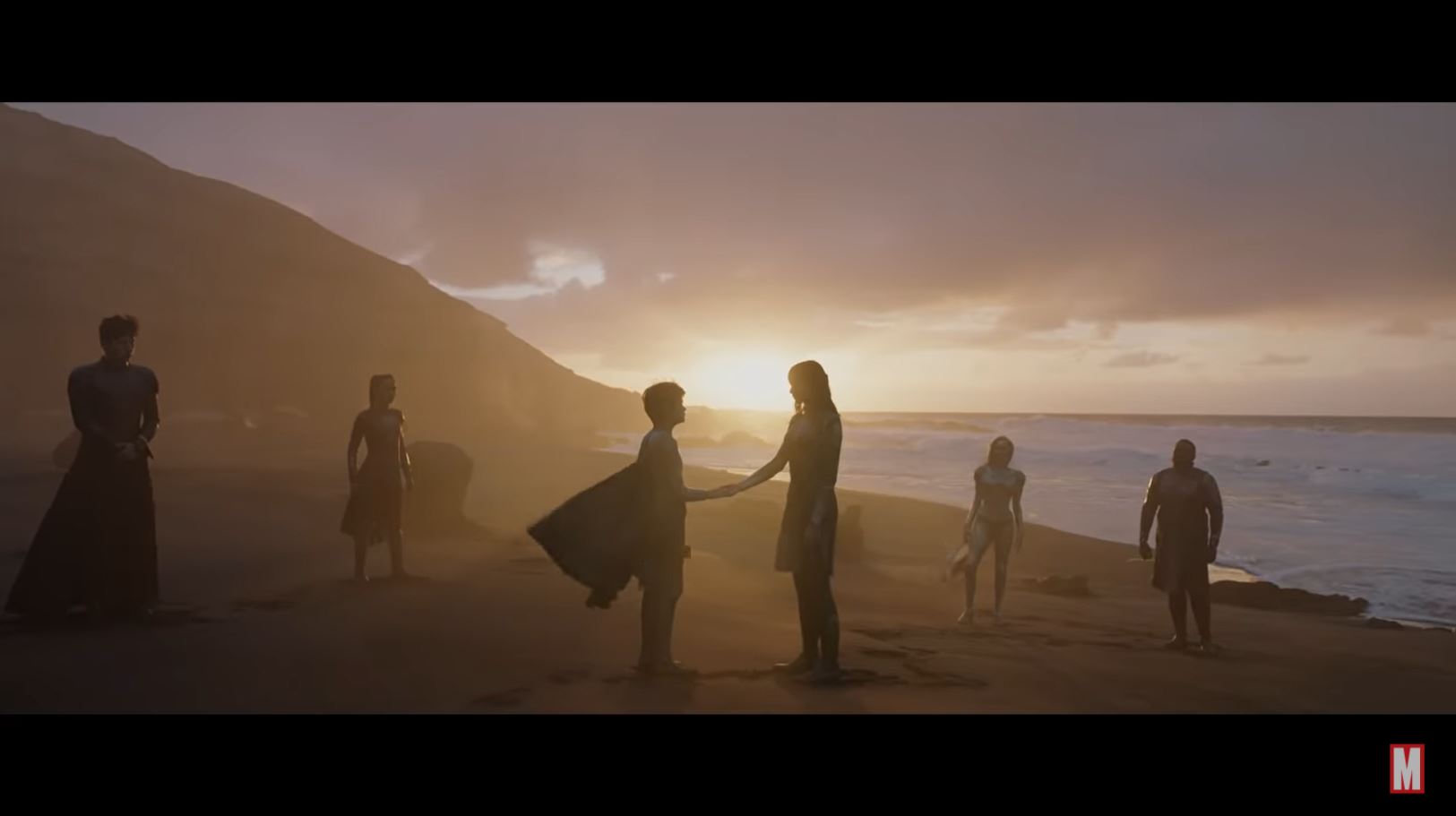 But the big draw of this teaser is the first look at Eternals. Last week, Kevin Feige was the star of the internet for a day after he raved about Chloe Zhao’s work on Eternals, specifically, how she insisted on using real locations as opposed to green screen backgrounds for her entry into the MCU. To prove the value of Zhao’s more naturalist approach, Feige and Zhao showed a sample reel of her intentions to the Disney executives bankrolling the project. Of this, Feige said, “And I had to keep saying, ‘This is right out of a camera; there’s no VFX work to this at all’ Because it was a beautiful sunset, with perfect waves and mist coming up from the shore on this giant cliffside — really impressive stuff.”