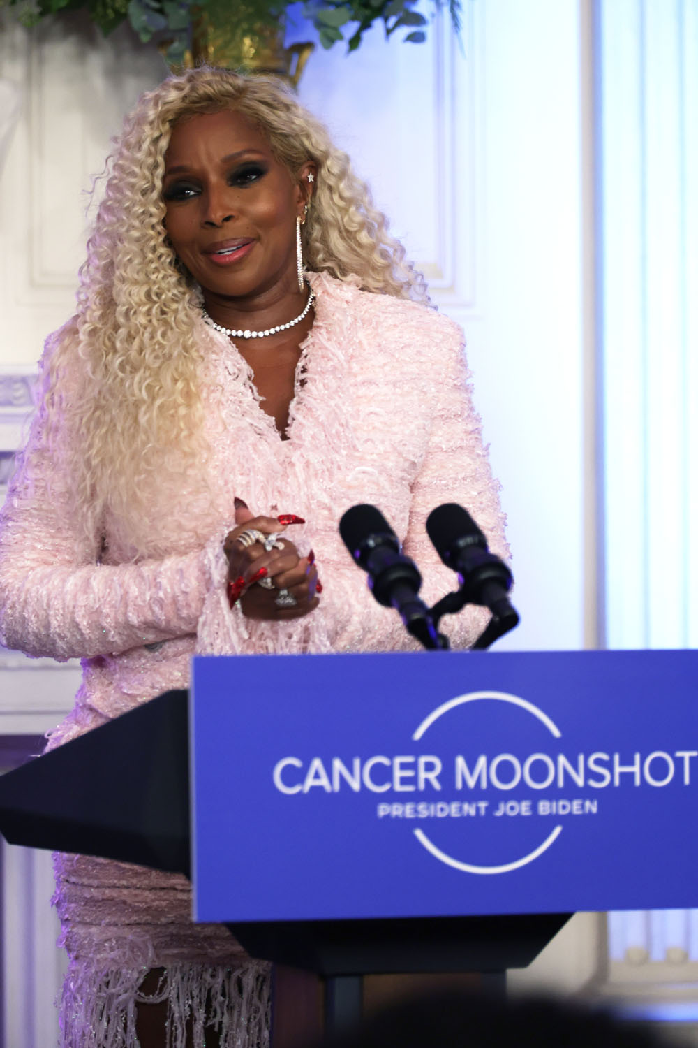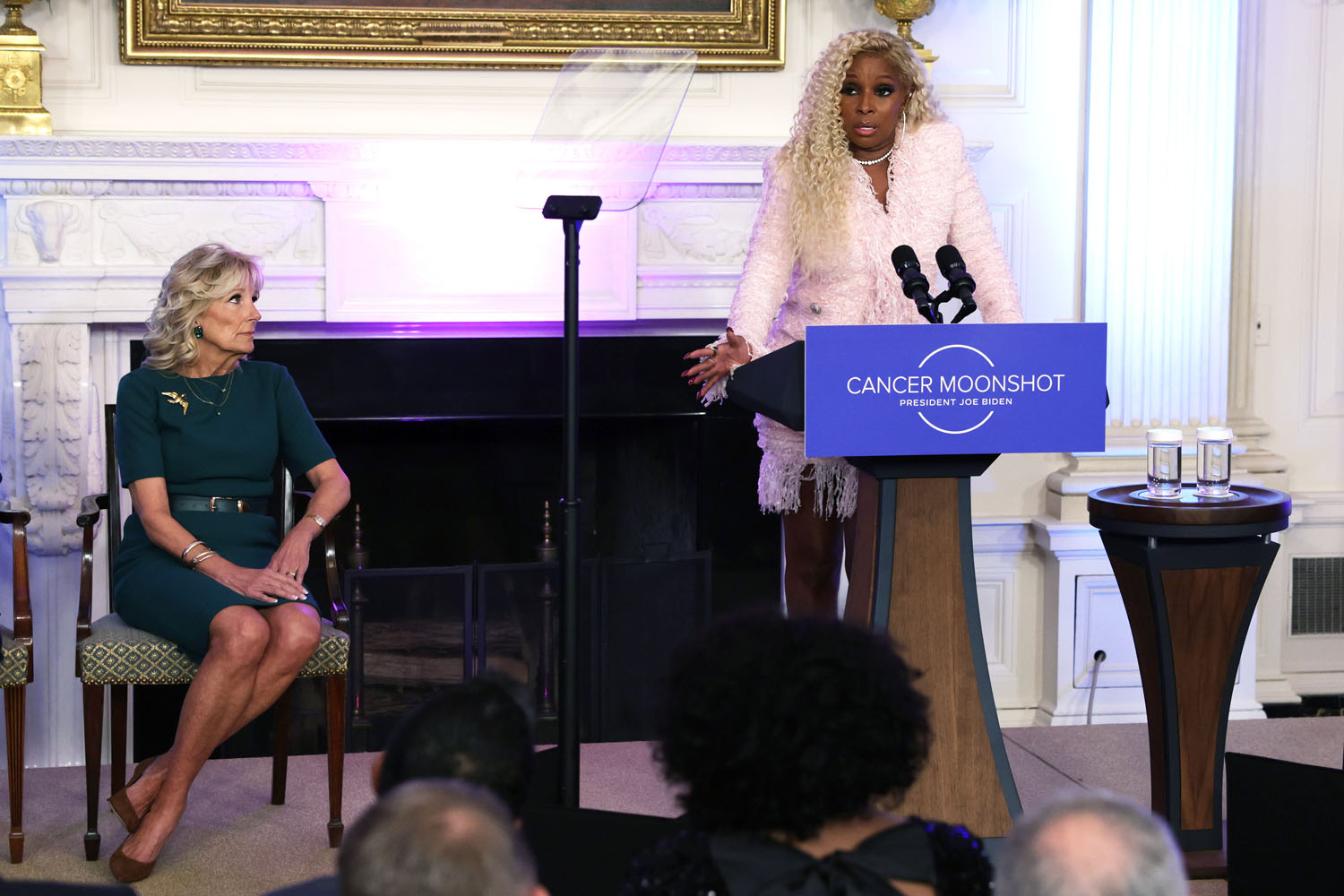 Yesterday, Mary J. Blige joined Dr. Jill Biden and members of the American Cancer Society at the White House to announce a series of national meetings on breast and cervical cancer, aimed at raising awareness for early detection and treatment of cancer in women. This is part of Dr. Biden’s relaunch of the “cancer moonshot” initiative, aimed at eliminating cancer in all its forms. It comes during breast cancer awareness month, and Ms. Blige spoke about the numerous family members she has lost to cancer: