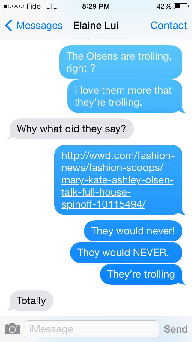 Here is the series of overexcited texts I sent Lainey when I saw the response the Olsens gave to the Women’s Wear Daily reporter who asked them about returning to Full House.