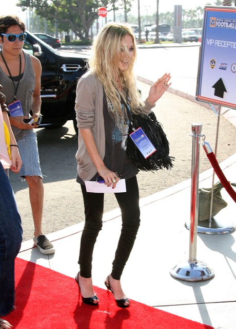 Anyway, here she is arriving at the Galaxy game Saturday, disheveled per usual and camera shy. You will note: the Olsens do not tip off the pappies as to their whereabouts, nor do they live for the cover of Us Weekly. They’re also way wealthier than Ebola and her sister… something Paris hates being reminded of and supposedly why she went after Greek Stav who is a f&cking tool.