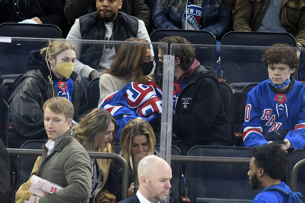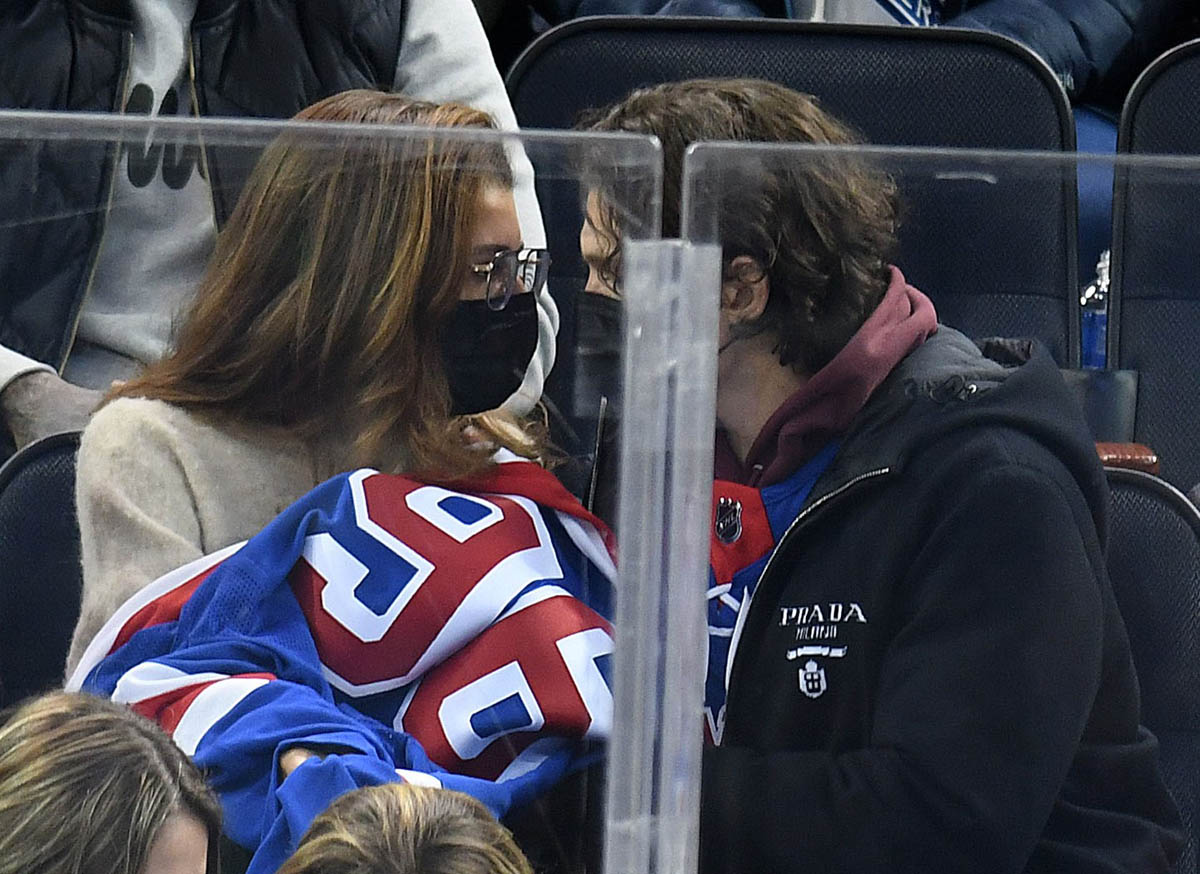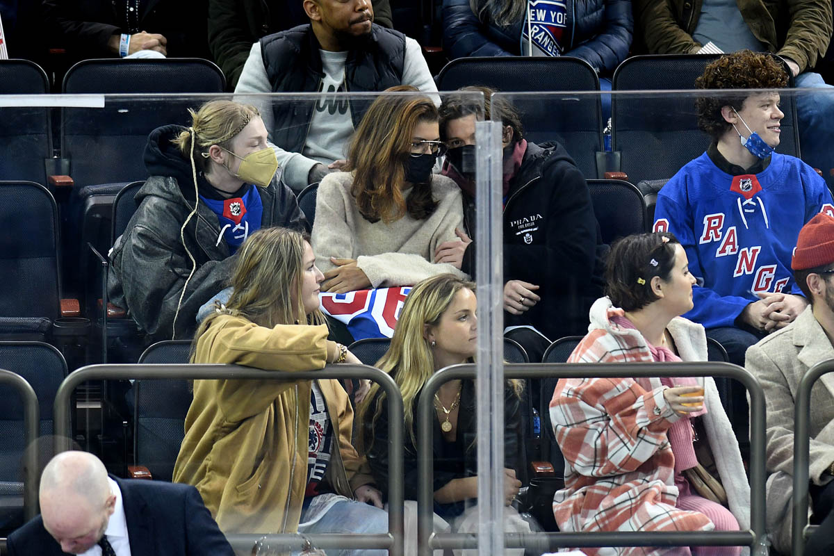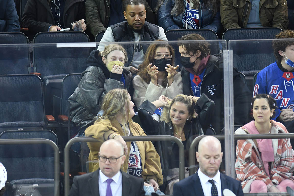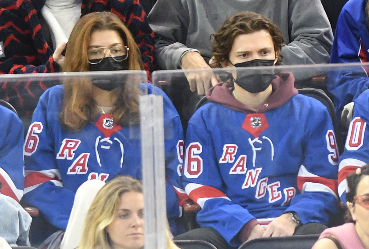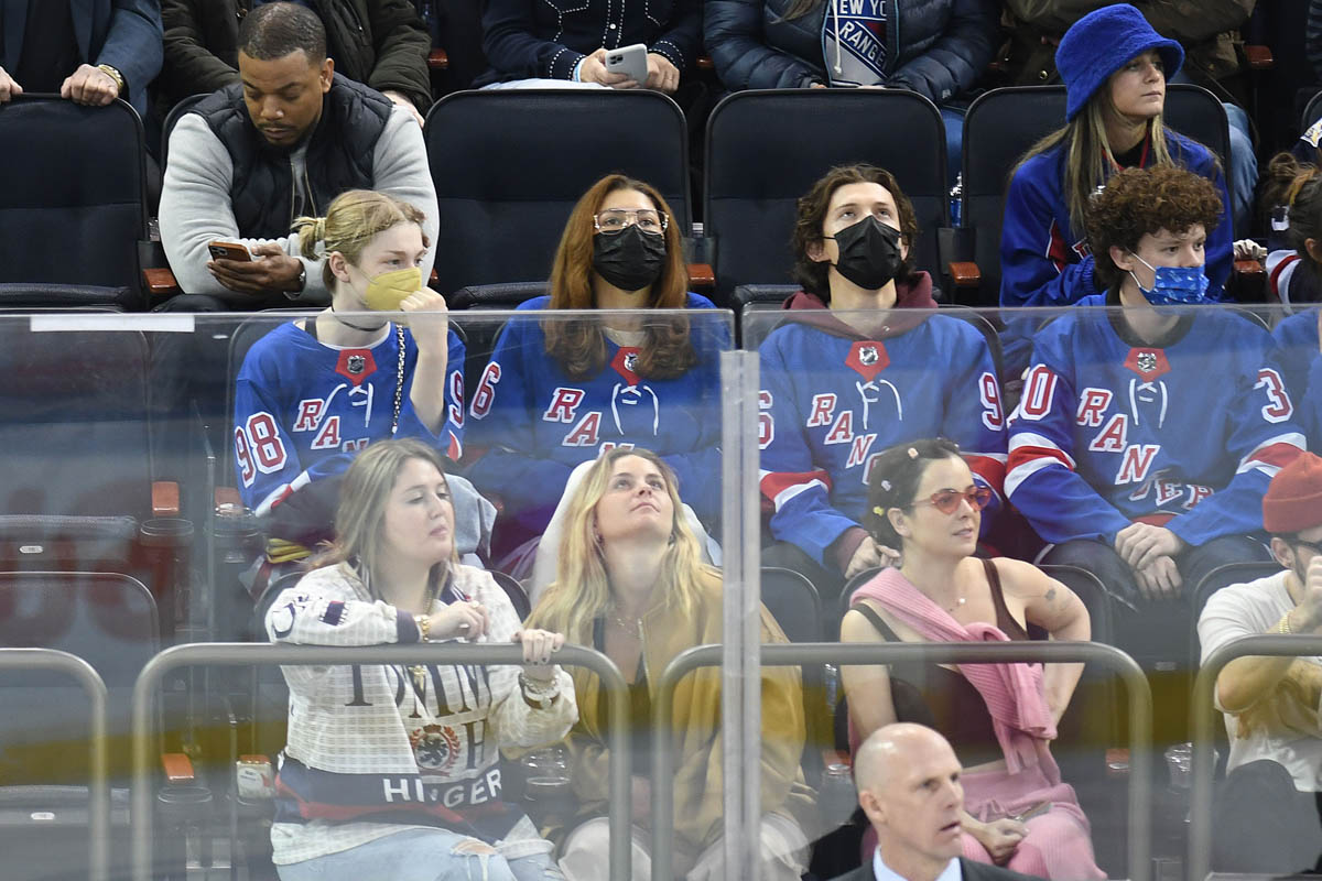 It isn’t quite like this with Tom and Zendaya because with Tomdaya, there is no squick factor but in some of these shots, it does feel like they’re the only ones in the arena but no one told his brother and Hunter Schafer. Also, it looks like the Rangers gave them each a jersey – and they decided to switch, with Z wearing Tom’s on the way out and Tom wearing hers. And their masks. Big-ups to the three of them for staying masked the whole time even though it’s optional at the venue.