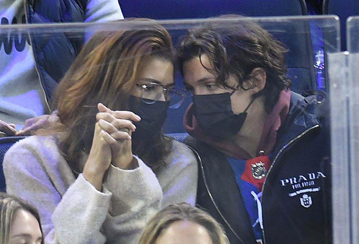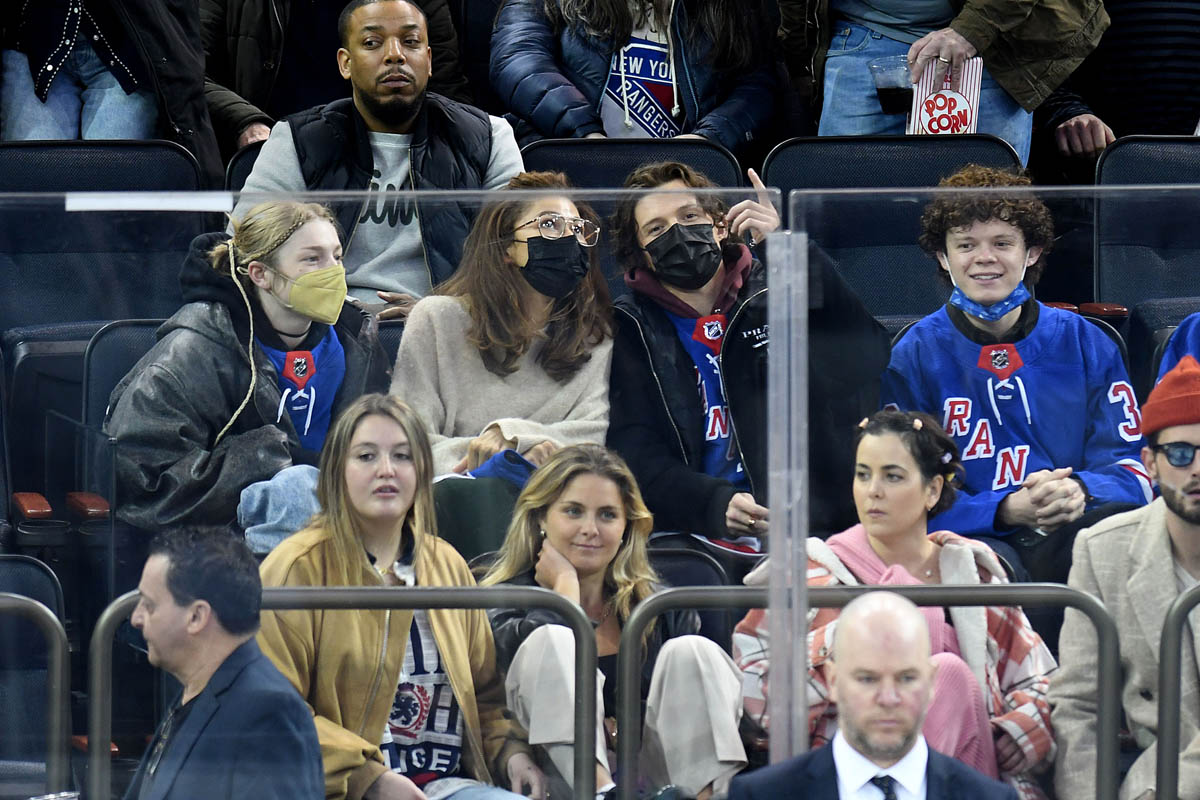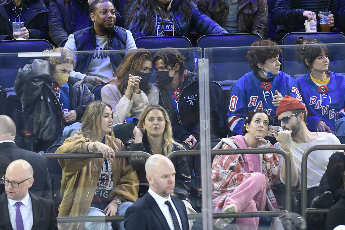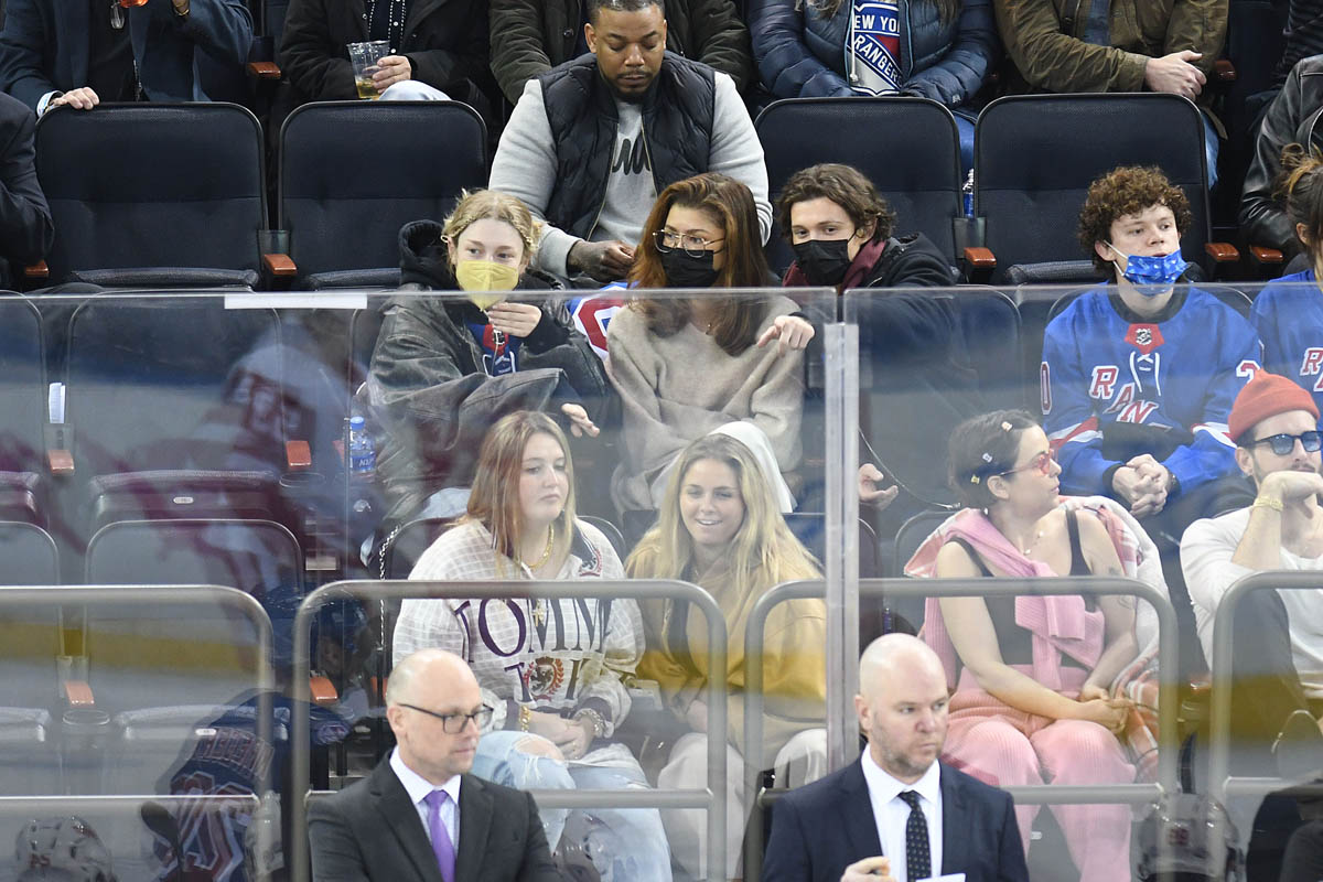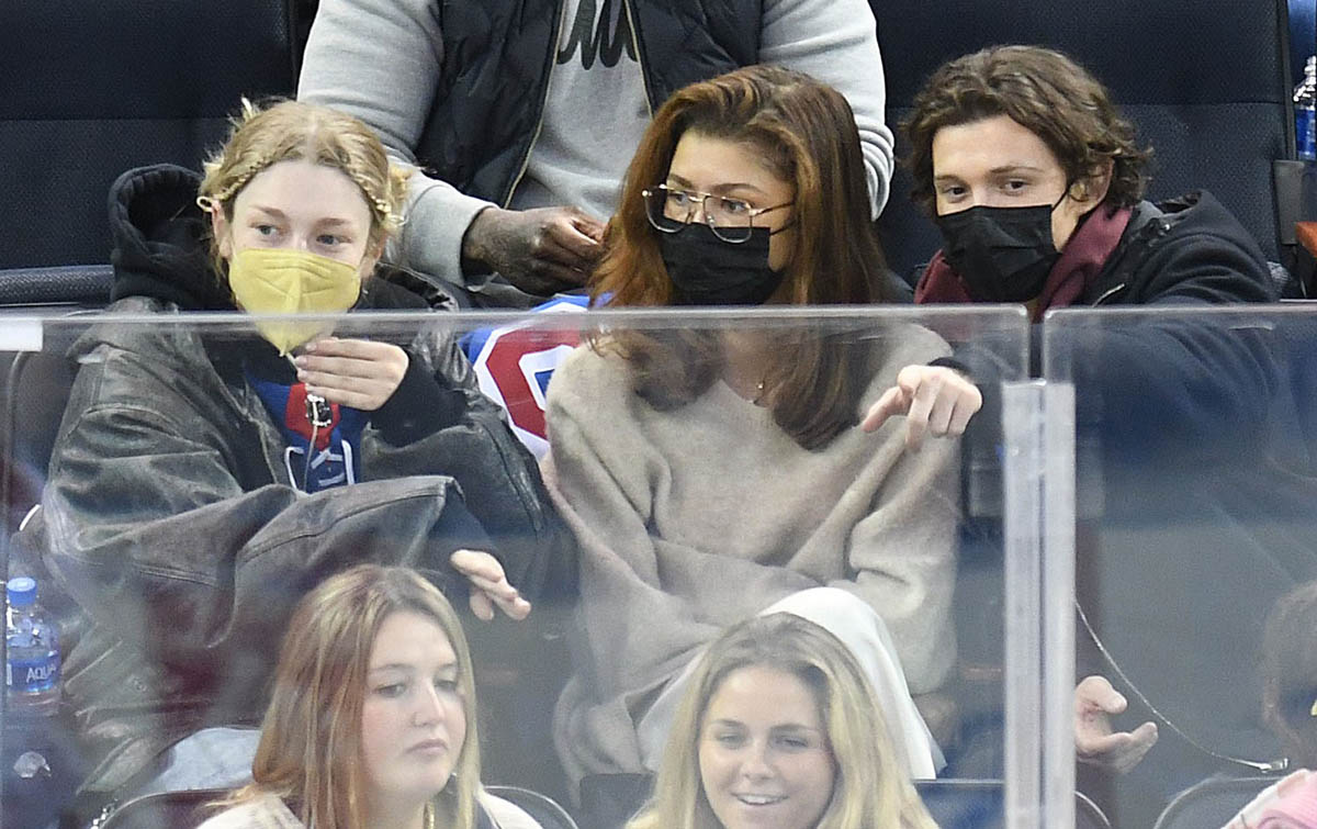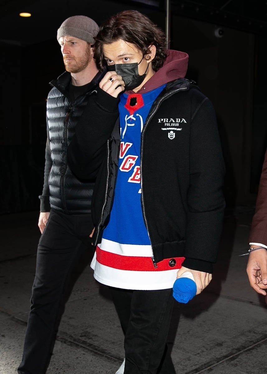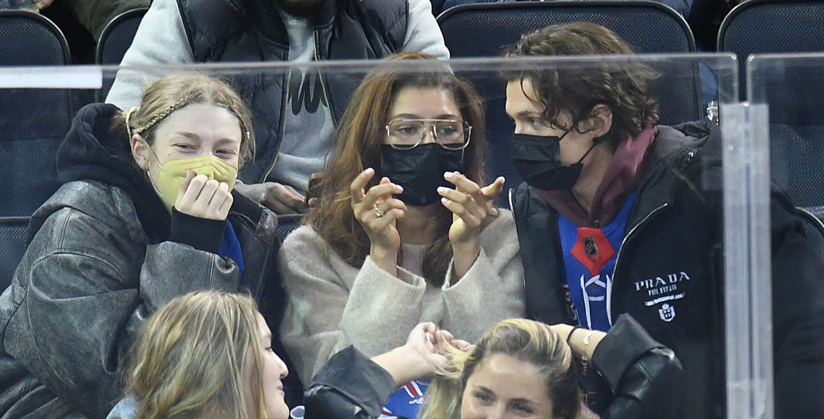 It isn’t quite like this with Tom and Zendaya because with Tomdaya, there is no squick factor but in some of these shots, it does feel like they’re the only ones in the arena but no one told his brother and Hunter Schafer. Also, it looks like the Rangers gave them each a jersey – and they decided to switch, with Z wearing Tom’s on the way out and Tom wearing hers. And their masks. Big-ups to the three of them for staying masked the whole time even though it’s optional at the venue.