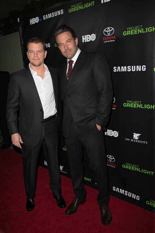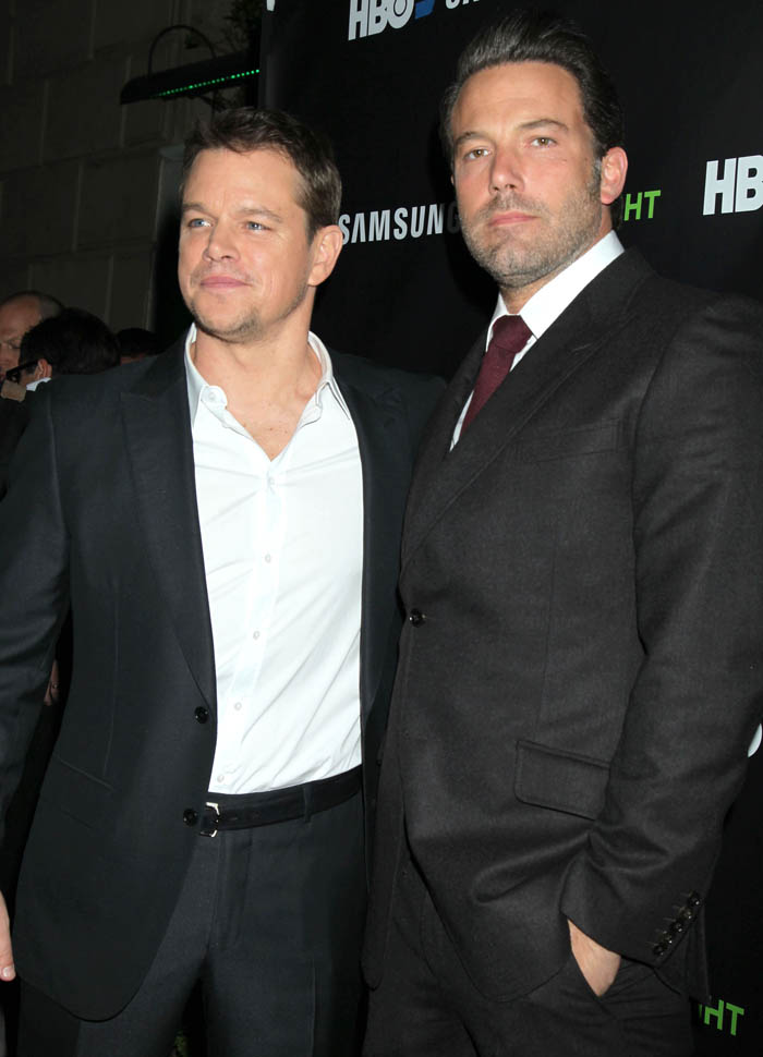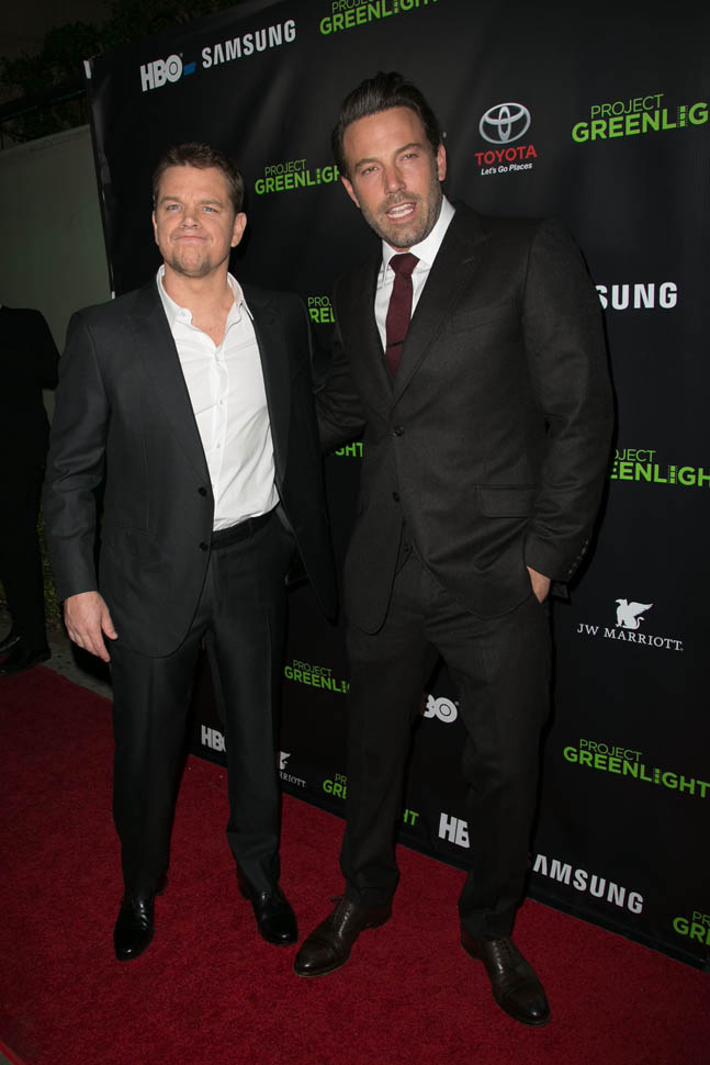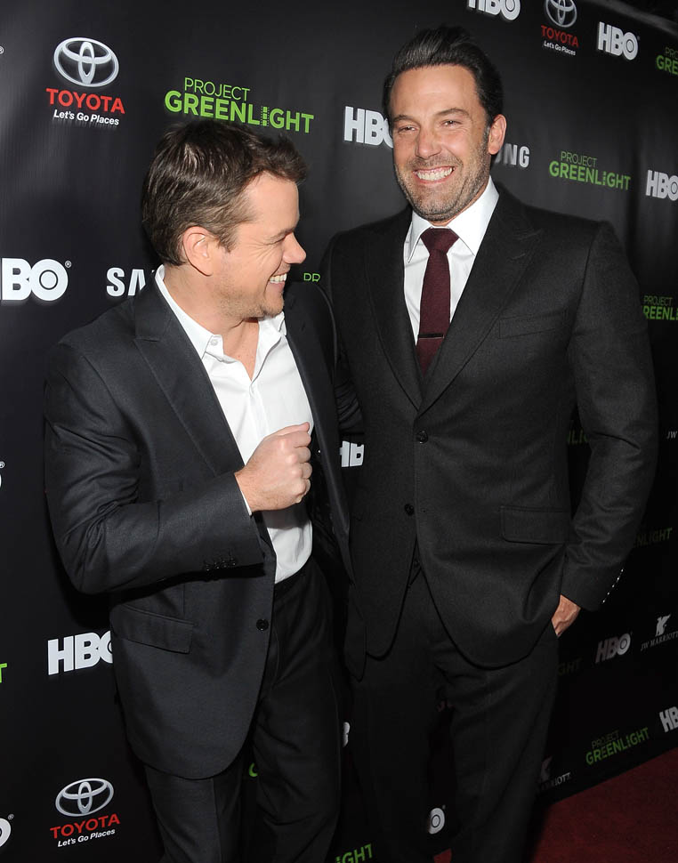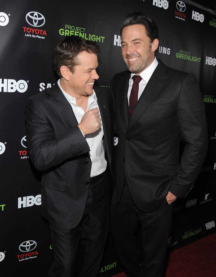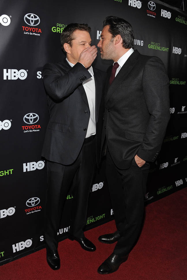 Matt and Ben were together again on Friday night at the Project Greenlight event for HBO. It’s not often they’re on a red carpet together. So when they show up, side by side, and being all Matt+Ben, like arm in arm and whispering jokes to each other and laughing their secret laughs, well, we eat that sh-t up. They are, and will always be, each other’s best date.