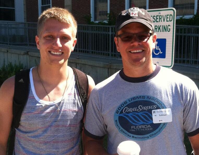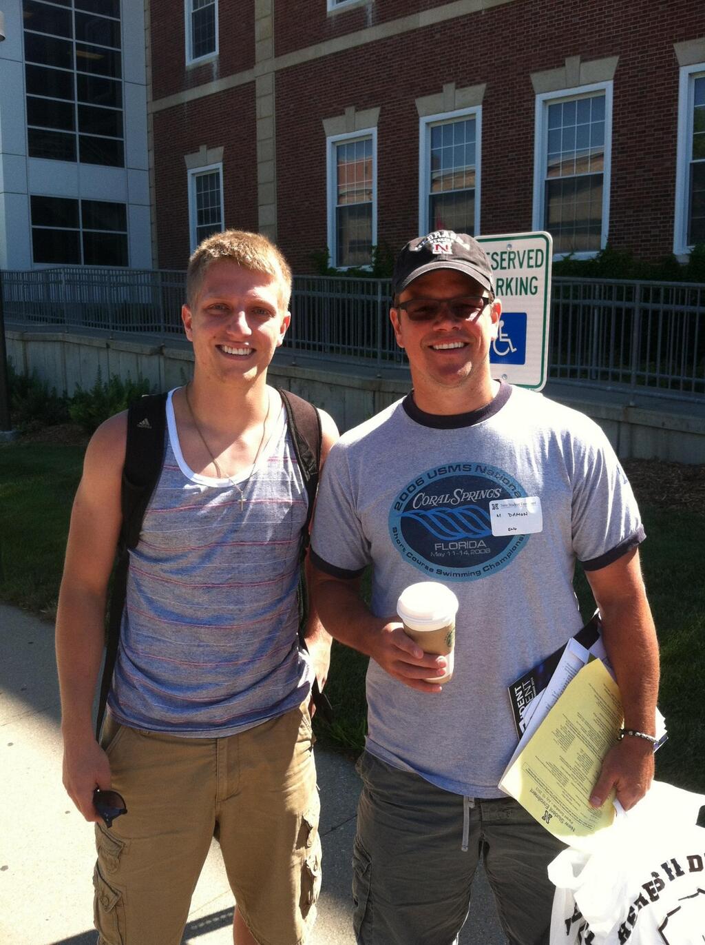 Matt Damon was at the University of Nebraska-Lincoln today for student orientation. Apparently he’s the “parent, guardian, or mentor” to a young man, reportedly his nephew. According to school officials, he asked to be given no special treatment whatsoever, preferring to take the campus tour as every other “parent, guardian, or mentor” does. With a name tag stickered to his shirt: M Damon.
