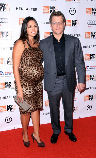 A bespectacled Matt Damon walked the carpet with wife Luciana at the screening of his new film Hereafter, directed by Clint Eastwood, which closed the New York Film Festival last night. Luciana, obviously, is pregnant with their 4th child. They are parents to three girls. And he is getting hotter to me as he gets older.