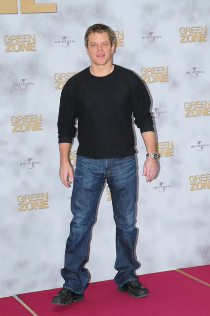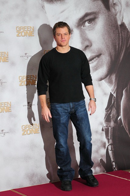 Last week he was working a weak ass pube stache – click here to revisit. “Thanks God” it’s gone now. Here’s Matt Damon in Berlin promoting Green Zone looking much better, very handsome, especially with that hint of grey.