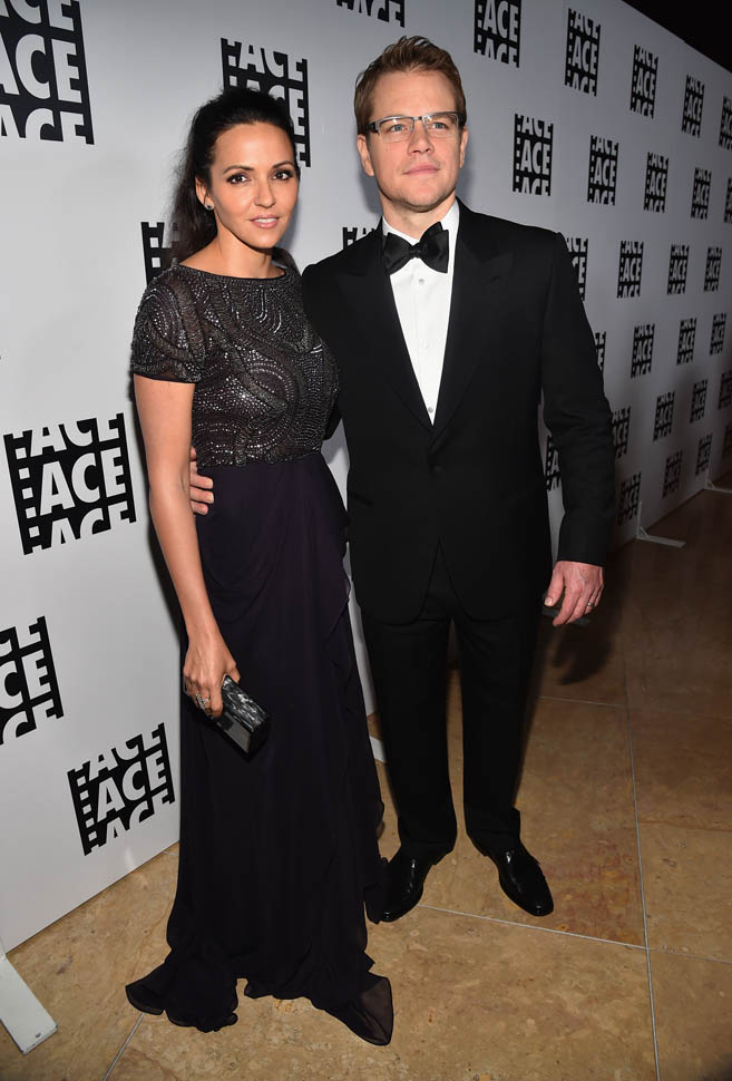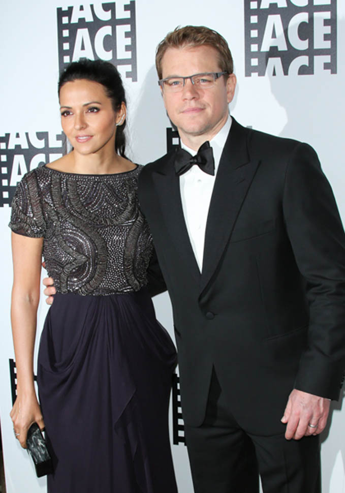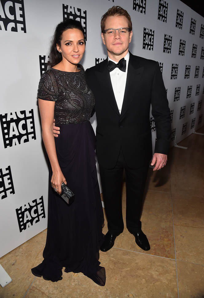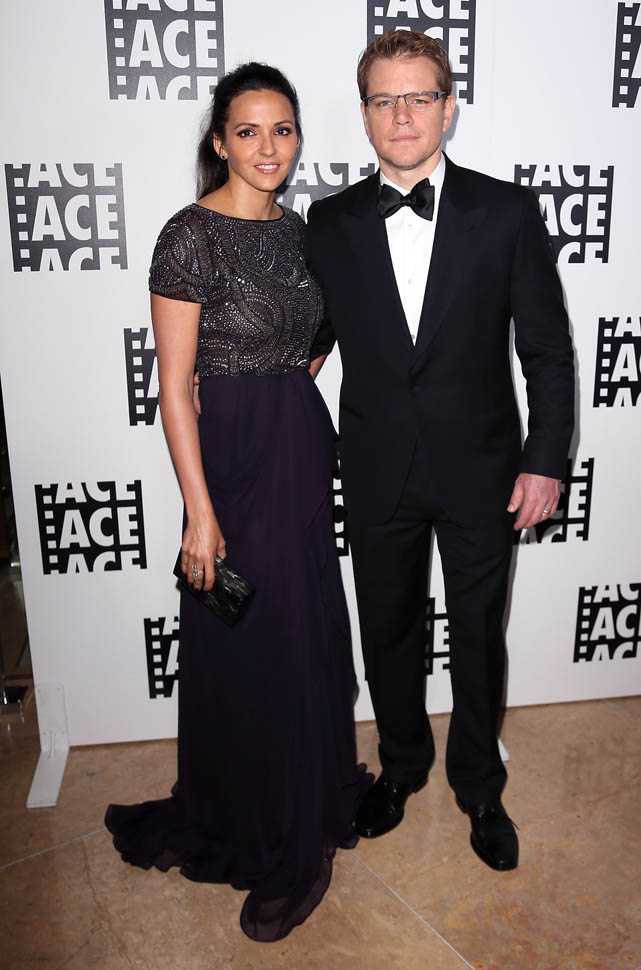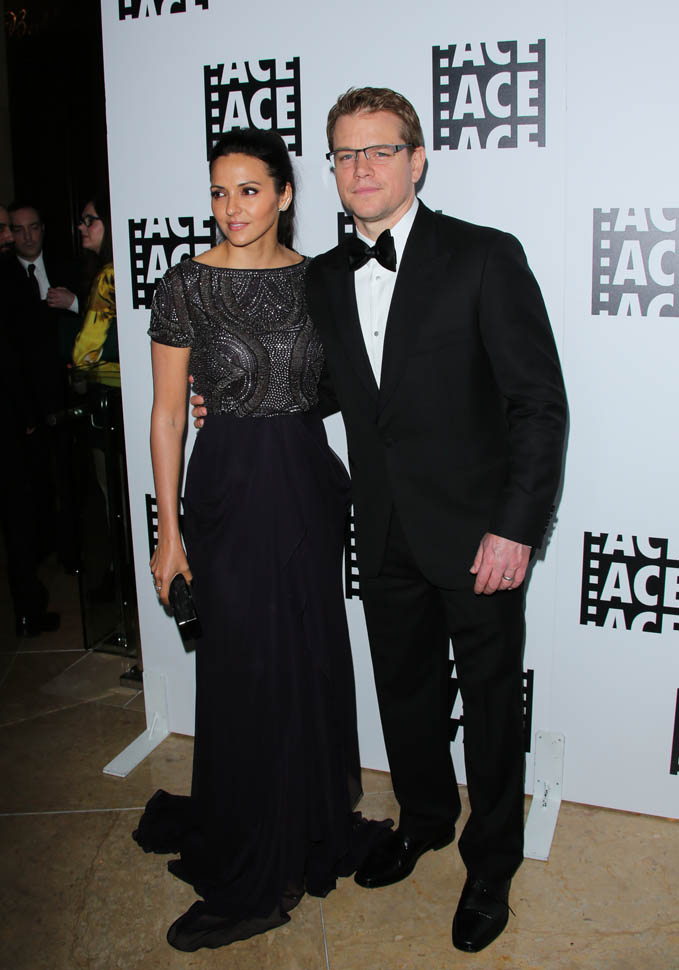 Here’s Matt Damon with wife Luciana at the ACE Awards on Saturday (George Clooney was there too). On Super Bowl Sunday, Matt was at Jimmy Kimmel’s with Ben Affleck and Bill Simmons and probably John Krasinski although he didn’t make it into this photo: