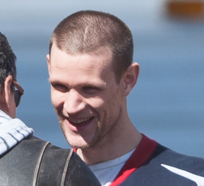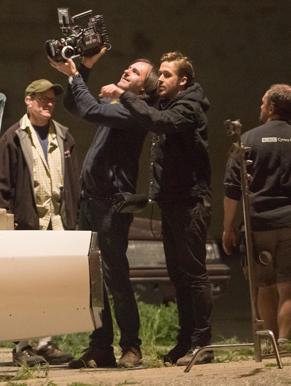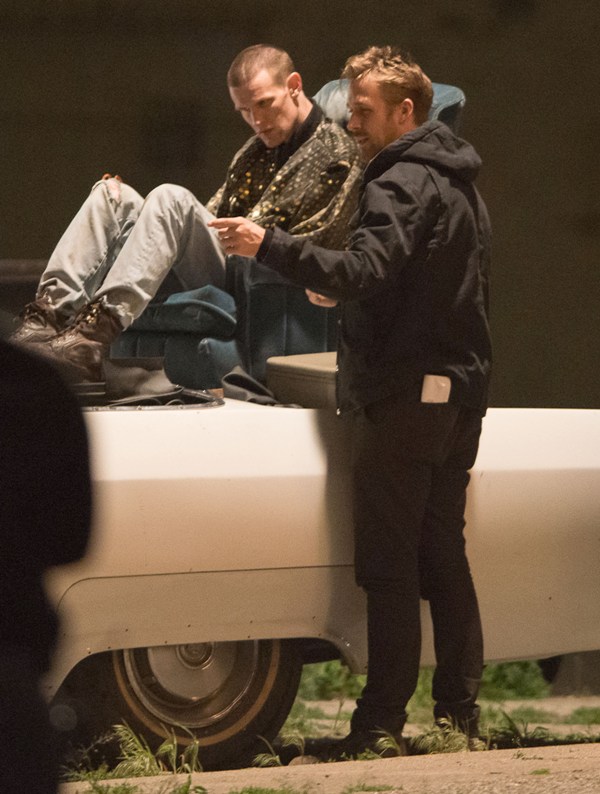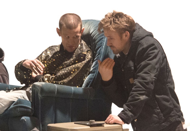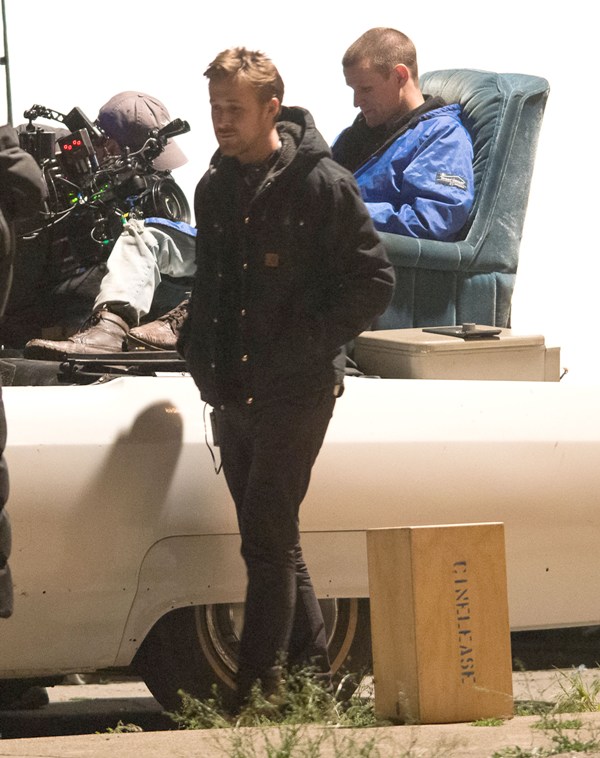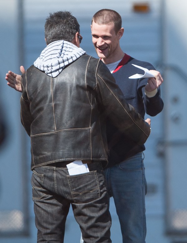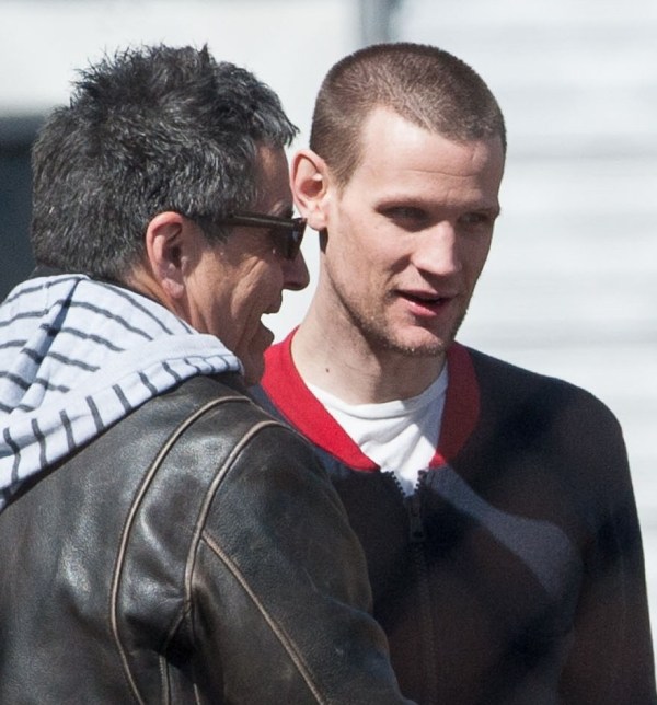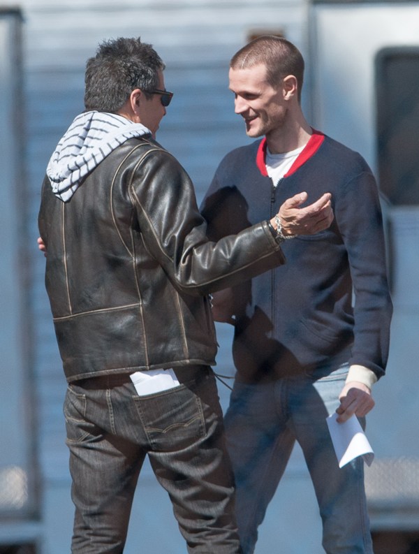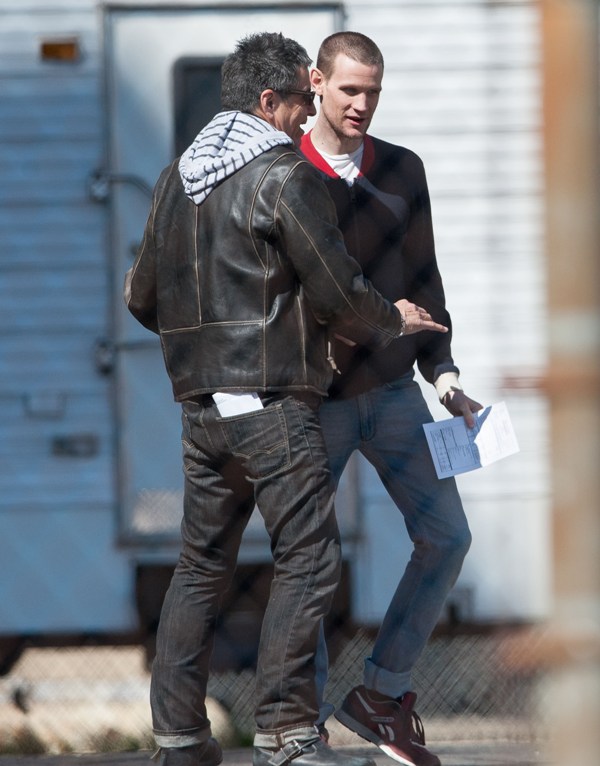 I know you’re out there, Matt Smith/Dr Who fans. And now you get to make out with the Ryan Gosling fans. Here they are, in Detroit on the set of Gosling’s How To Catch A Monster the other day. As you can see, Ryan is helping Matt “find the motivation”. Part of that motivation came from a total head buzz. I like it. Christina Hendricks was also assisted in motivational searching. She was not required to change her hairstyle.