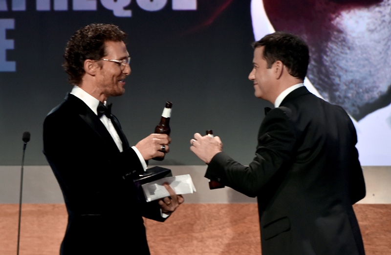 Nolan was there to celebrate McConaughey. He joined him onstage. With beers. And his daughter too. We’re crowding around the table backstage at The Social right now trying to figure out what the label is. I’m not a beer expert. When I do drink beer I go euro. I thought at first that it was Miller Lite. If so, gross.