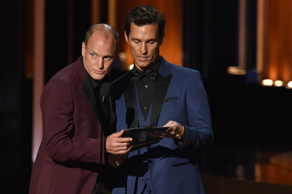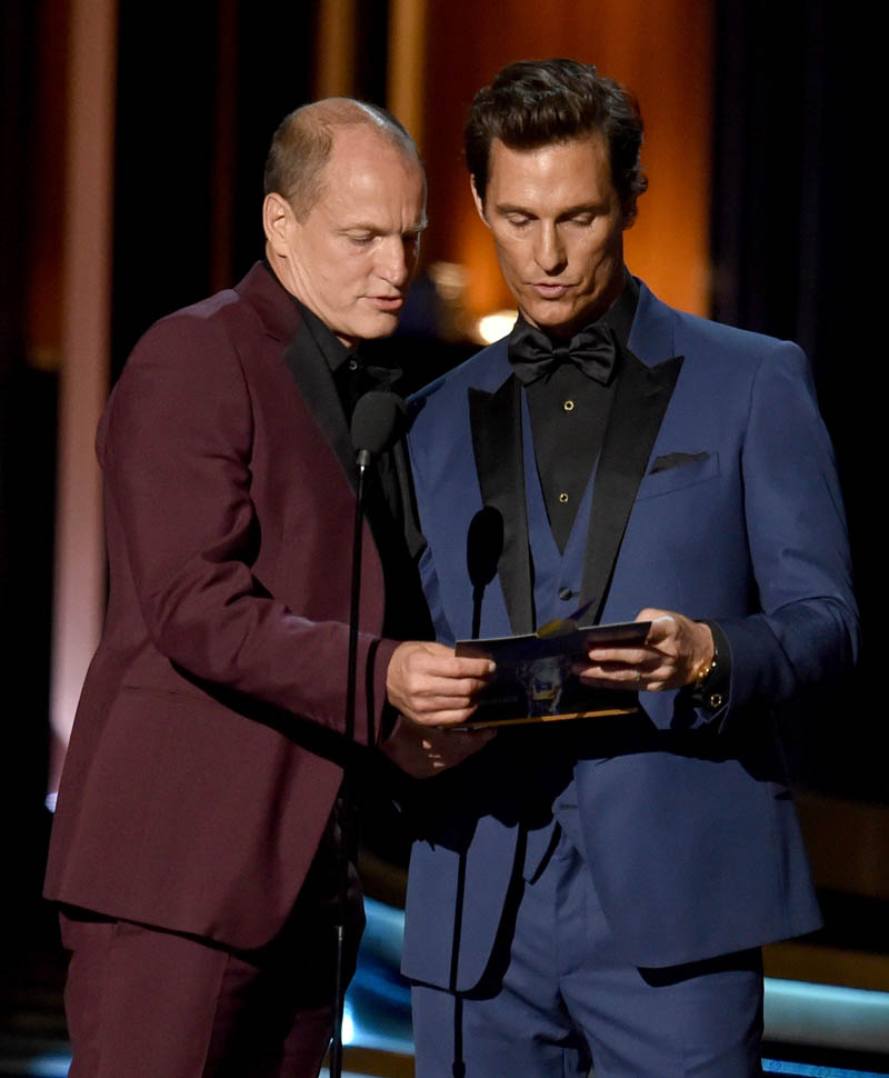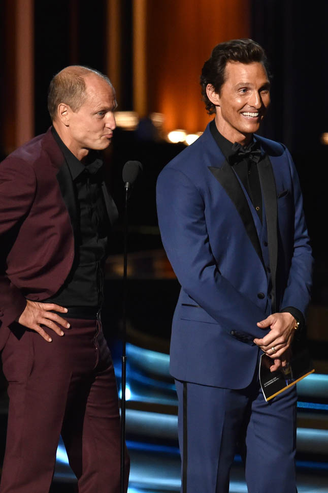 Woody Harrelson wore it best last night. I either forgot or never knew in the first place that he could do clothes. But when he walked out my first thought was oh hey now Woody can wear the sh-t out of a pair of pants. Please. The right answer here is that you would totally have sex with Woody Harrelson before Adam Levine. It’d be a lot more fun. And that’s what many of you have been emailing me to say: that these two seem like a lot of fun to be around. Sure. But you’ll always be in the audience, you know? Matthew and Woody were the high school seniors last night, up there on stage receiving worship from the freshman, giving hope to the sophomores. “One day, maybe you’ll be as cool as we are…but can you really be as cool as we are?”