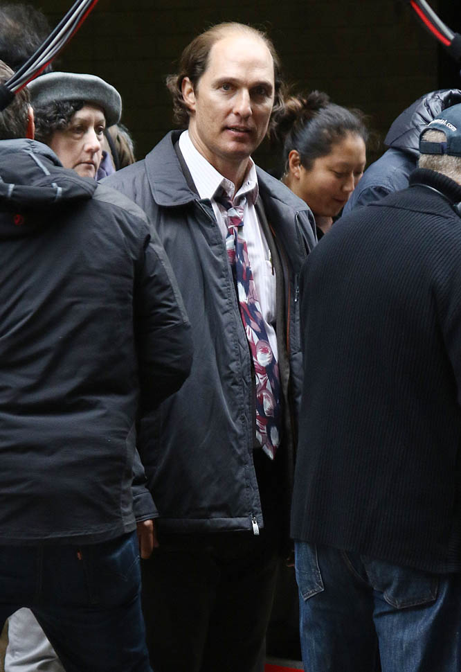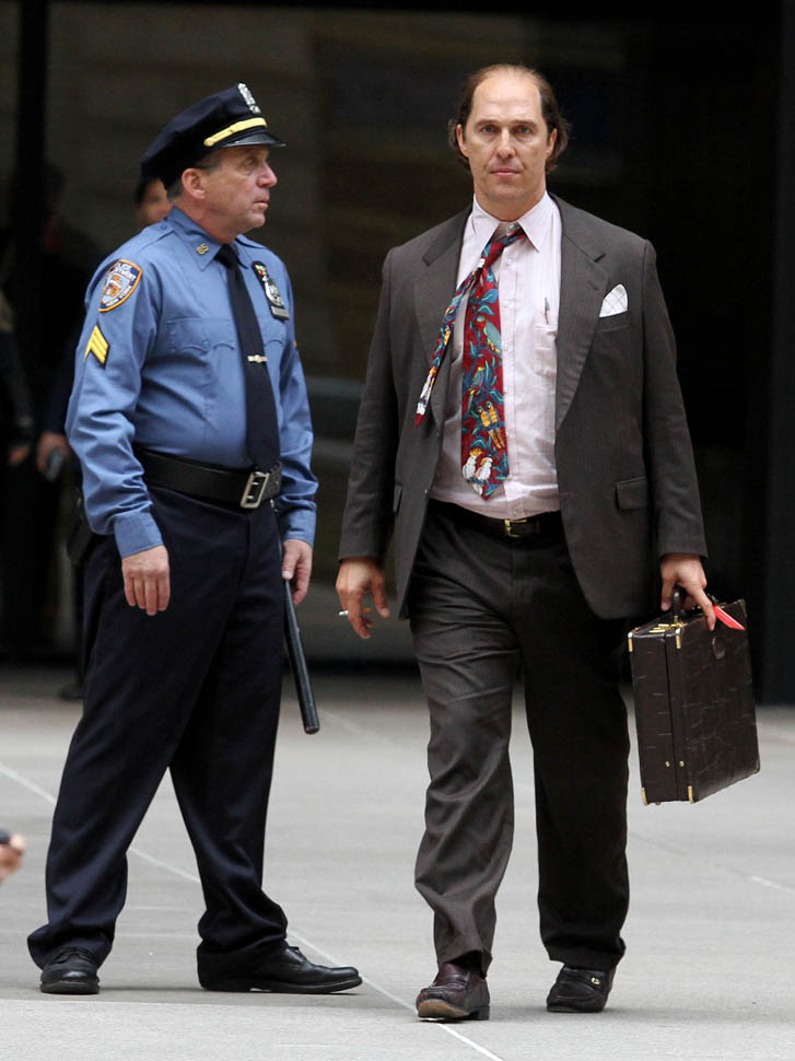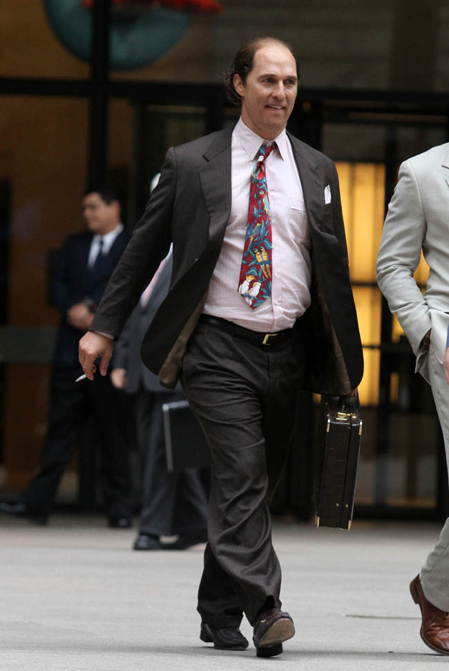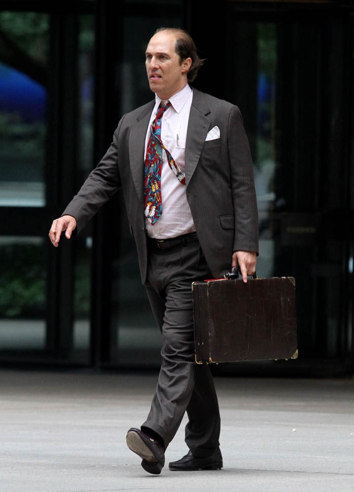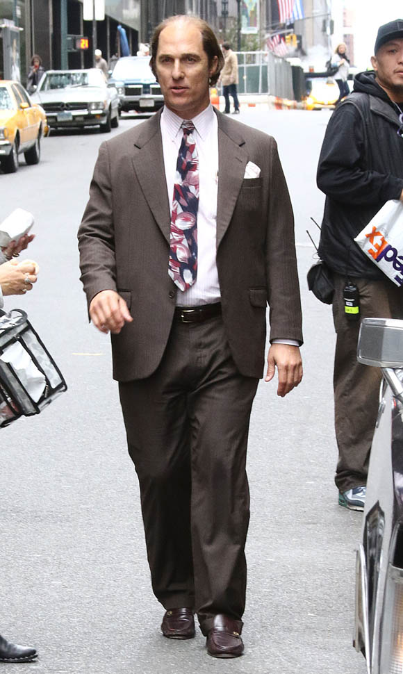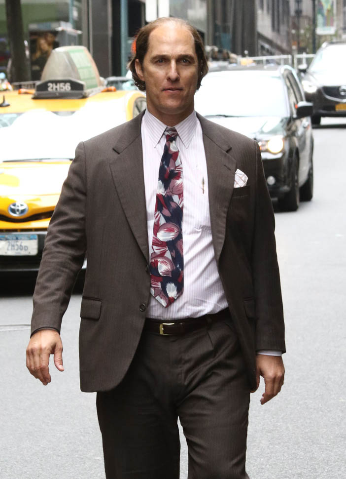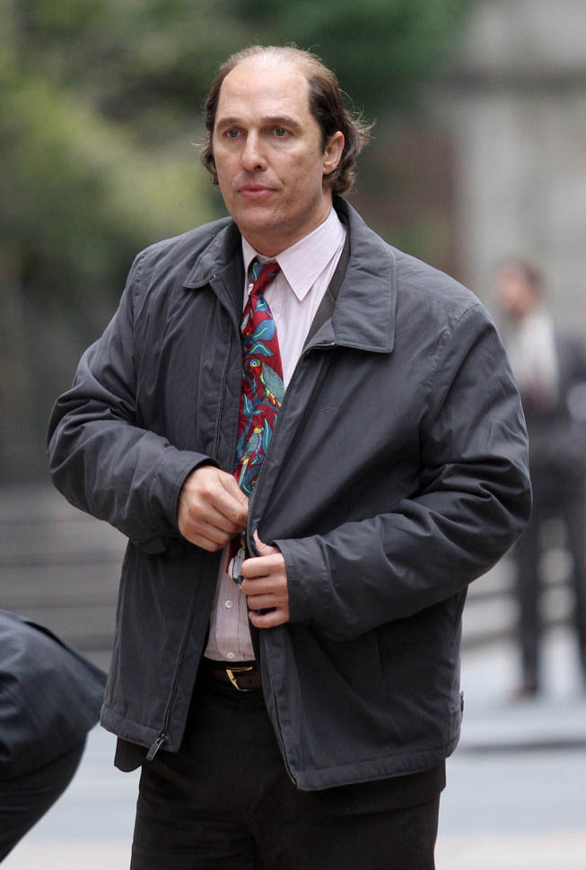 Matthew McConaughey was in New York this weekend shooting Gold. They’ve been working on the film since July and are expected to wrap soon. Matthew plays Kenny Wells, always looking for his big break, and ends up partnering with Edgar Ramirez on a gold hunt in Indonesia. They’re hoping to release it next year. And maybe appeal to the old ass Oscar voter who can relate to Matthew’s glowing pate?