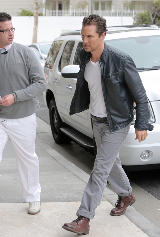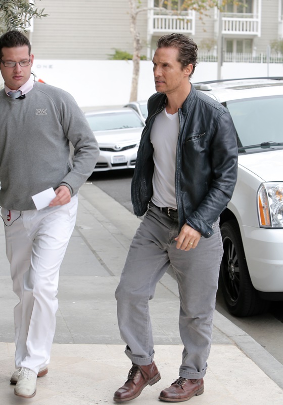 Matthew McConaughey was photographed heading to a meeting yesterday. Almost all the experts are predicting he’ll take Best Actor on Sunday night. He has a lot going for him. It’s been a 6 month long campaign and he’s played every step perfectly. And, conveniently, he’s also doing great work on True Detective. For the last 6 or 7 weeks now, McConaughey’s been on HBO every night in the show everyone is talking about. Some things just work out heavily in one person’s favour. The voters can’t escape him – in a good way. So it’s like they’re voting for him in two performances. Can you imagine if he goes on to win the Emmy too? Matthew McConaughey holding two major awards in film and television in the same six month period? Again, I want you to hear Leonardo DiCaprio’s voice if this happens. HIM!? REALLY?!