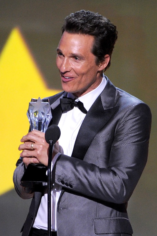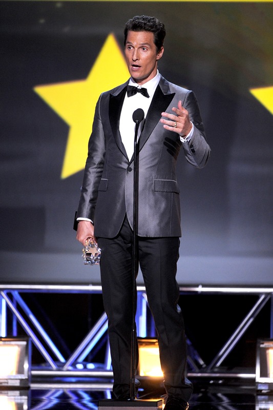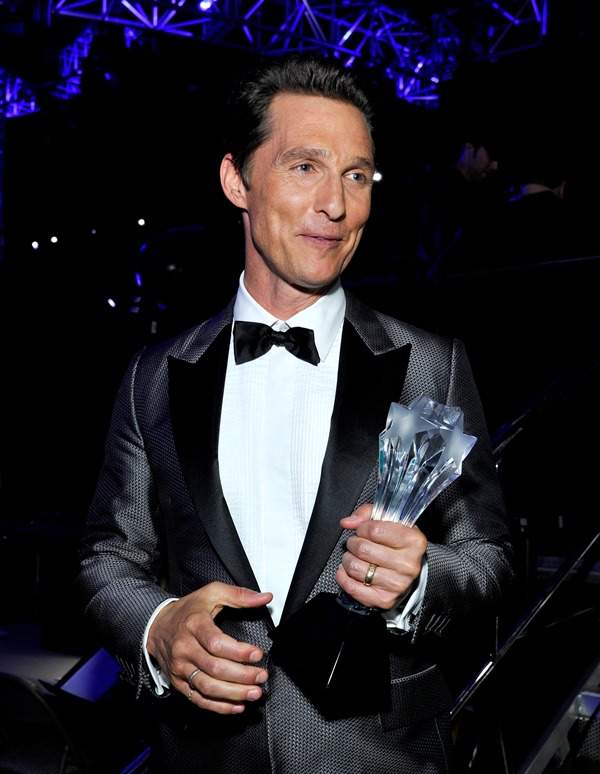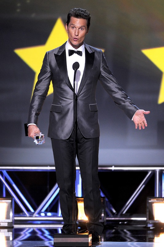 It’s not really a song. But everyone seems to be singing it. And wanting to hear it. And we heard it last night when he won Best Drama Actor at Critics’ Choice, presented by Jessica Chastain, who threw out an “alright, alright, alright” when she opened the envelope and announced his name. I think Jared Leto may have included one during his acceptance speech too – a better one than what he gave at the Globes.