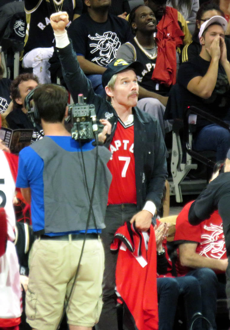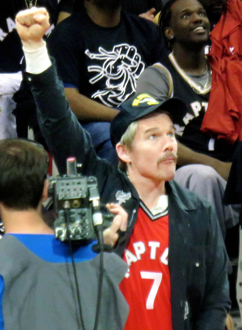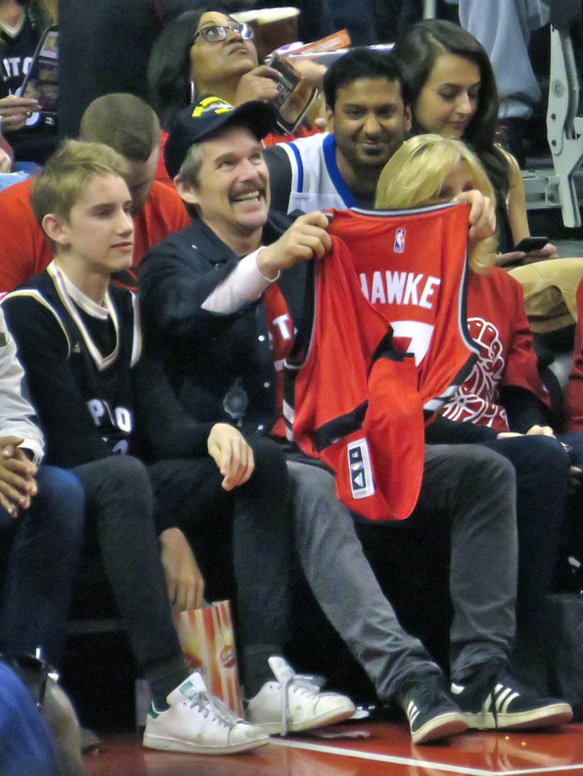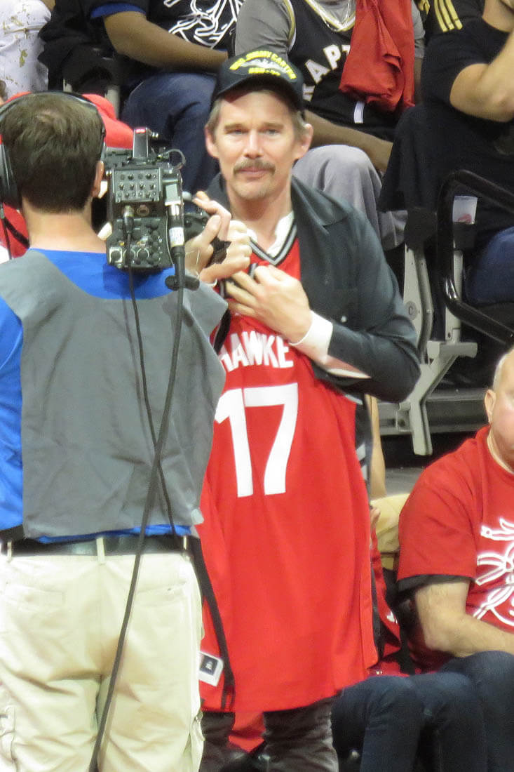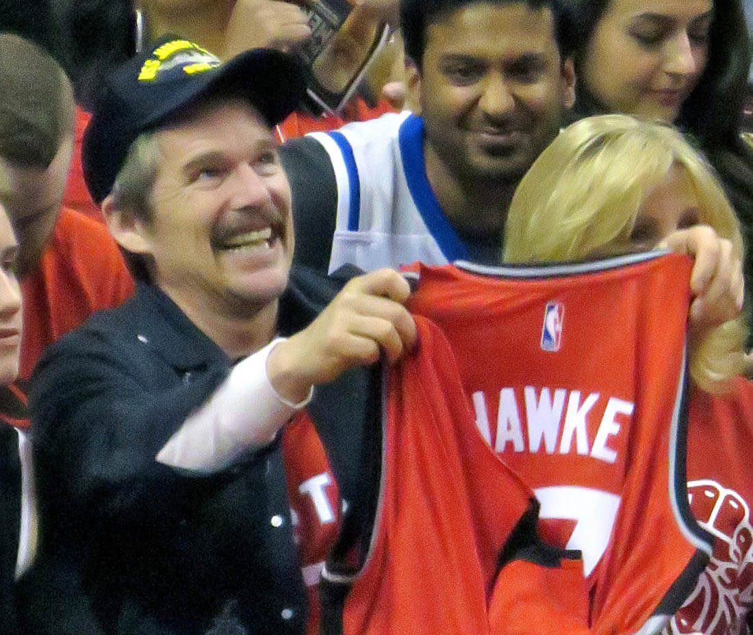 Attached: Ethan Hawke at a Toronto Raptors playoff game over the weekend. In town to shoot Stockholm with Noomi Rapace (and his Born to be Blue writer-director Robert Budreau), he received an honourary "Ethan Hawke" jersey.
