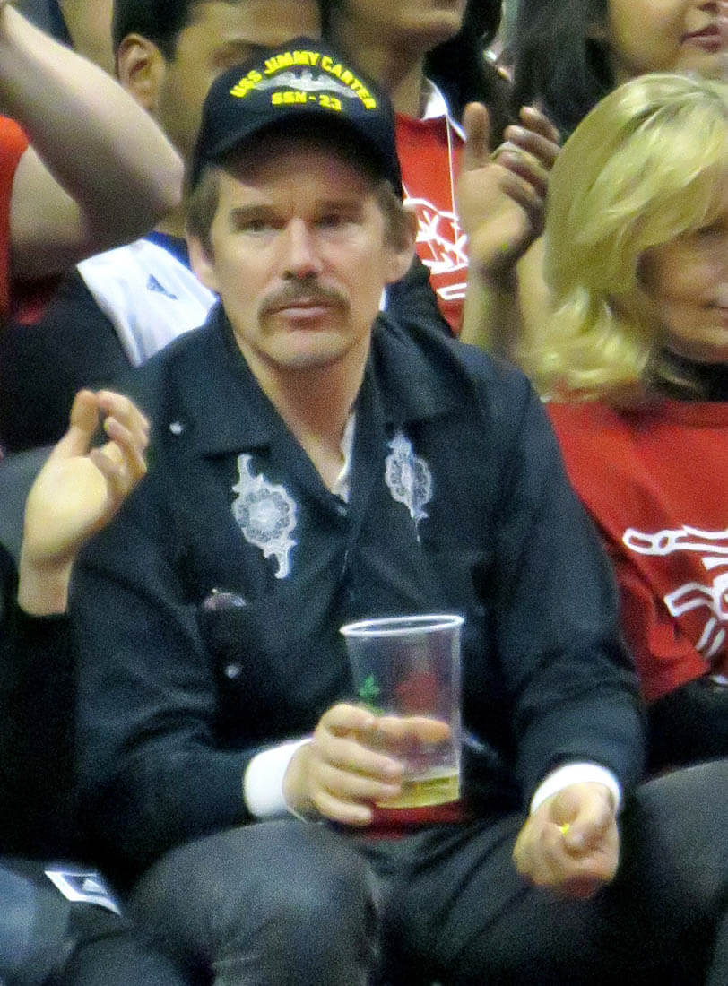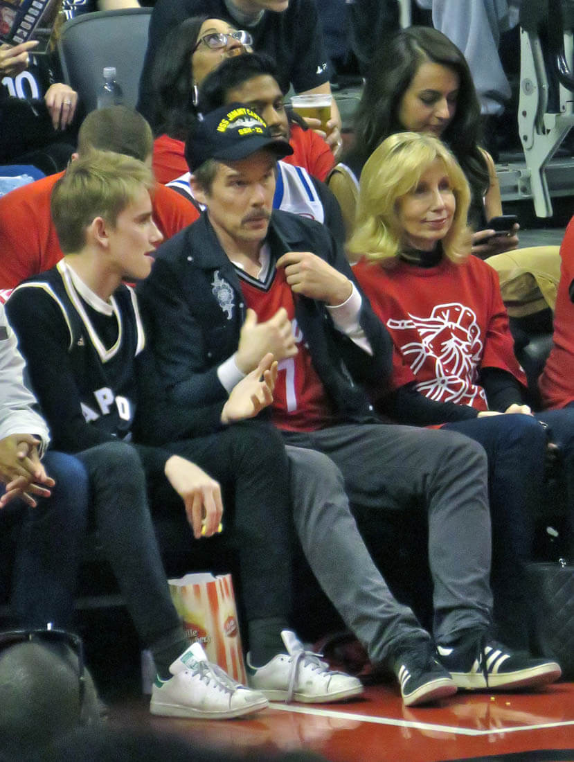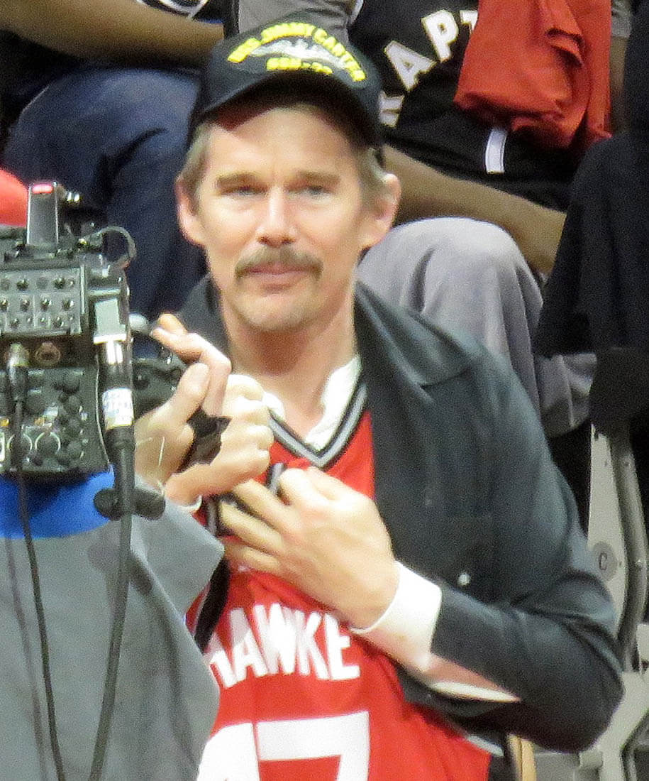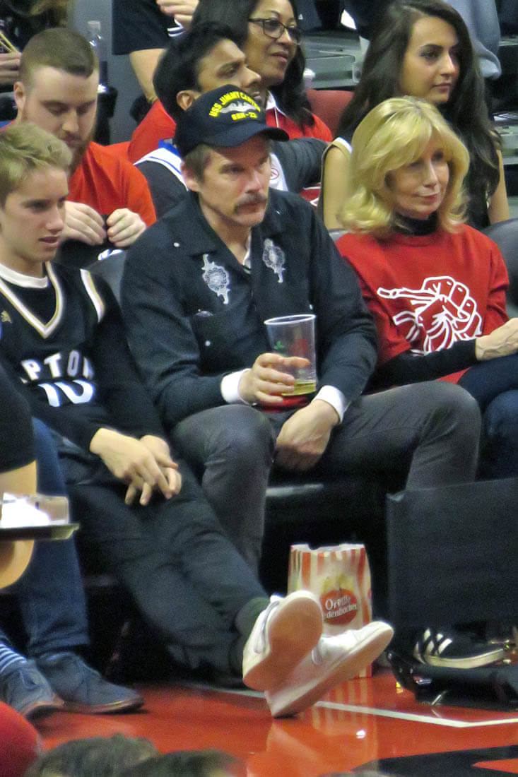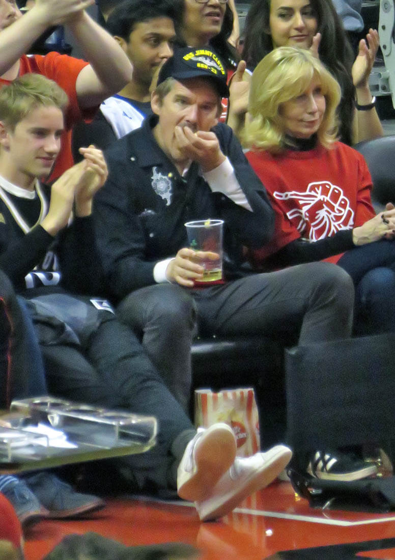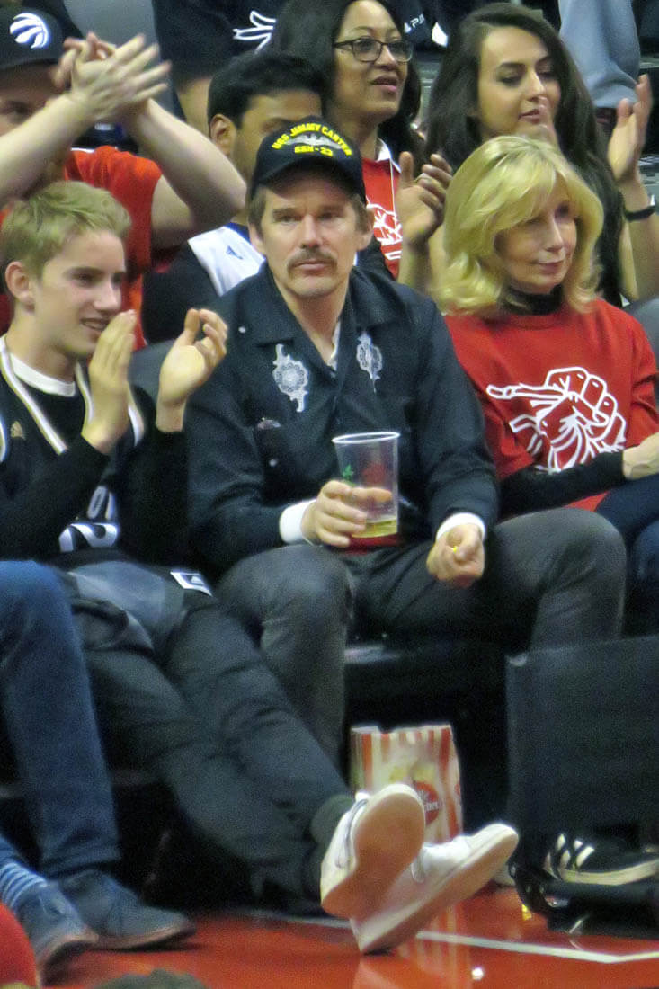 Attached: Ethan Hawke at a Toronto Raptors playoff game over the weekend. In town to shoot Stockholm with Noomi Rapace (and his Born to be Blue writer-director Robert Budreau), he received an honourary "Ethan Hawke" jersey.