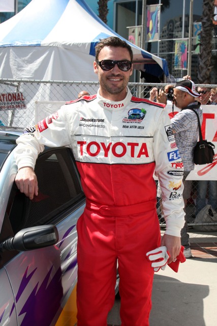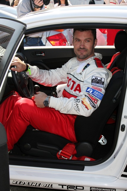 Megan’s on again off again fiancé Brian Austin Green took first place at the Toyota Celebrity Pro Race at the Long Beach Grand Prix on Saturday. She was there to cheer him on. See? Look at her. It doesn’t look real does it? It’s like a pretend face. Like some random bitch holding a sign in front of her head from a cutout magazine. It’s freaking me out.
