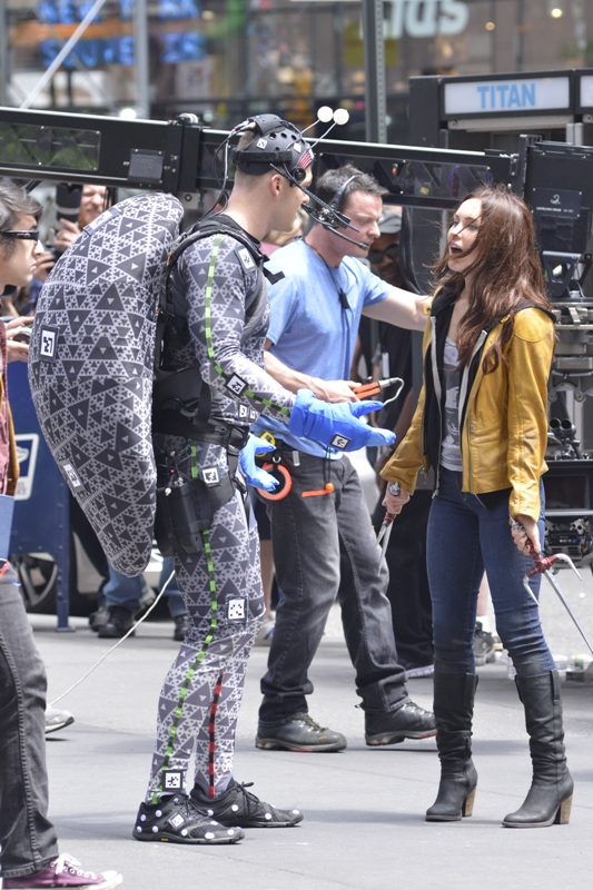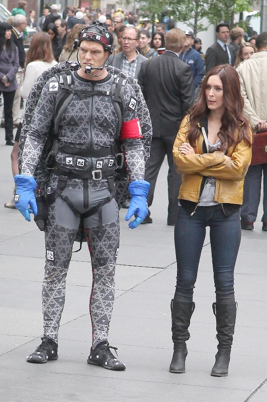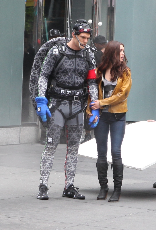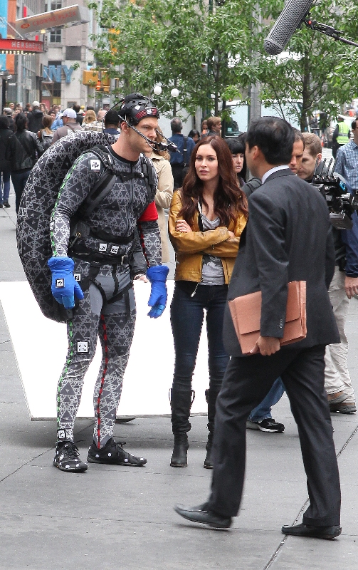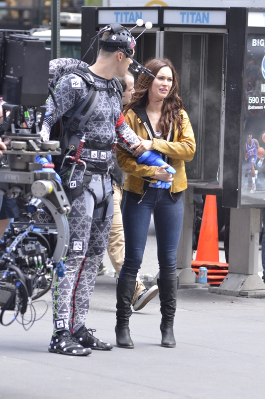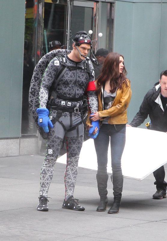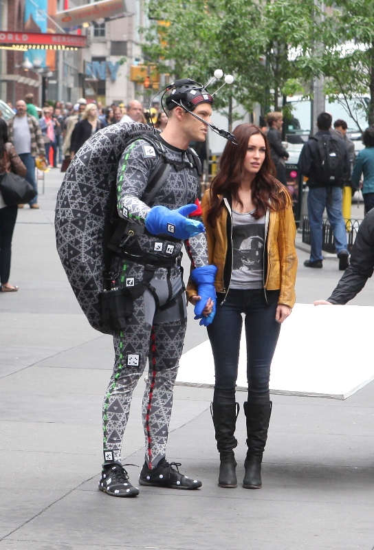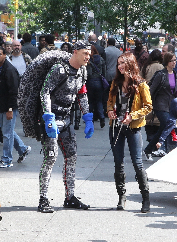 Check out Megan Fox yesterday in New York shooting Michael Bay's Teenage Mutant Ninja Turtles with co-star Alan Ritchmon. As you can see, he's wearing the framework of a turtle shell on his back. And then they'll add the rest in post. Which doesn't make it any less ridiculous. What's most ridiculous is that there can be 3 of these -- come on, two sequels at least, right? -- but no movies that are "too gay".