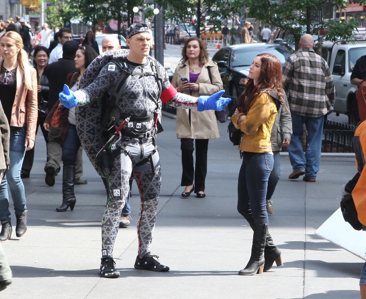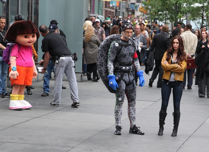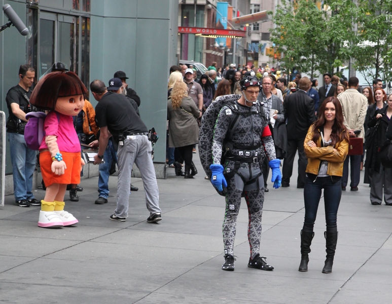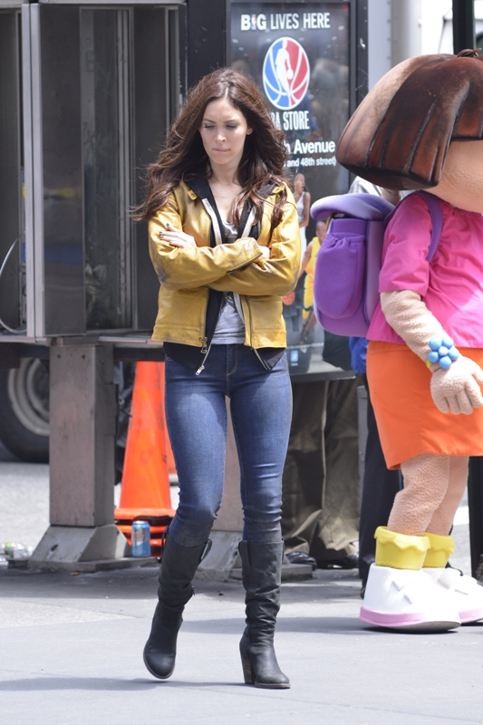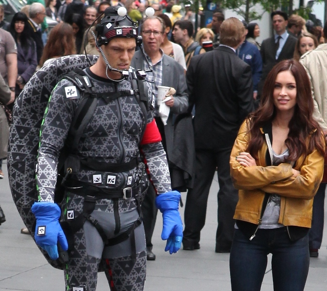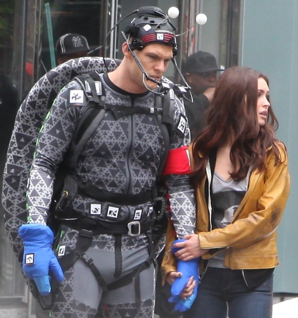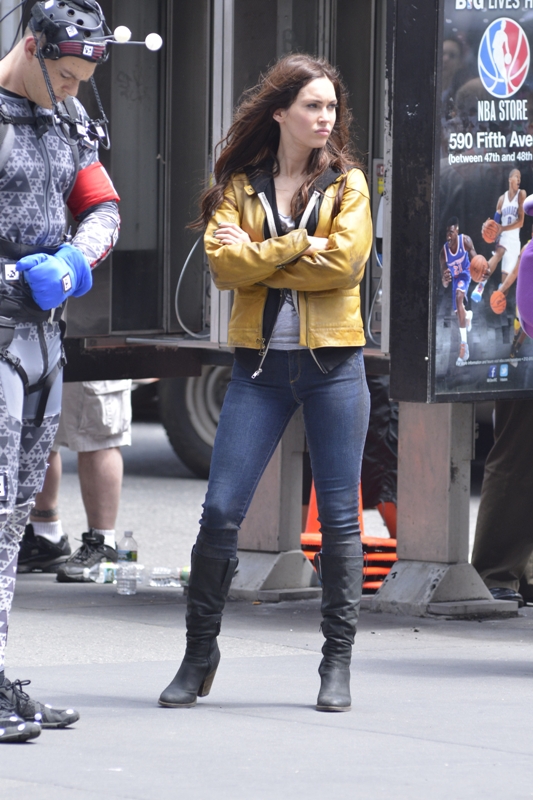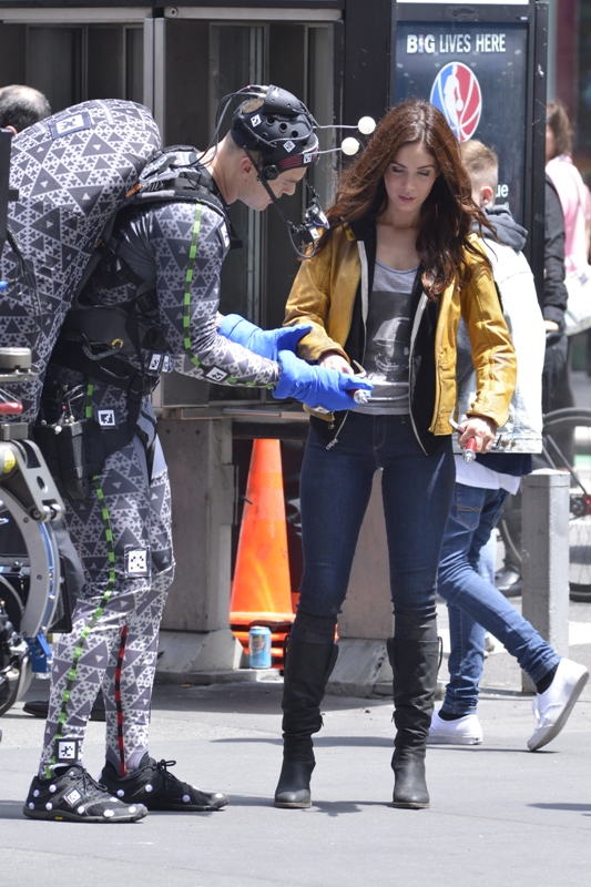 Check out Megan Fox yesterday in New York shooting Michael Bay's Teenage Mutant Ninja Turtles with co-star Alan Ritchmon. As you can see, he's wearing the framework of a turtle shell on his back. And then they'll add the rest in post. Which doesn't make it any less ridiculous. What's most ridiculous is that there can be 3 of these -- come on, two sequels at least, right? -- but no movies that are "too gay".