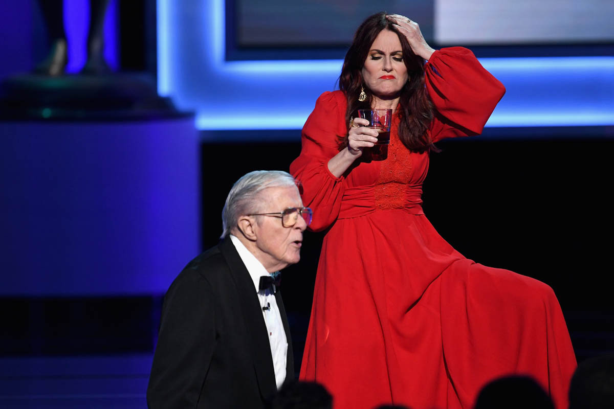 Maybe that’s why her dresses were so bold. After buying her own red carpet gown because designers were not sending her options—which, really? STILL? Fashion designers, get your sh-t together, this is a bad look FOR YOU—she bought a black and gold McQueen online. Her red carpet dress is my favorite of her three looks of the night, but once inside she committed to bold gowns. Her first dress was fuchsia sequins, and her second was cherry red. There was no mistaking Megan Mullally on stage. Given she didn’t actually get to spend much time up there, that’s a pretty smart way to make the most of the opportunity. Make sure they can see you, and make sure you’re memorable. I would like to know if the dress selection was intentional once she realized she was not going to get to change five times (Anne Hathaway wore seven gowns as the host of the Oscars, eight if you count her red carpet dress).