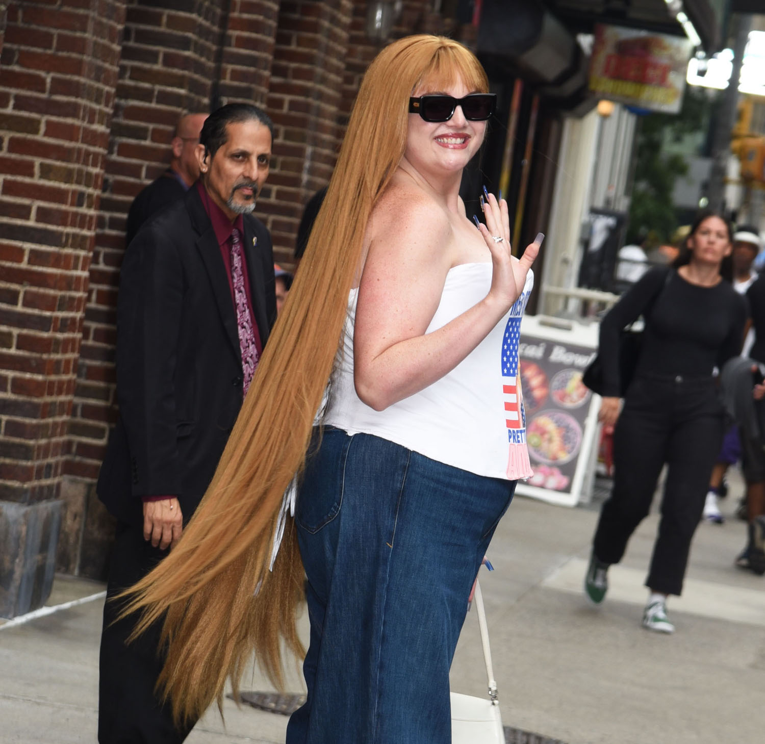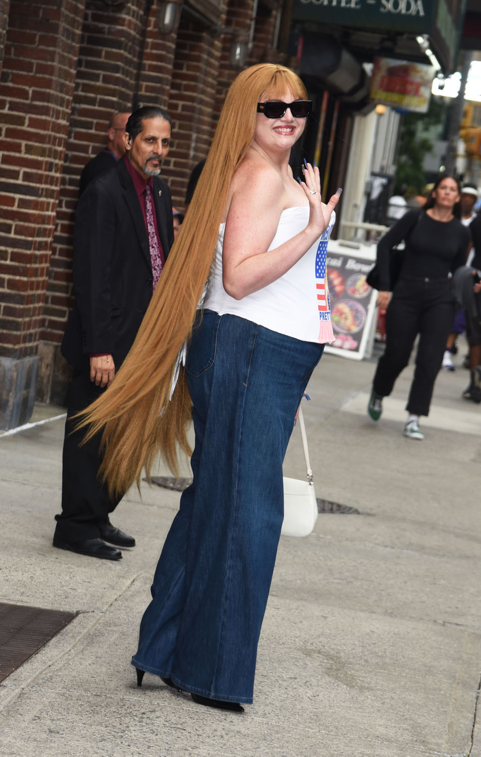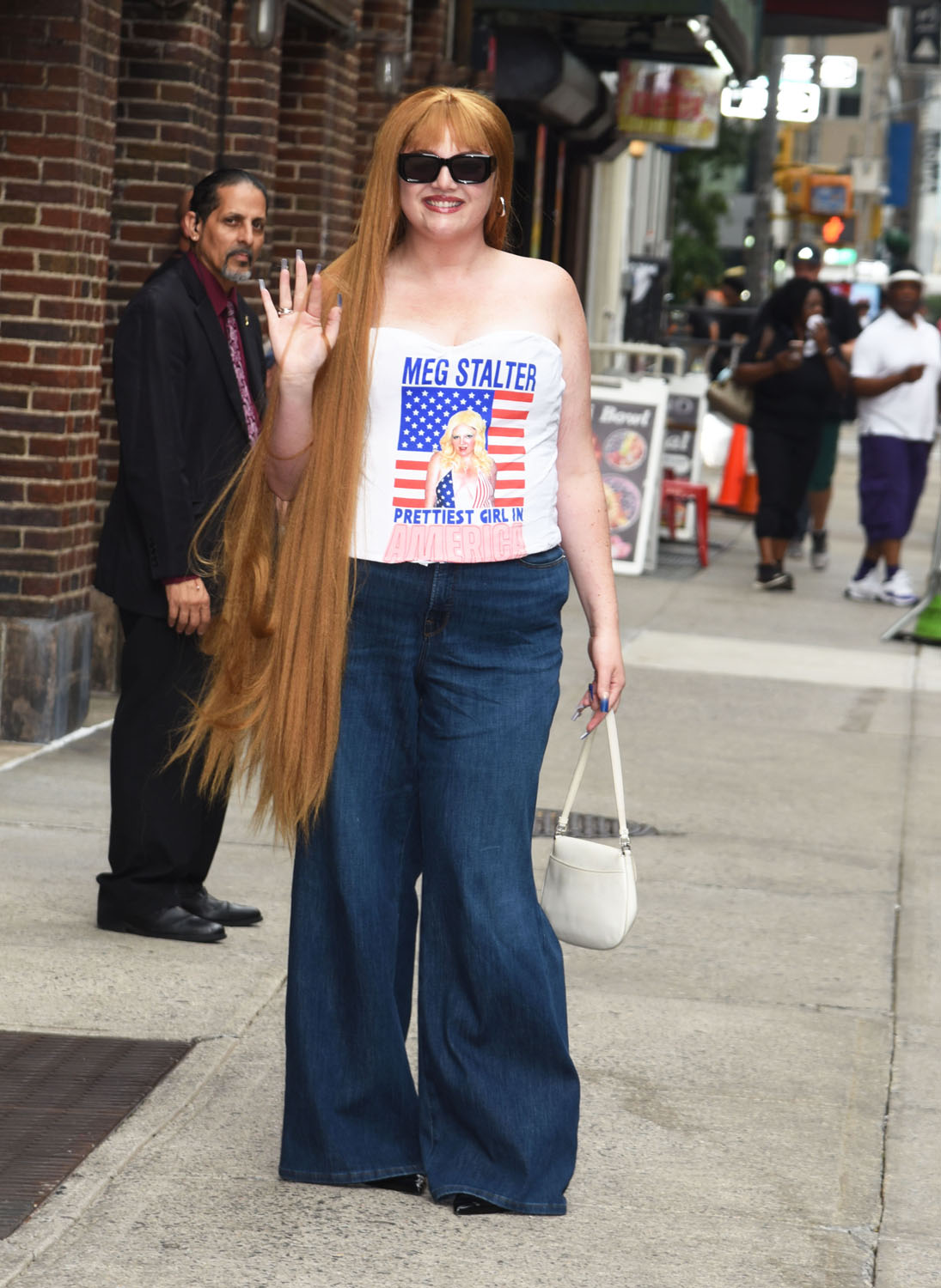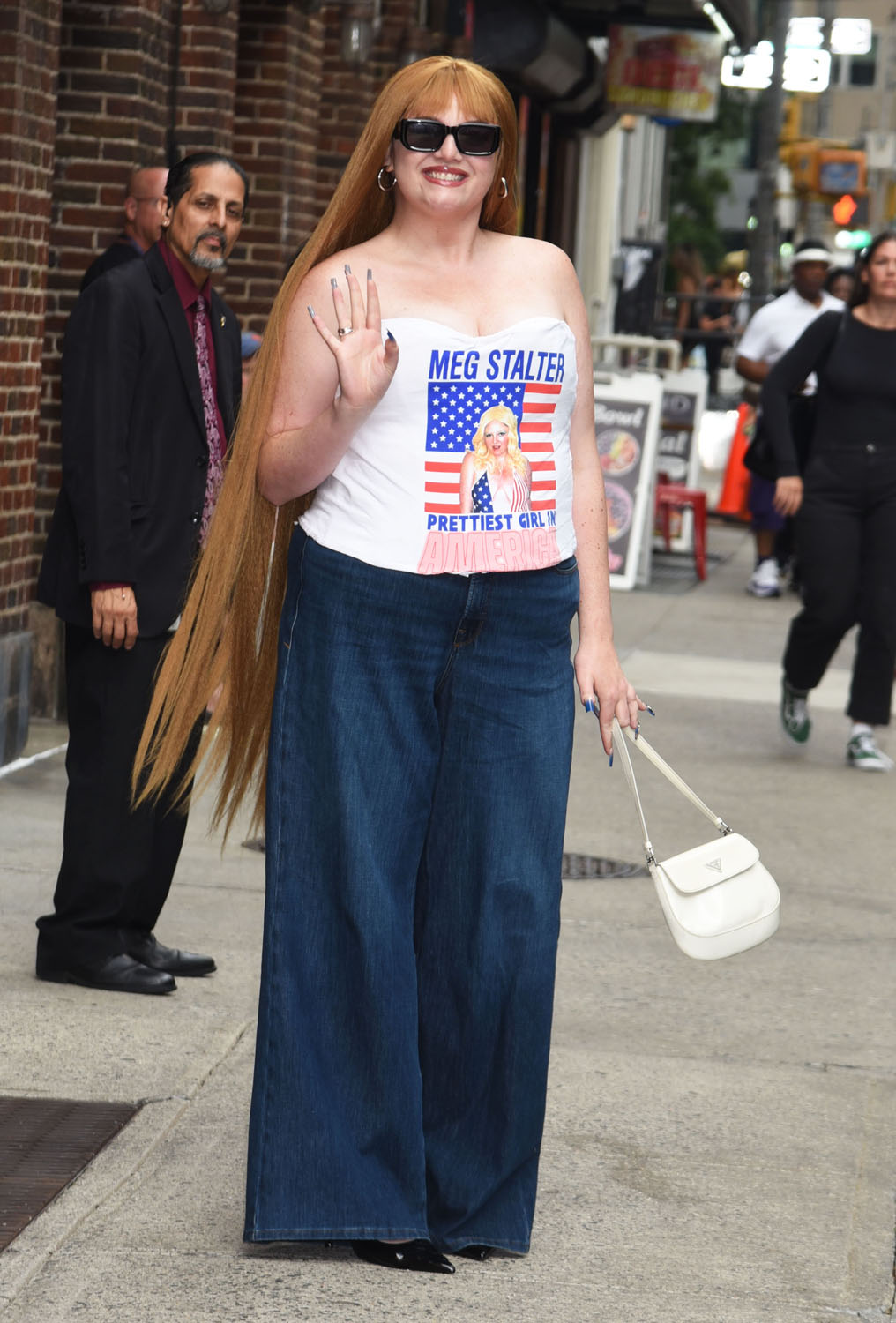 Which brings us to yesterday – Meg in jeans and a tank with her face on it and a long ass banged ginger wig, because why not. It’s all about her right now. She is the star, she is the lead, number one on the call sheet, and it’s her first promotional opportunity in this position. So she’s playing hard with the style, going through as many pieces of clothing and hair options as possible. And, most importantly, having the best time.