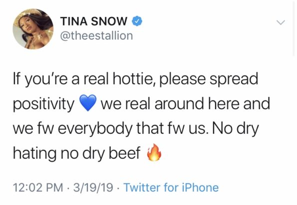 In 2019, when rumours swirled that Cardi B was taking a jab at Meg, she put an immediate stop to the online chatter, tweeting, “If you’re a real hottie, please spread positivity 💙 we real around here and we fw everybody that fw us. No dry hating no dry beef 🔥.”