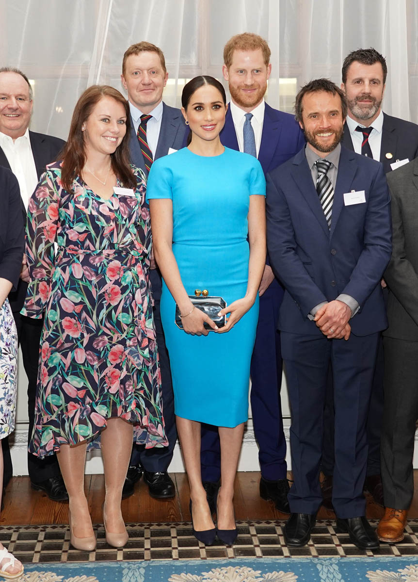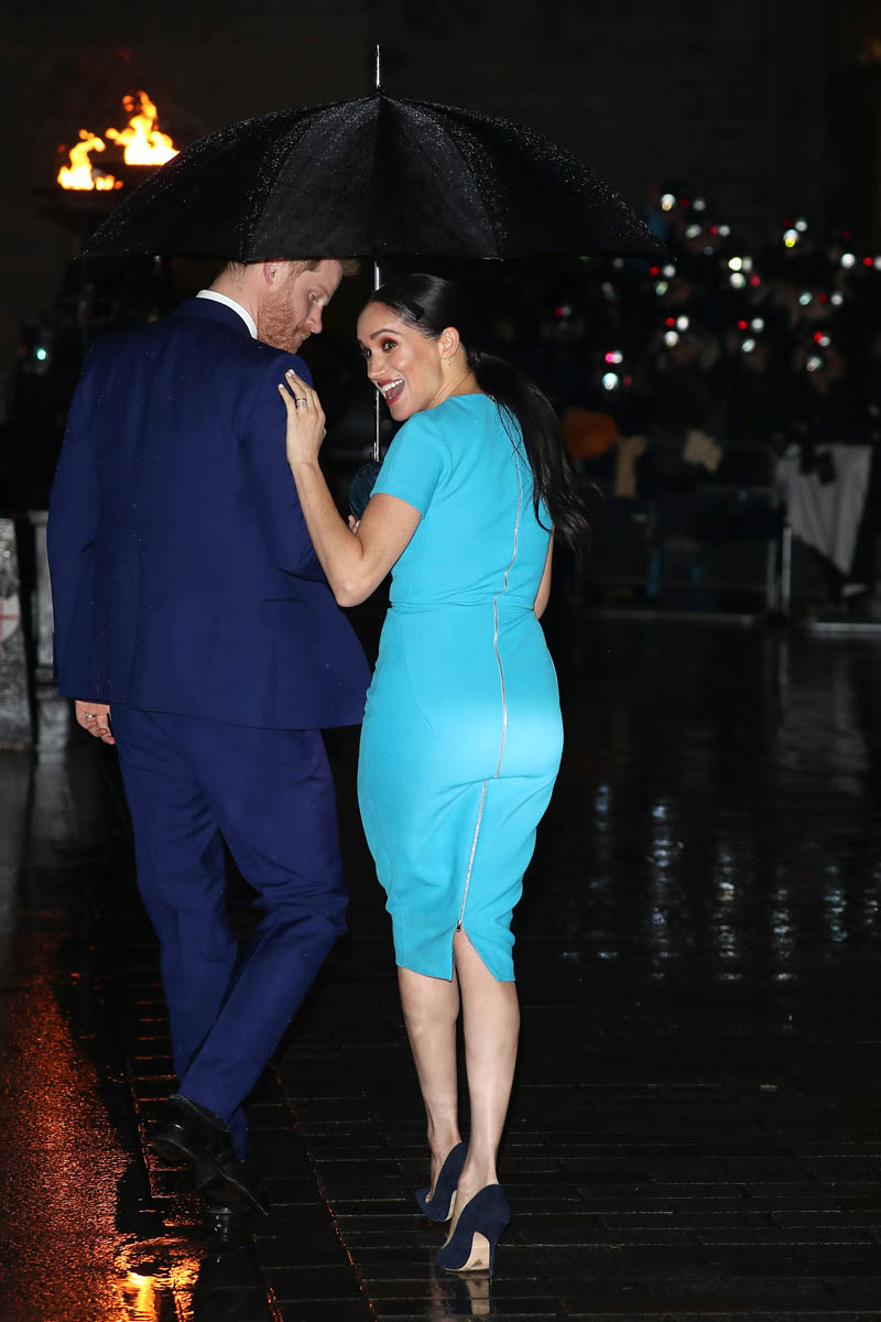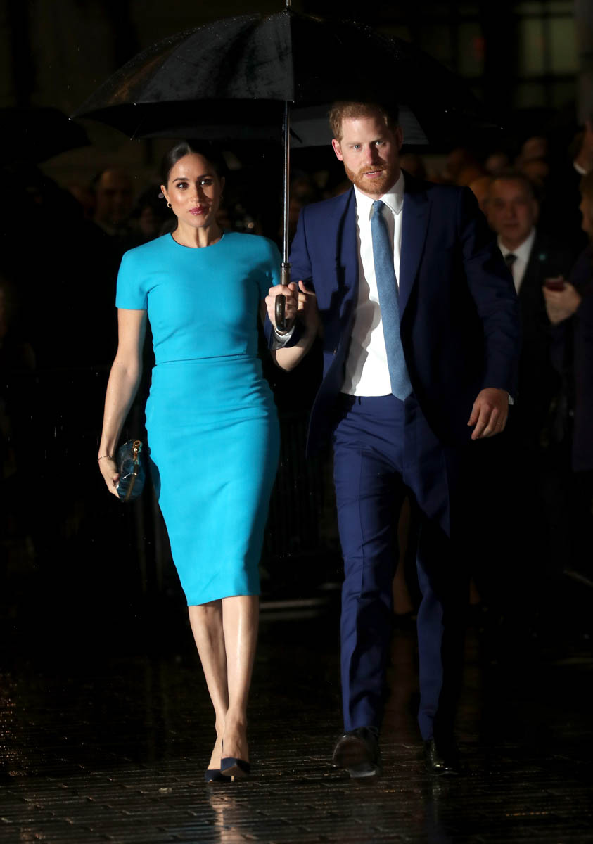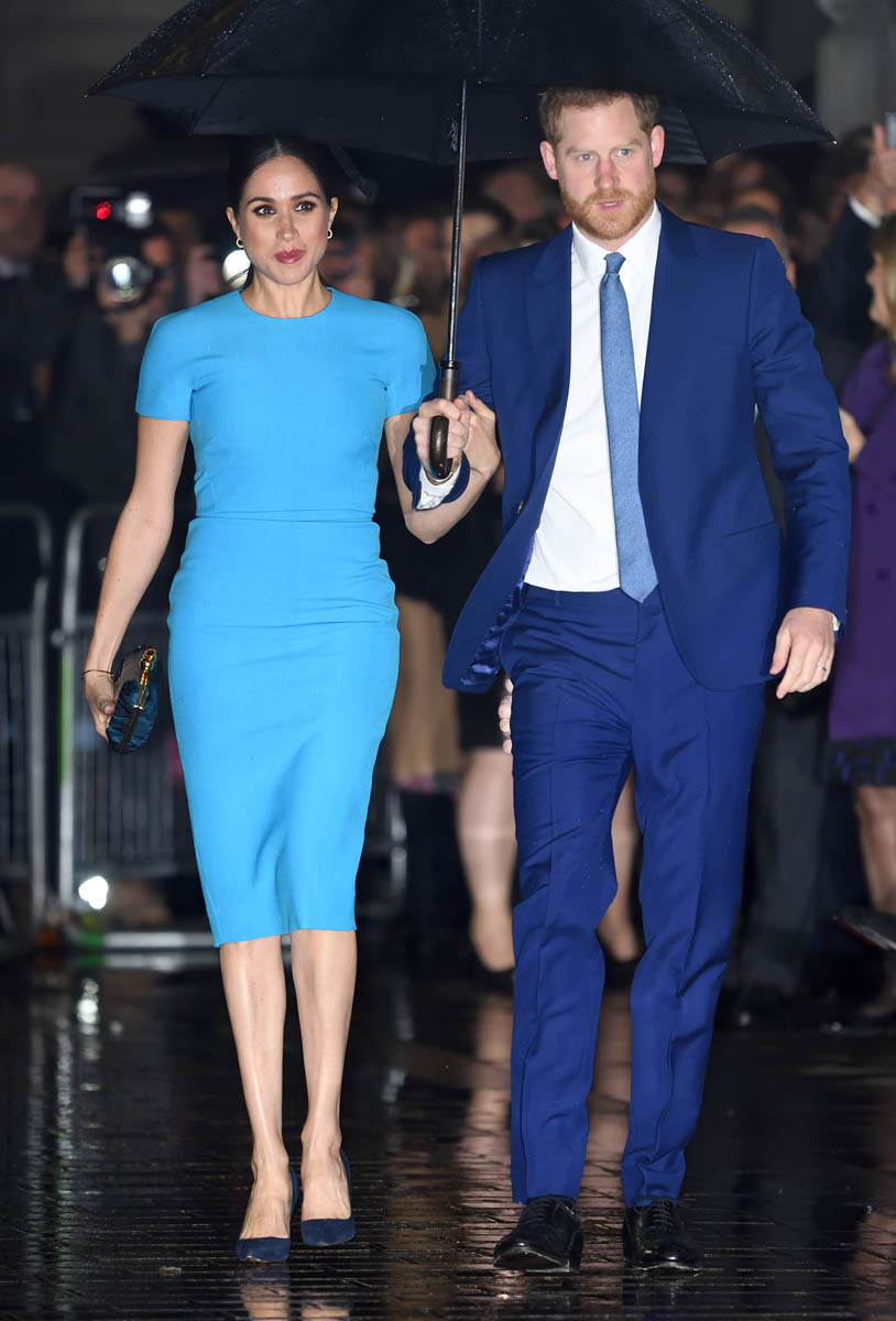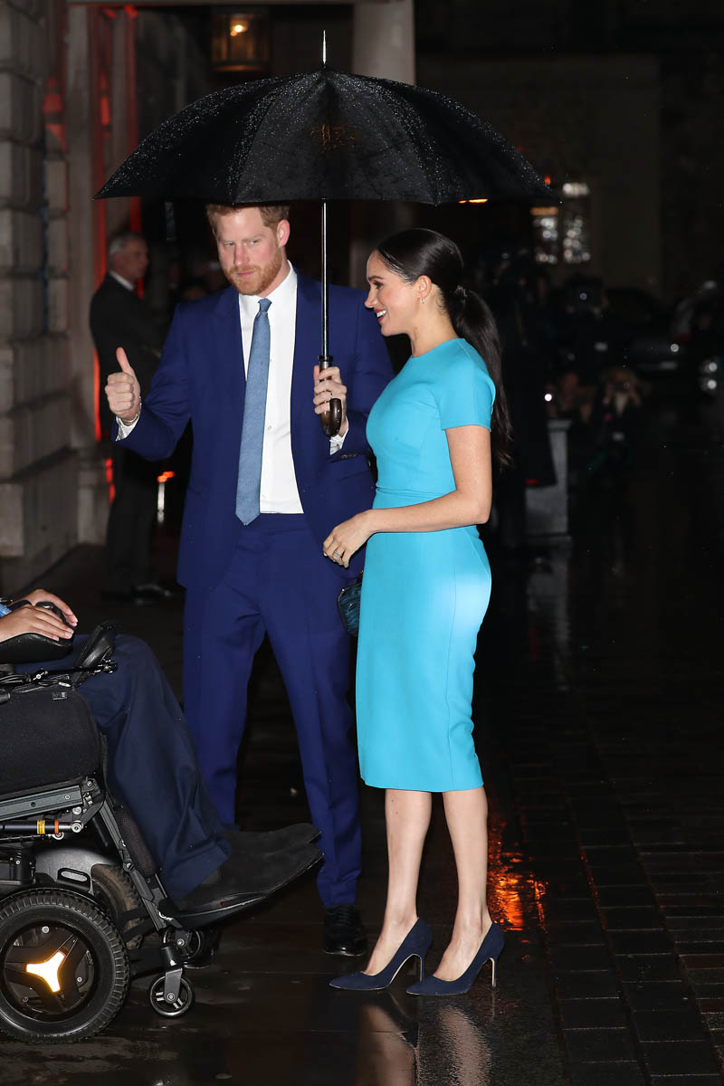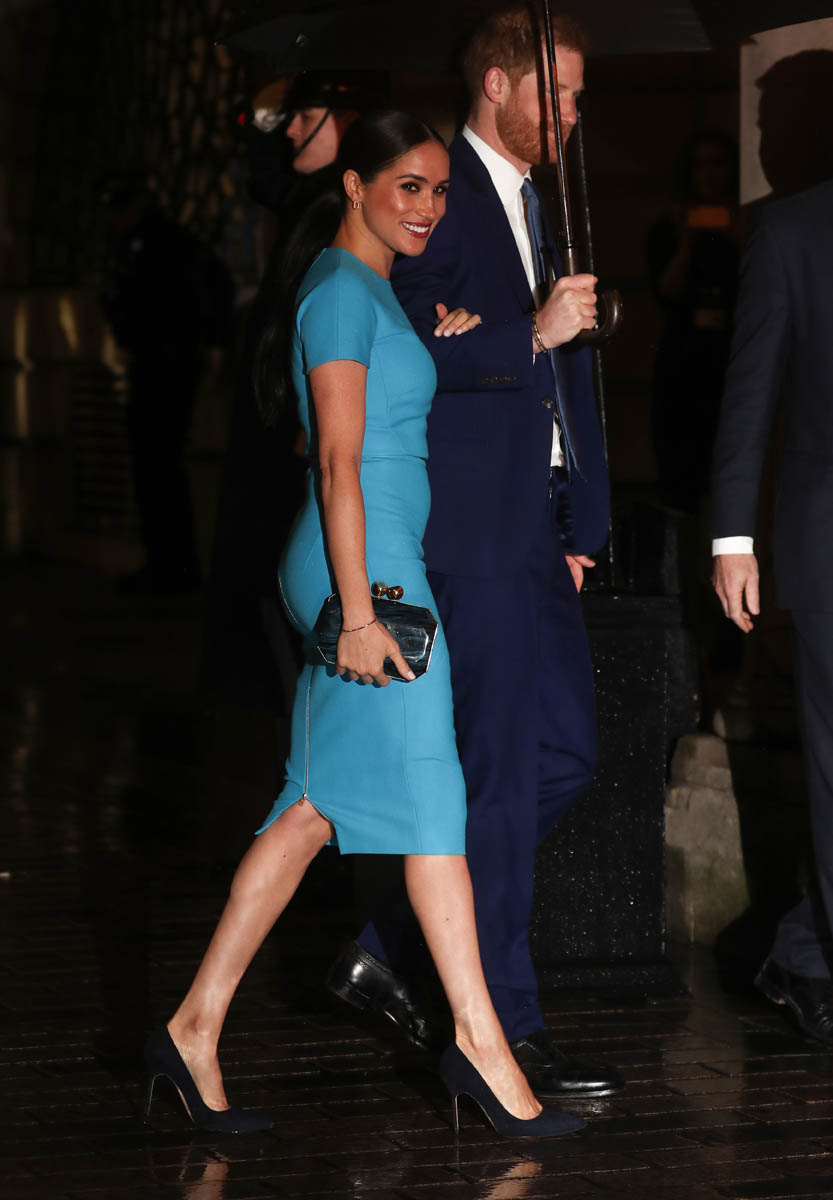 Both are wearing blue. Blue is the colour of House Sussex. They made that clear the moment they launched their Instagram account. Meghan is in a fitted Victoria Beckham dress, a classic cut. The design is safe, unimpeachable, but also, it’s fitted. Nothing is billowing. There is no draping. It’s not skin tight but it’s tight enough to show what she needs to show: that she’s in fighting form, top form.