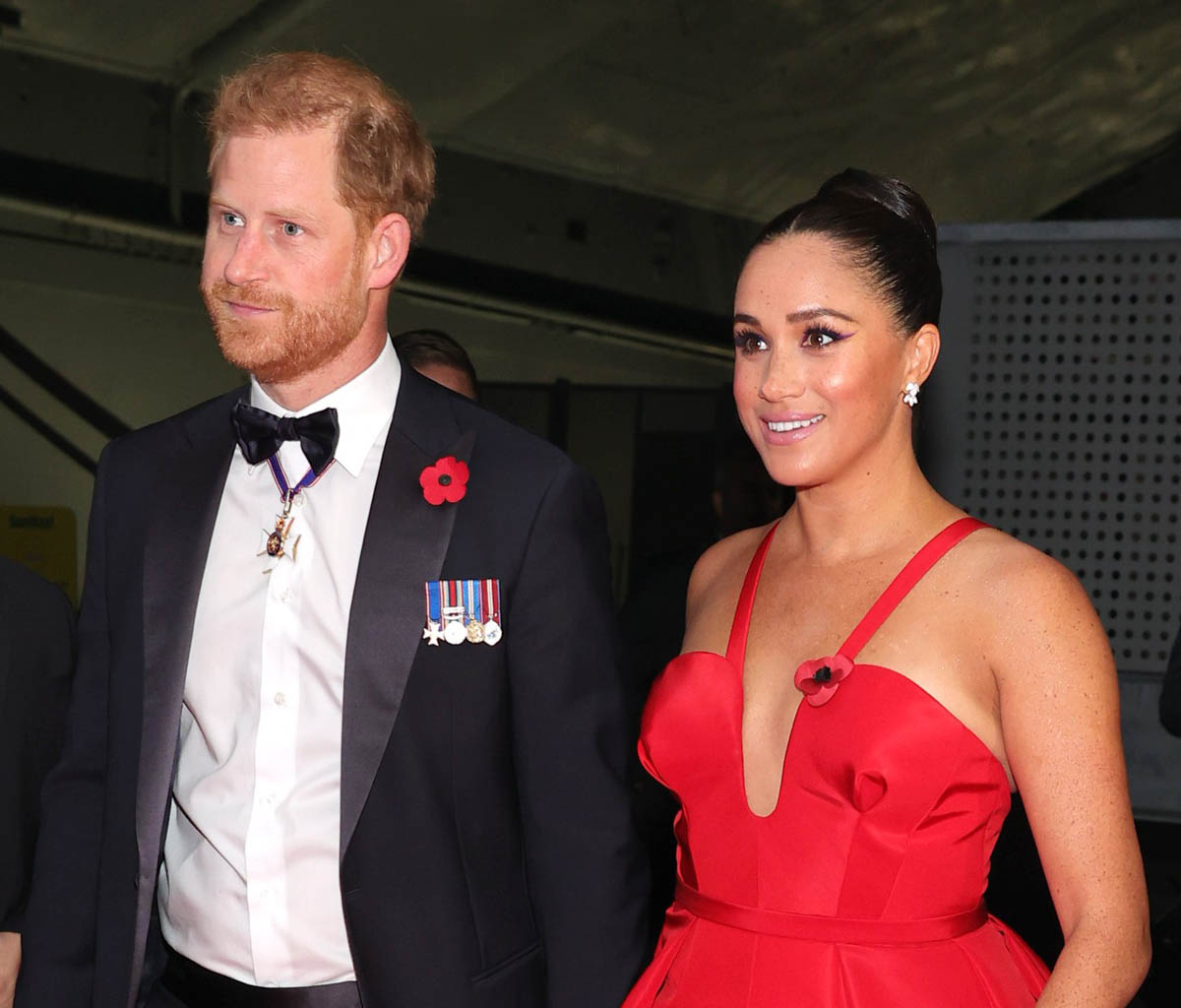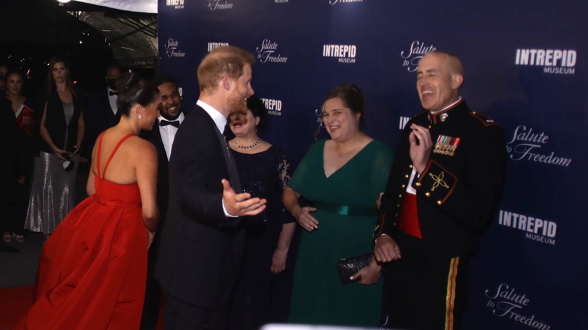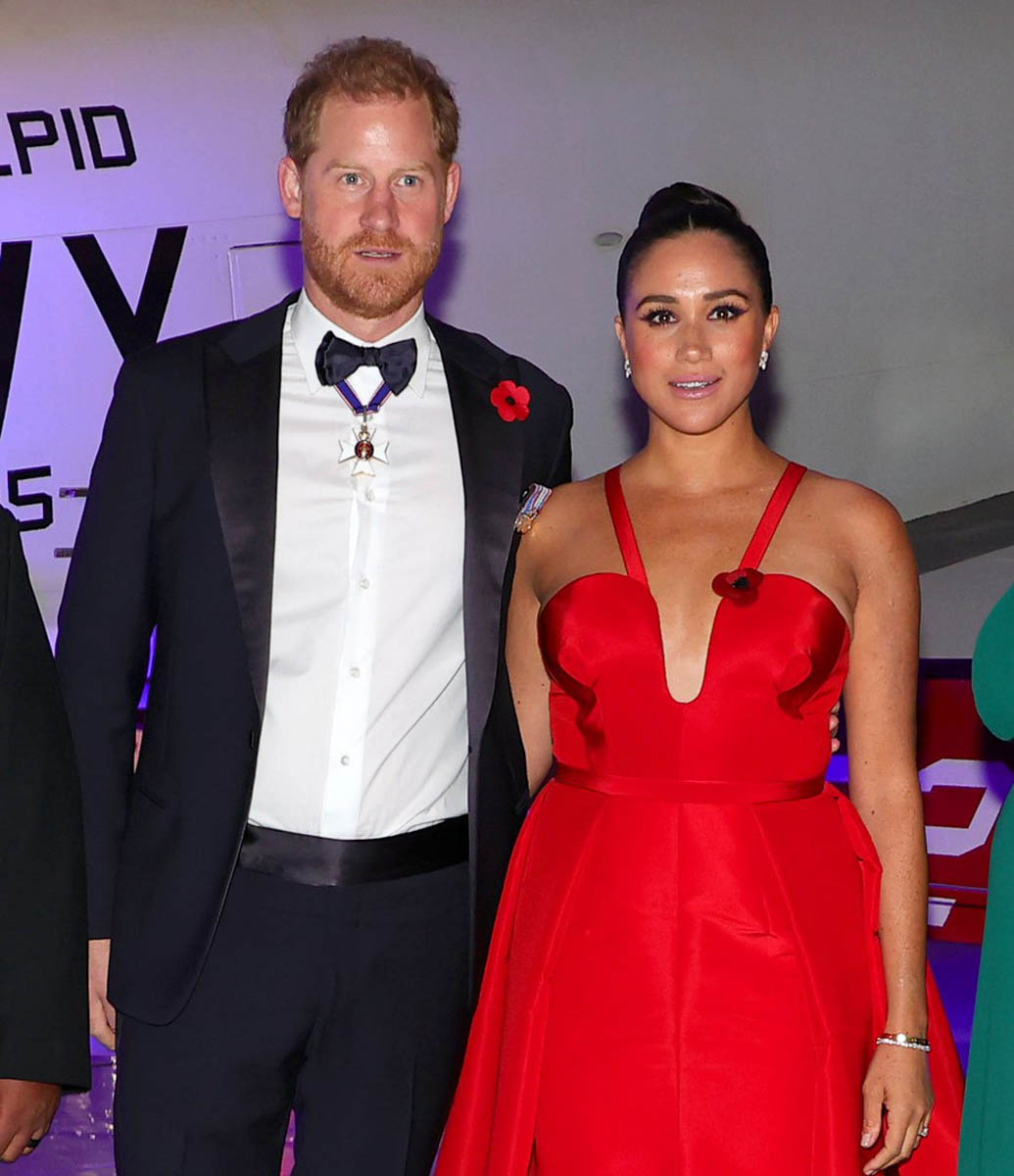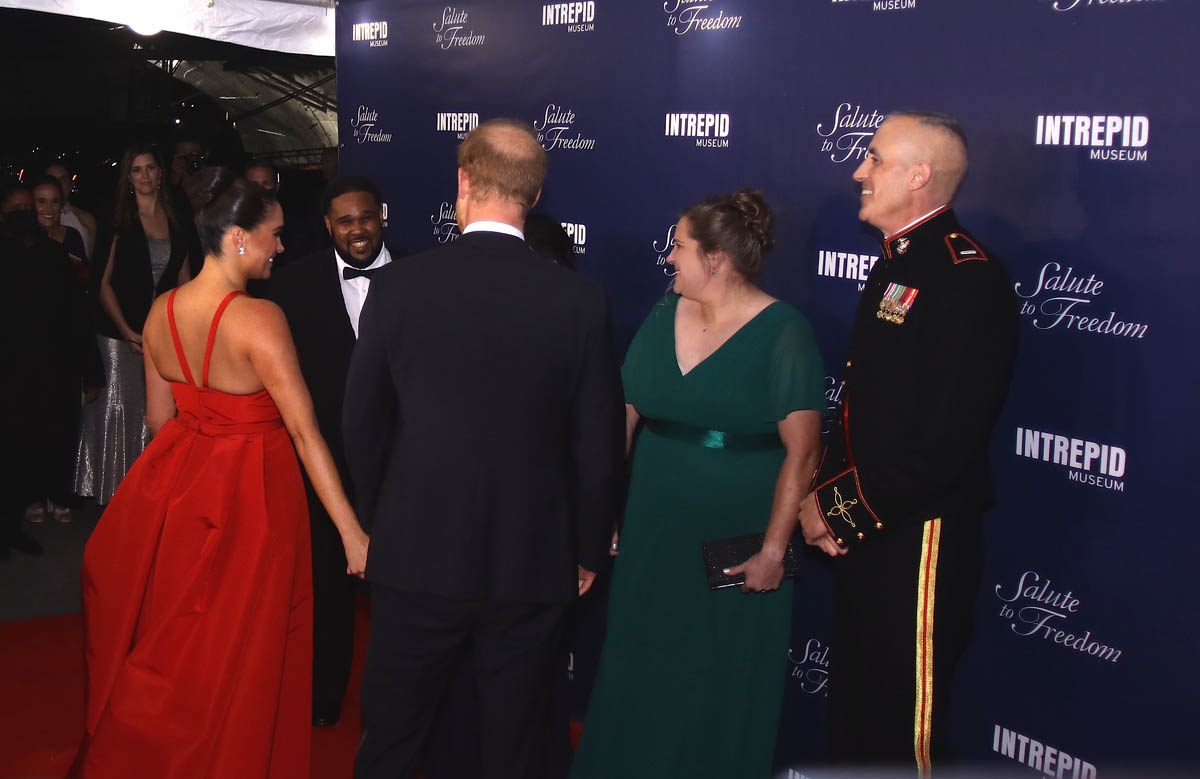 When I saw these shots of Prince Harry and Meghan Markle at the Intrepid Air & Space Museum Salute to Freedom Gala in New York on Wednesday night ahead of Remembrance Day, Veterans Day in the United States, I wondered if she was taking a page from her mother-in-law Princess Diana’s playbook. The black revenge dress, we all remember it. It’s not exactly…but the red Carolina Herrera is definitely a distraction. Harry and Meghan rarely step out in public, and even more rarely at black tie events. This was their first red carpet in over a year and on an occasion that has special significance for Harry, given he, too, is a veteran, and military service and honouring those who have served and are serving is a major priority for him.